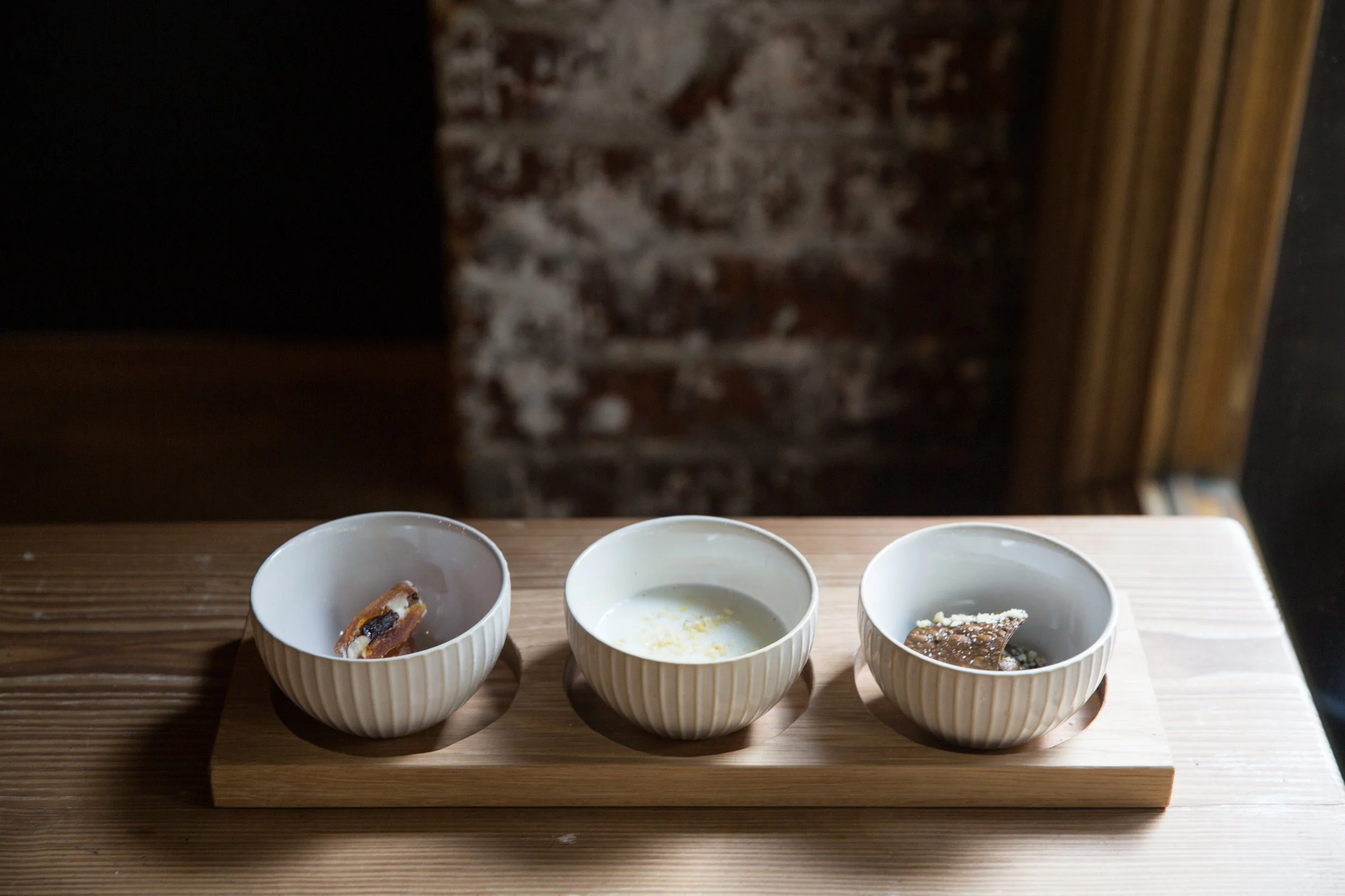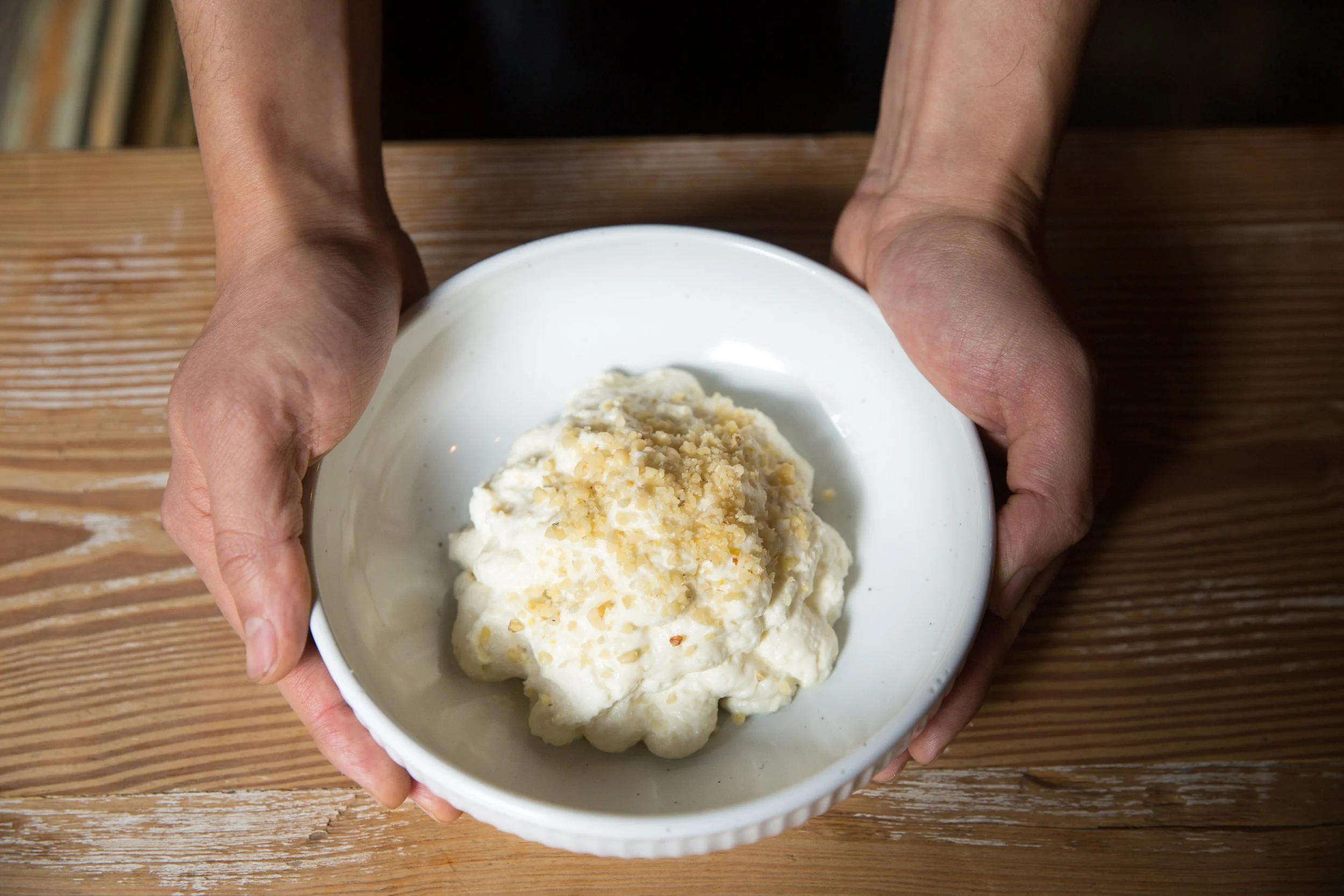 Pine Nut Cream, Asian Pear, Poached Shrimp, and Cucumbers