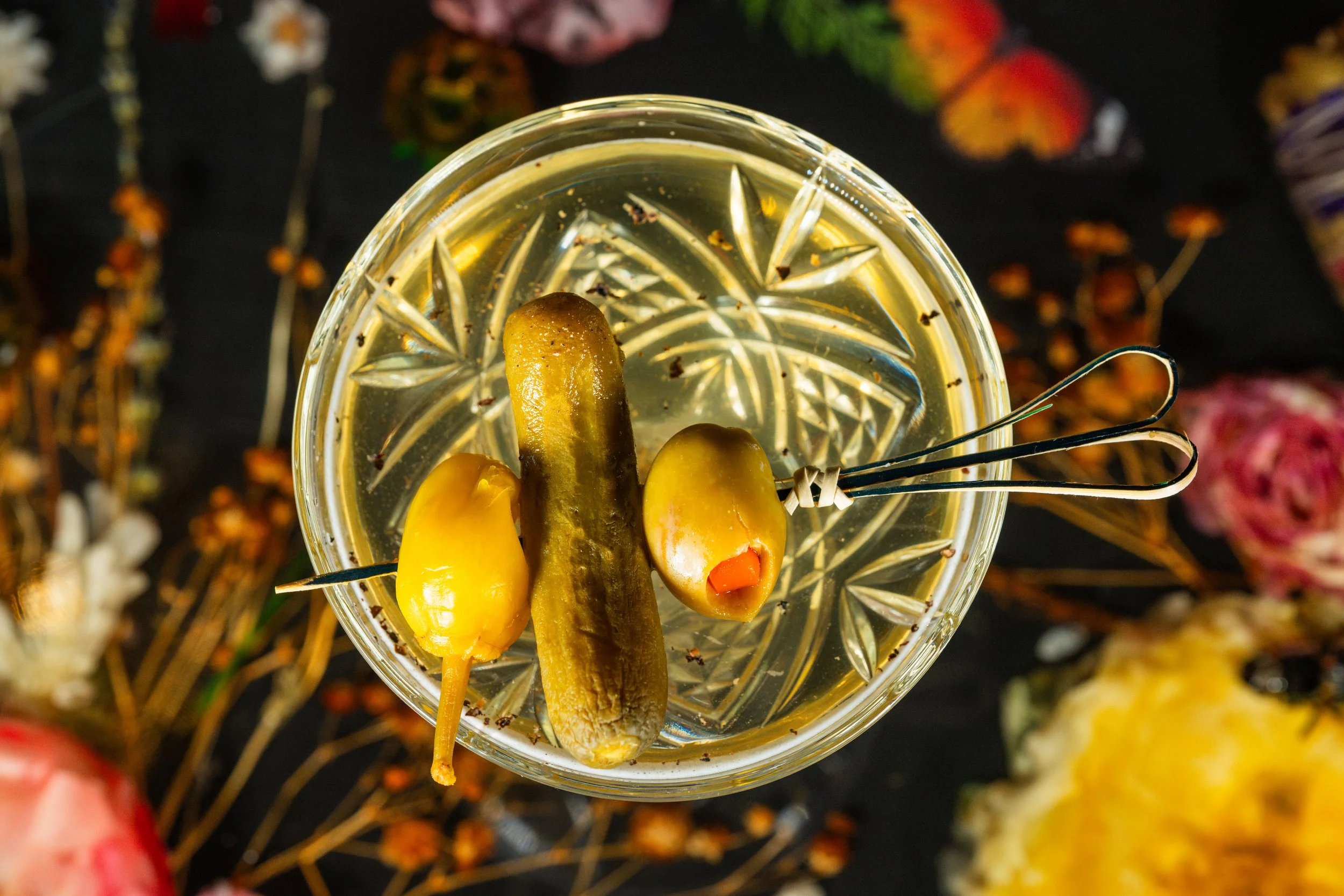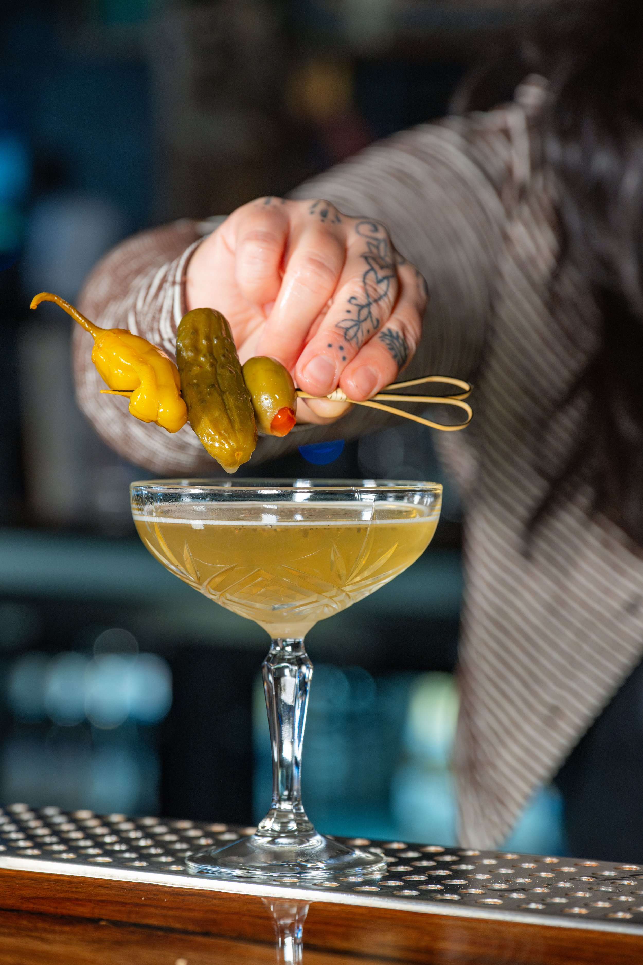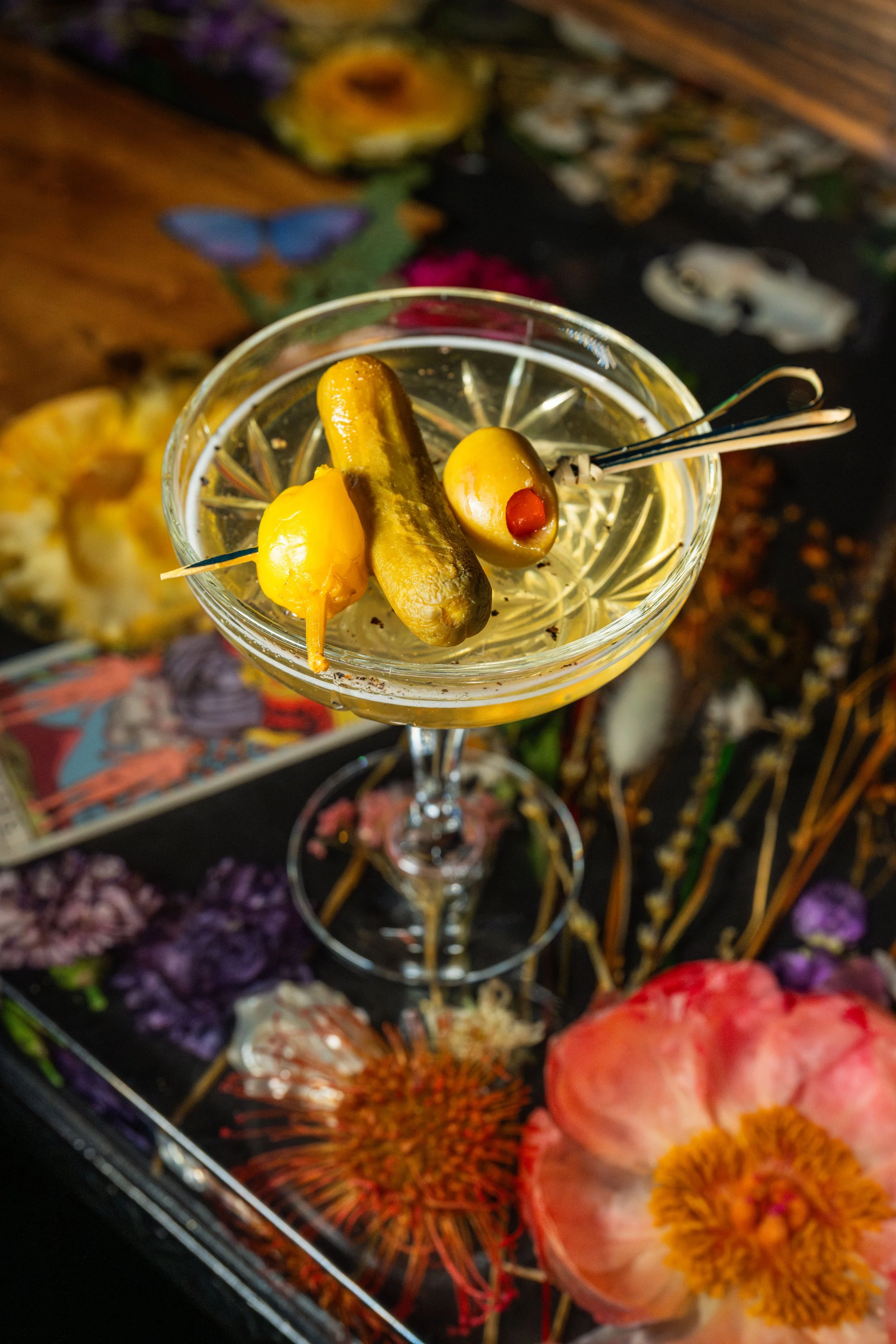 The Creature: Dill-Infused Vodka, Vermouth, Pepperoncini Juice, Olive Brine, Pickle Brine, Olive, Pickle, Pepperoncini, Black Pepper