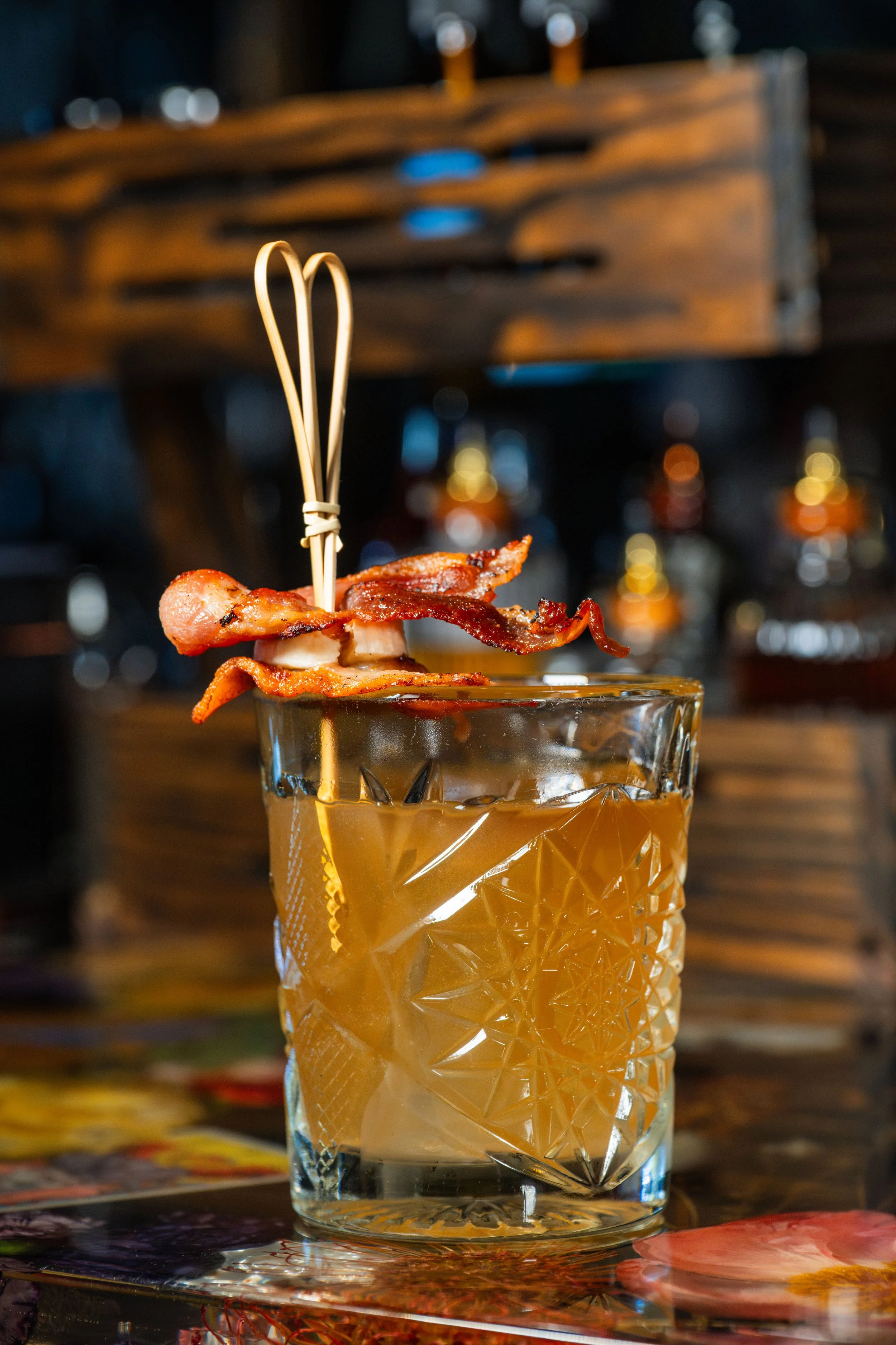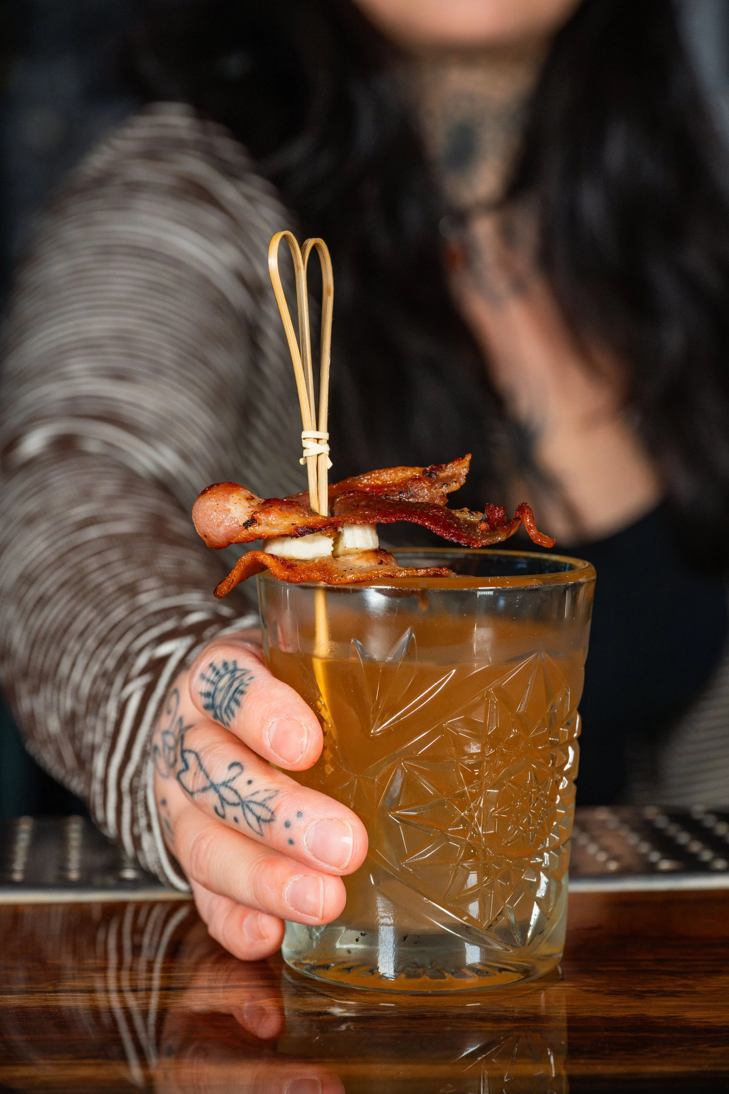 The King’s Crown: Bacon Fat-Washed Whiskey, Banana Liqueur, Peanut Butter Syrup, Walnut Bitters, Bacon, Banana