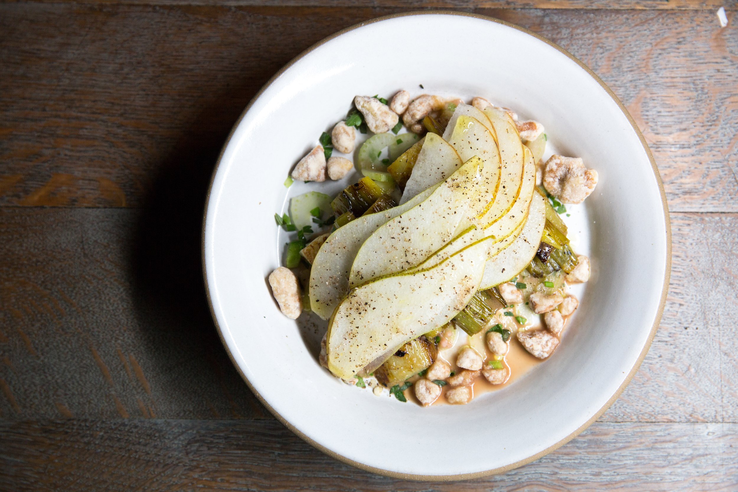 Charred Leeks, Sliced Pears, Yogurt, and Sherry-Shallot Vinaigrette paired with Pinot Gris, Domaine Ostertag, Fronholz, Alsace, 2014