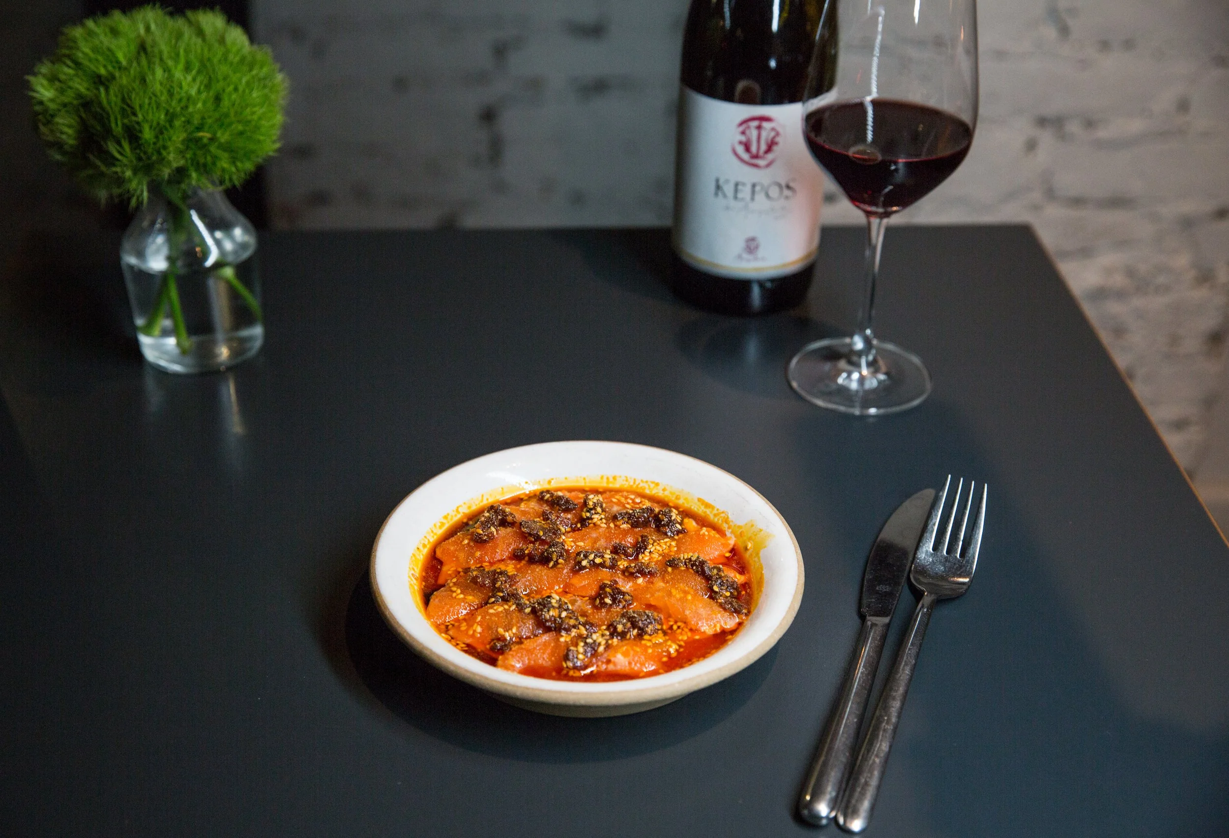 Arctic Char Sashimi, Kohlrabi, Mint, and Sesame-Chile Oil paired with Grenache, Ampeleia, Kepos, Costa Toscana, Italy, 2014