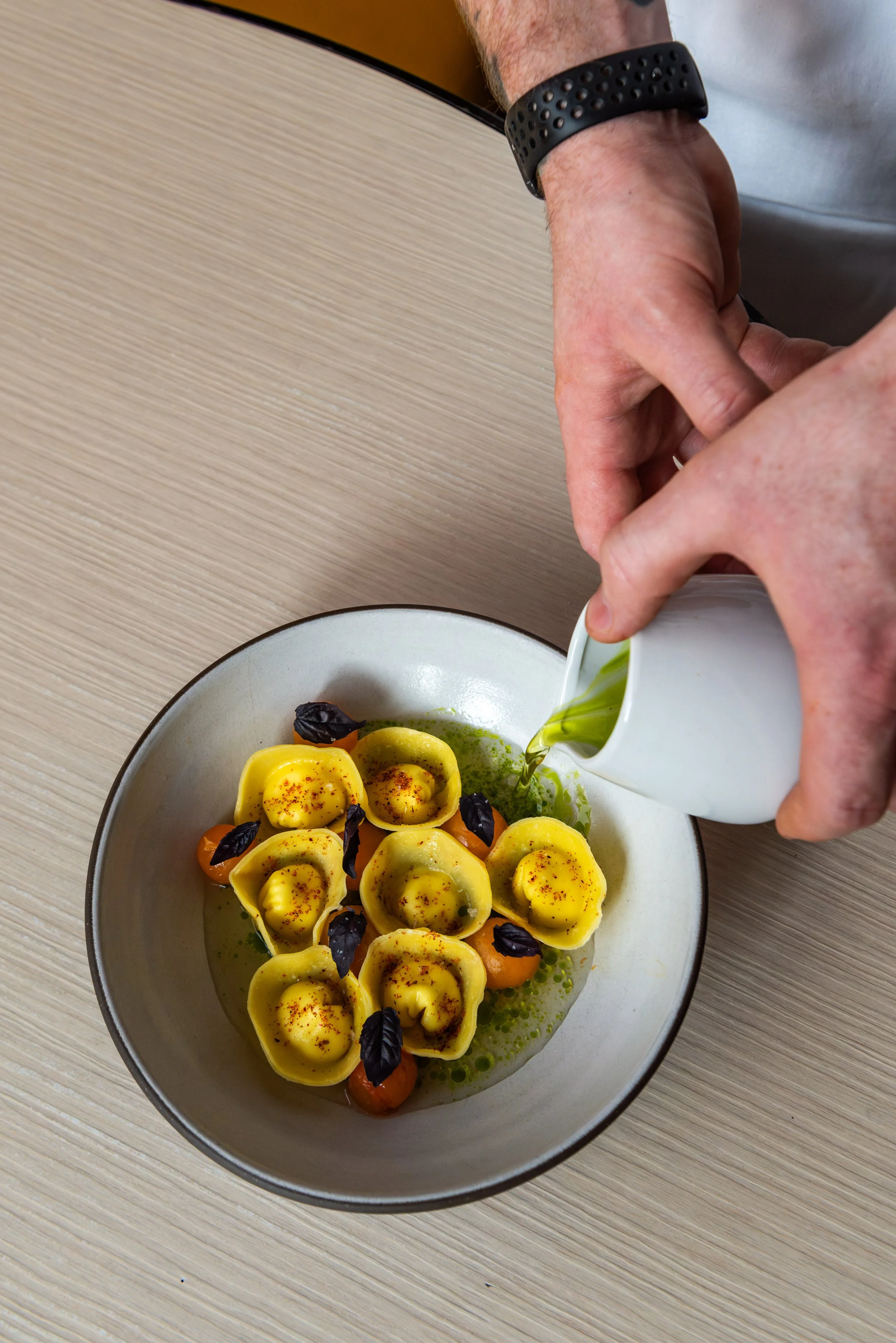 Ricotta Cappelletti, Sun Gold Tomatoes, Clarified Tomato Broth, Lemon Zest, Basil Oil, Tomato-Chile Powder