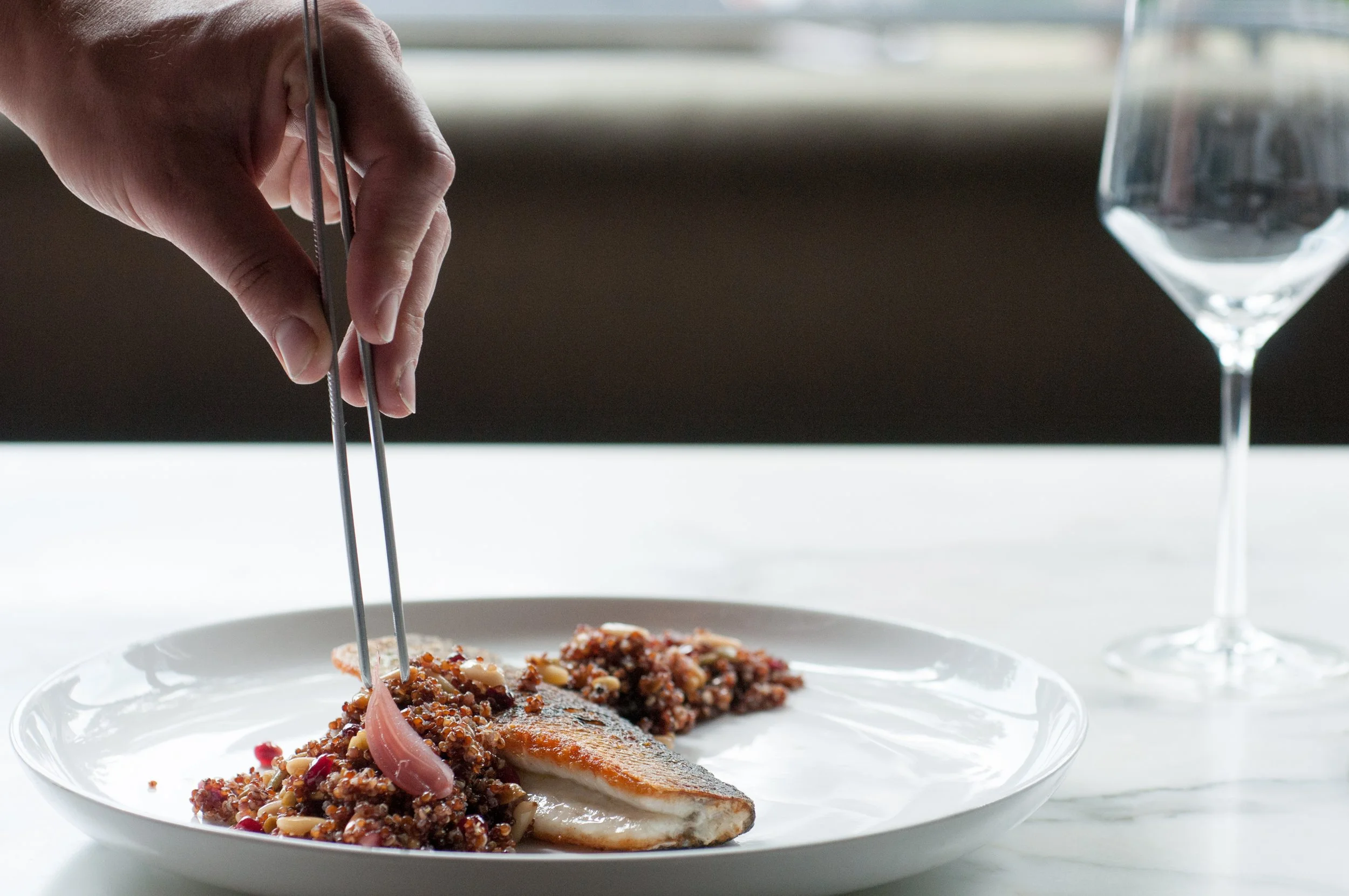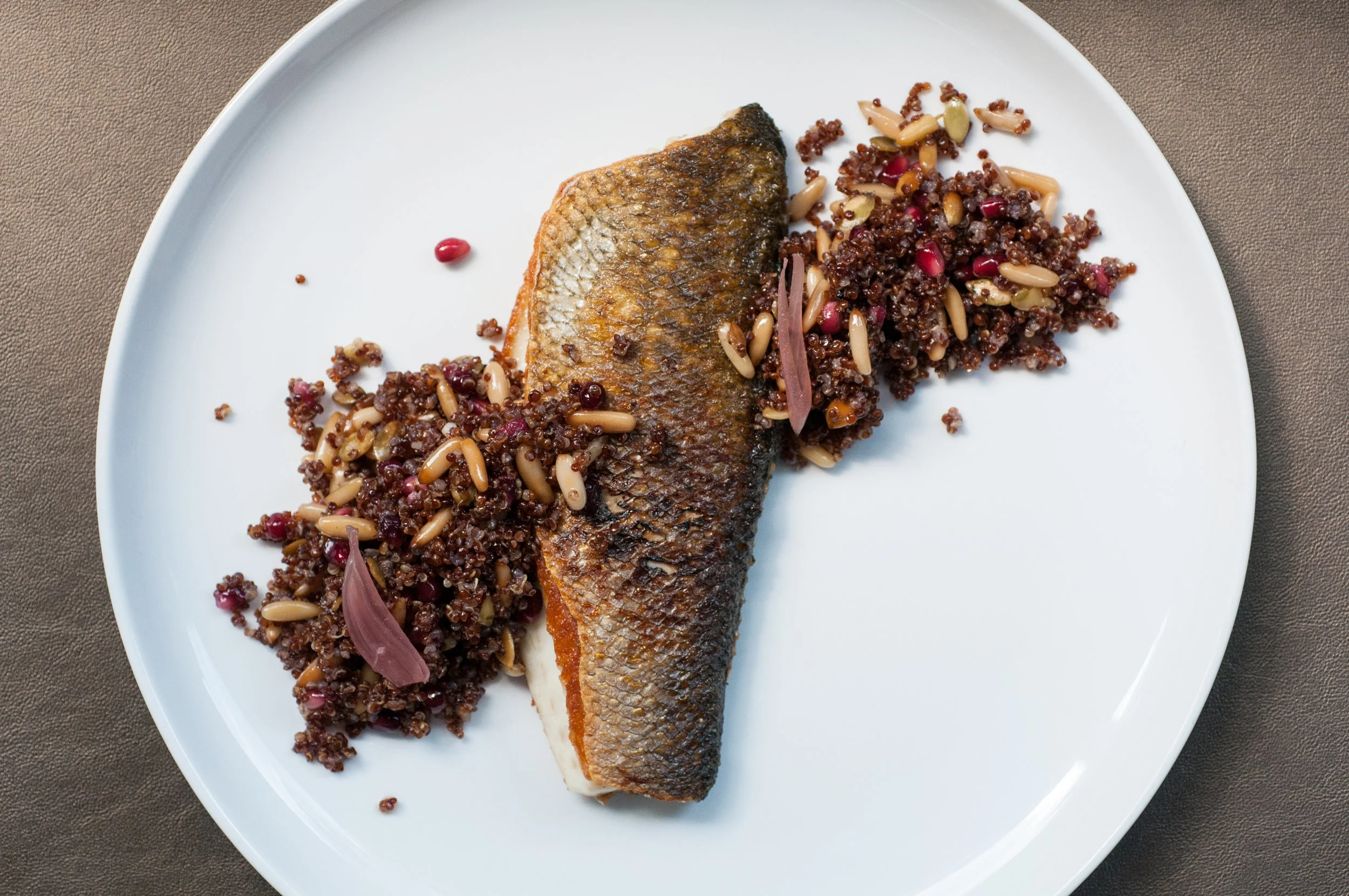 Branzino, Red Quinoa, Pine Nuts, Pomegranate Seeds, and Olive Oil