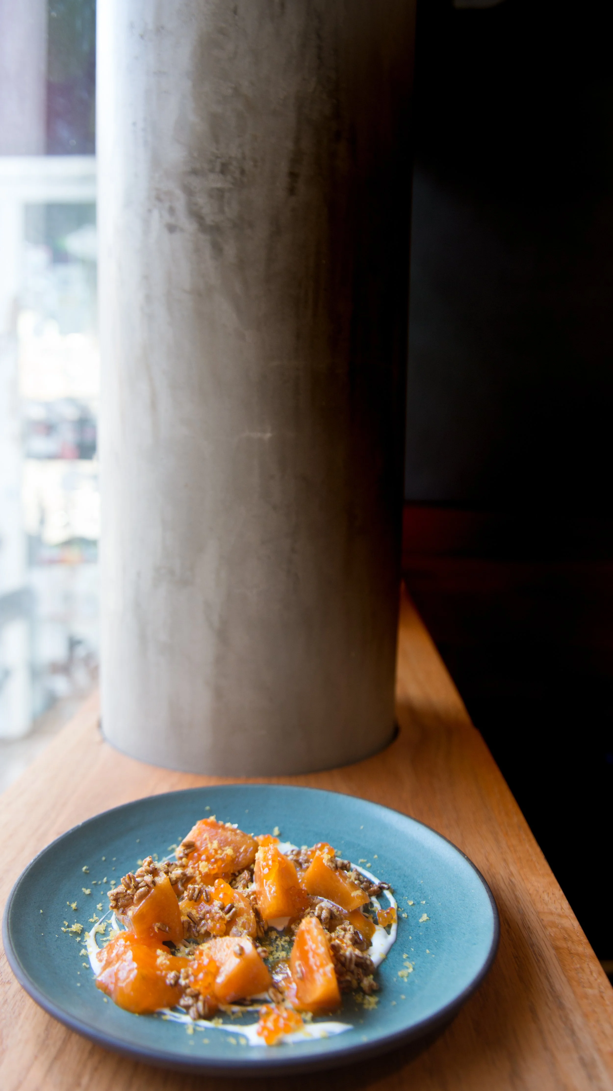 Fugu and Hachiya Persimmons, Crème Fraîche, Puffed Dehydrated Farro, Yuzu Vinegar, Trout Roe, and Shaved Bottarga