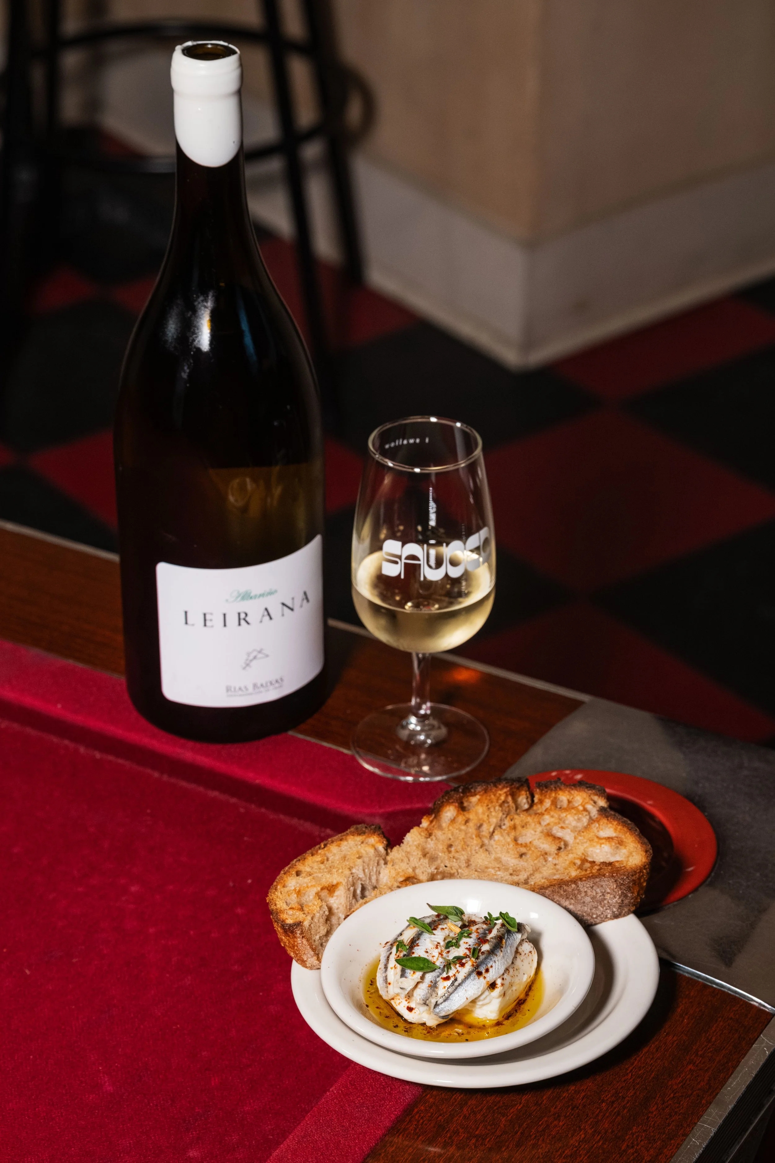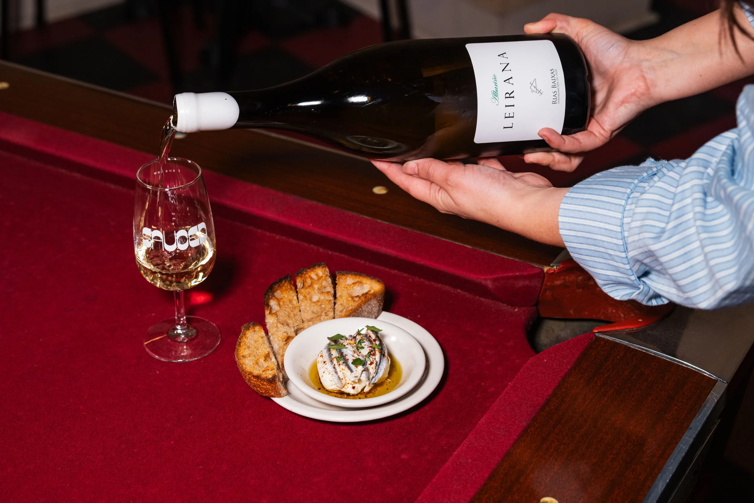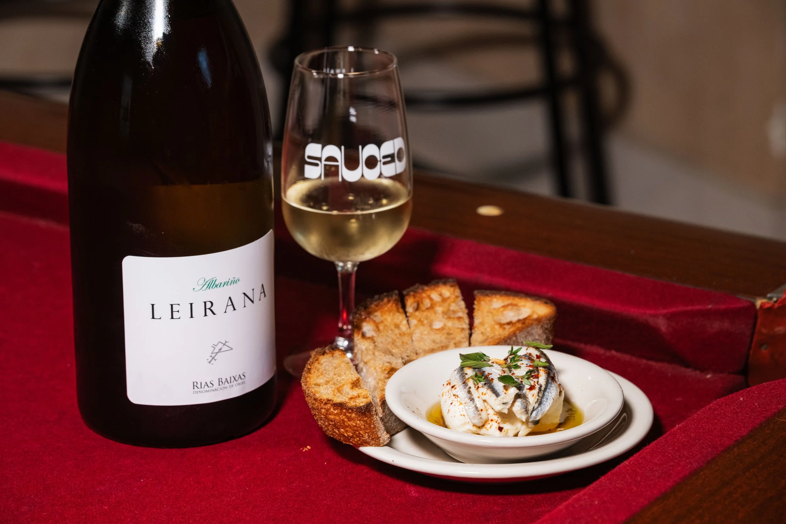 Boquerones, Burrata, Shallots, Oregano, Thyme, Aleppo Pepper, Sumac, Toasted Sourdough paired with Albariño, Bodegas Forjas del Salnes, Leirana Magnum, Rías Baixas, Spain, 2024