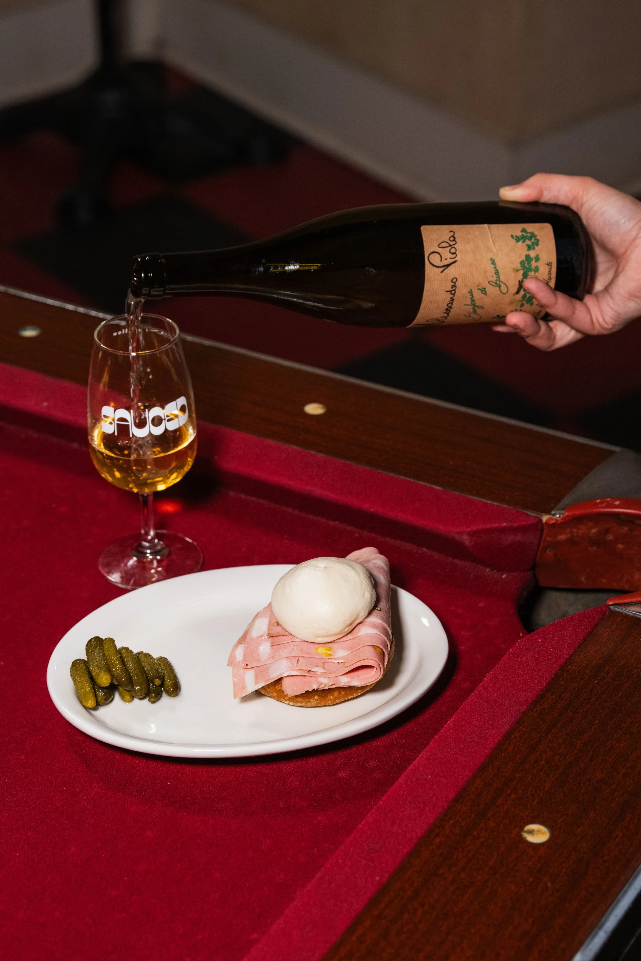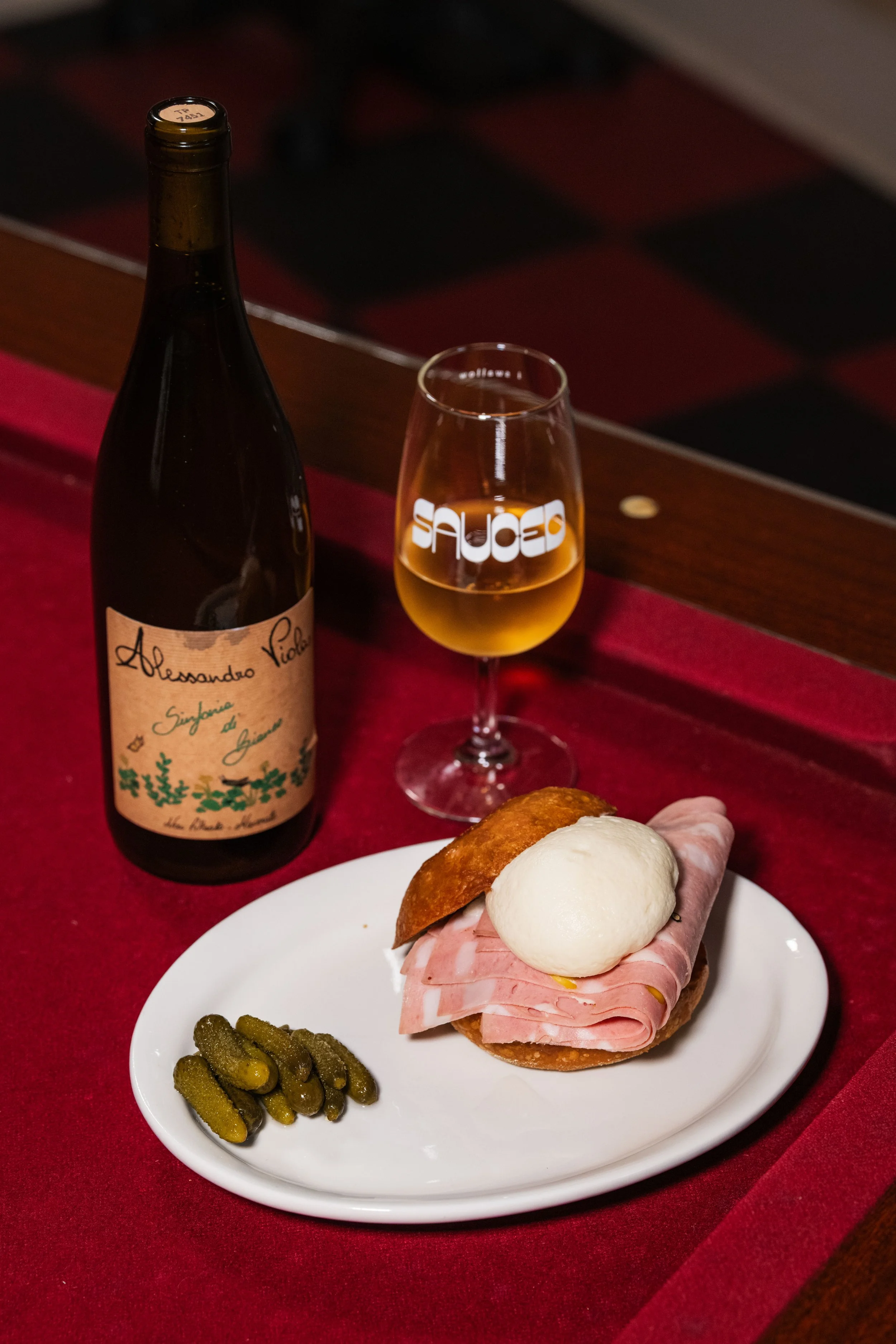 The Uncle Morty: Mortadella, Taleggio Foam, Pistachio Paste, Sweet Potato Bun, Gherkins paired with Grillo, Alessandro Viola, Sinfonia Di Bianco, Sicily, Italy, 2022
