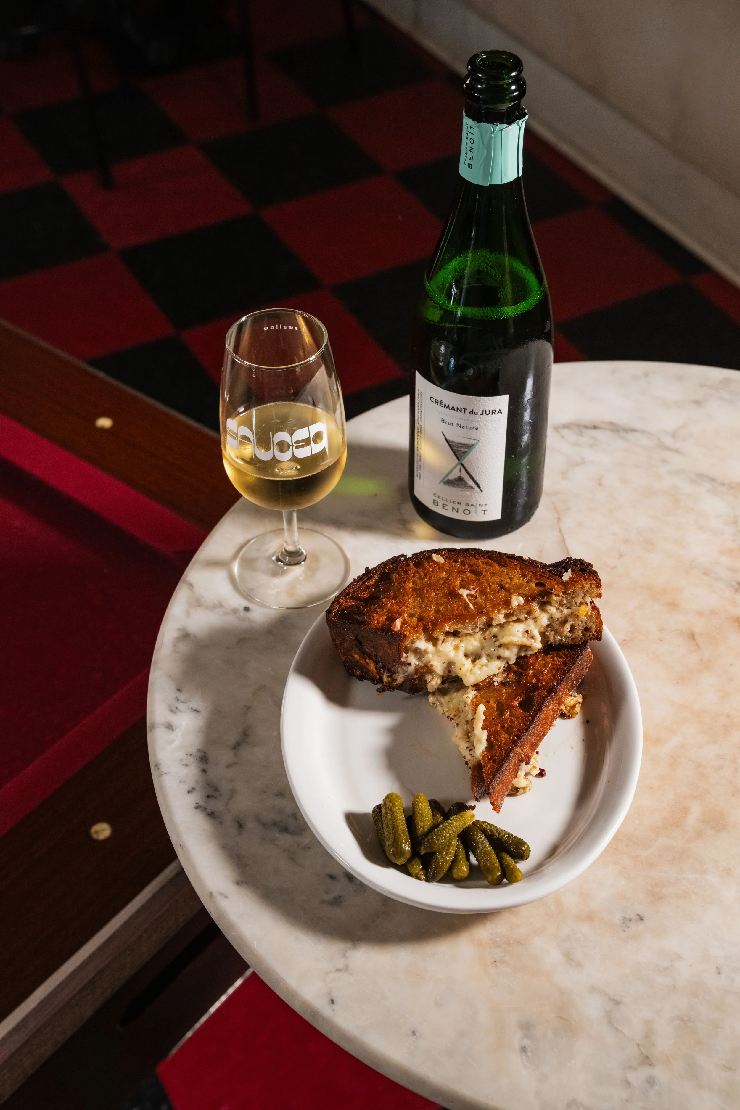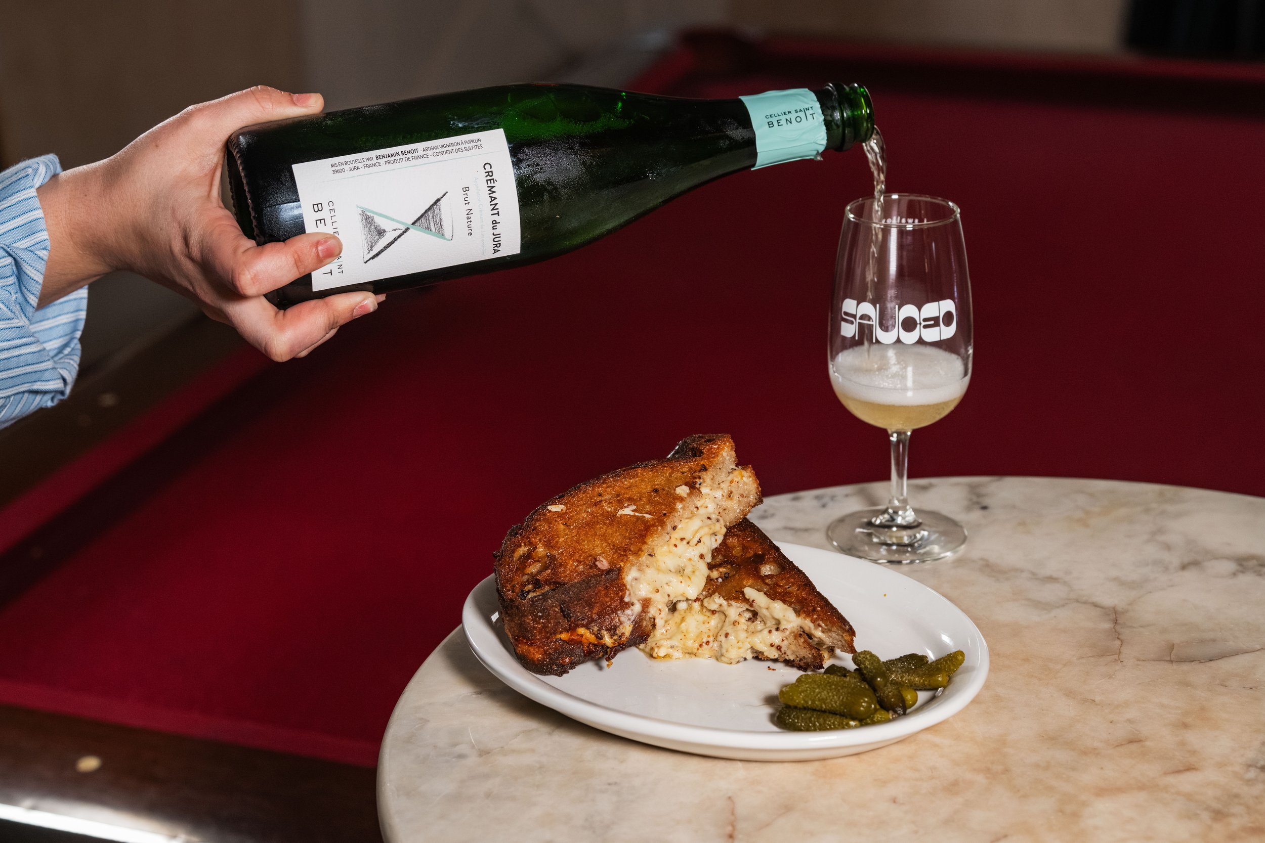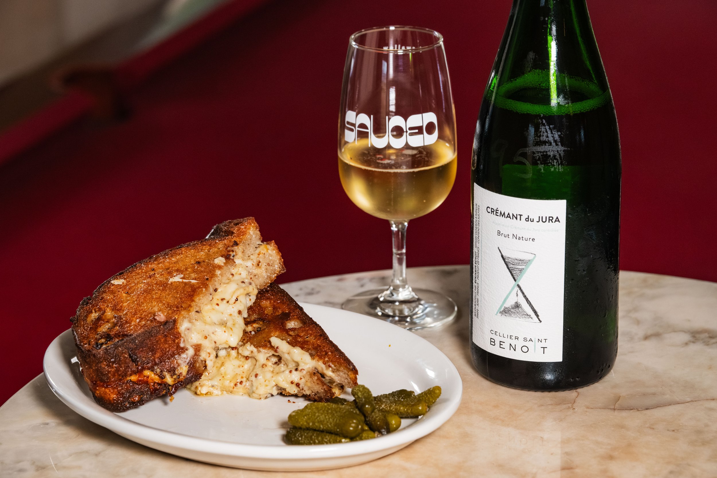 Grilled Cheese: Mozzarella, Asiago, Gorgonzola-Mustard Mayonnaise, Sourdough, Gherkins paired with Chardonnay, Cellier Saint Benoît, Crémant Du Jura Brut Nature, Jura, France, NV