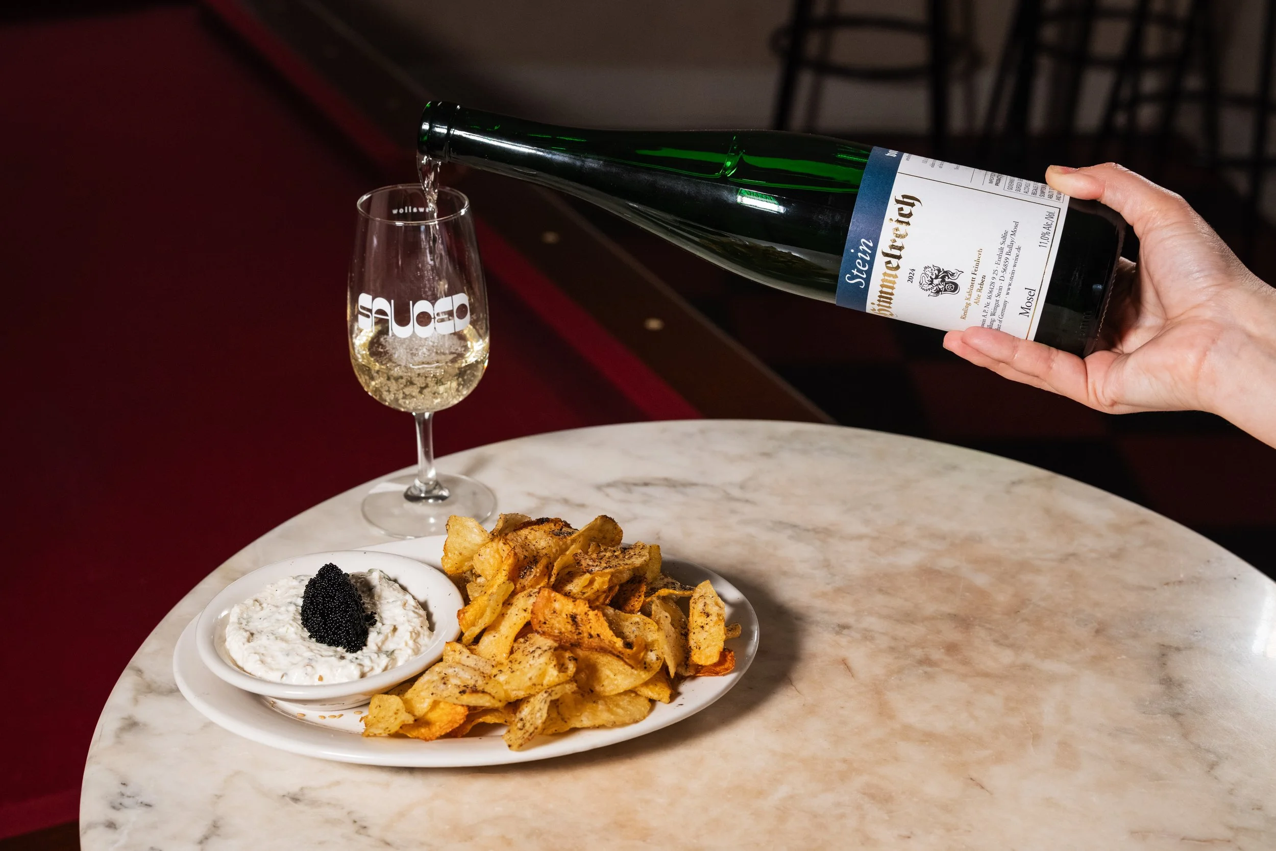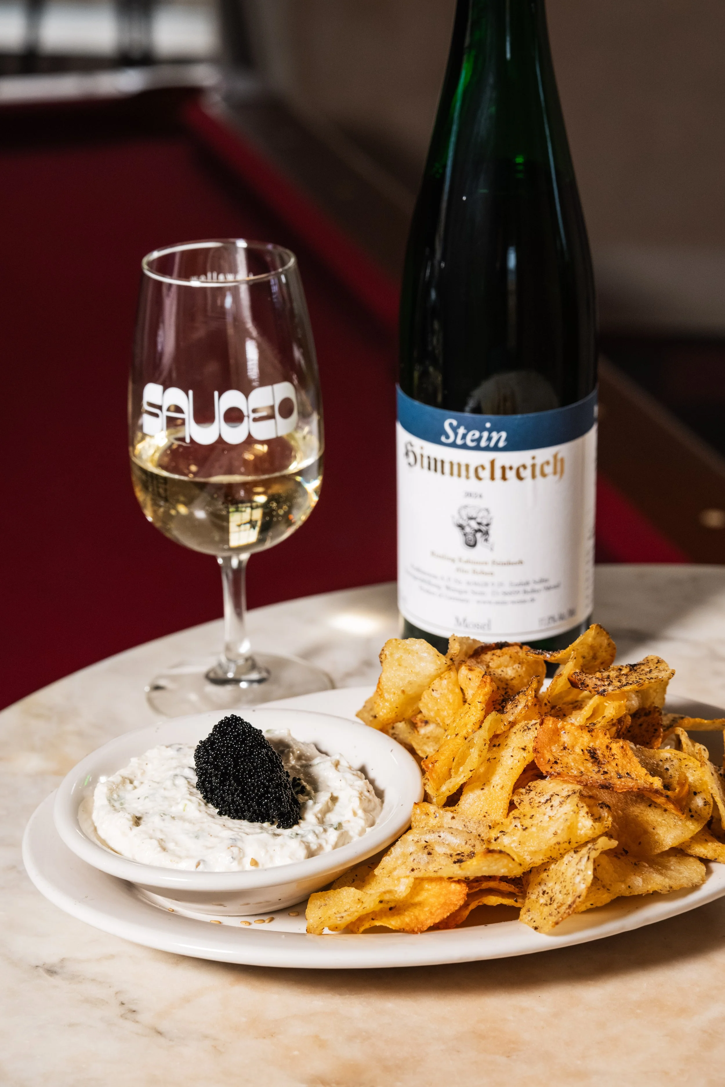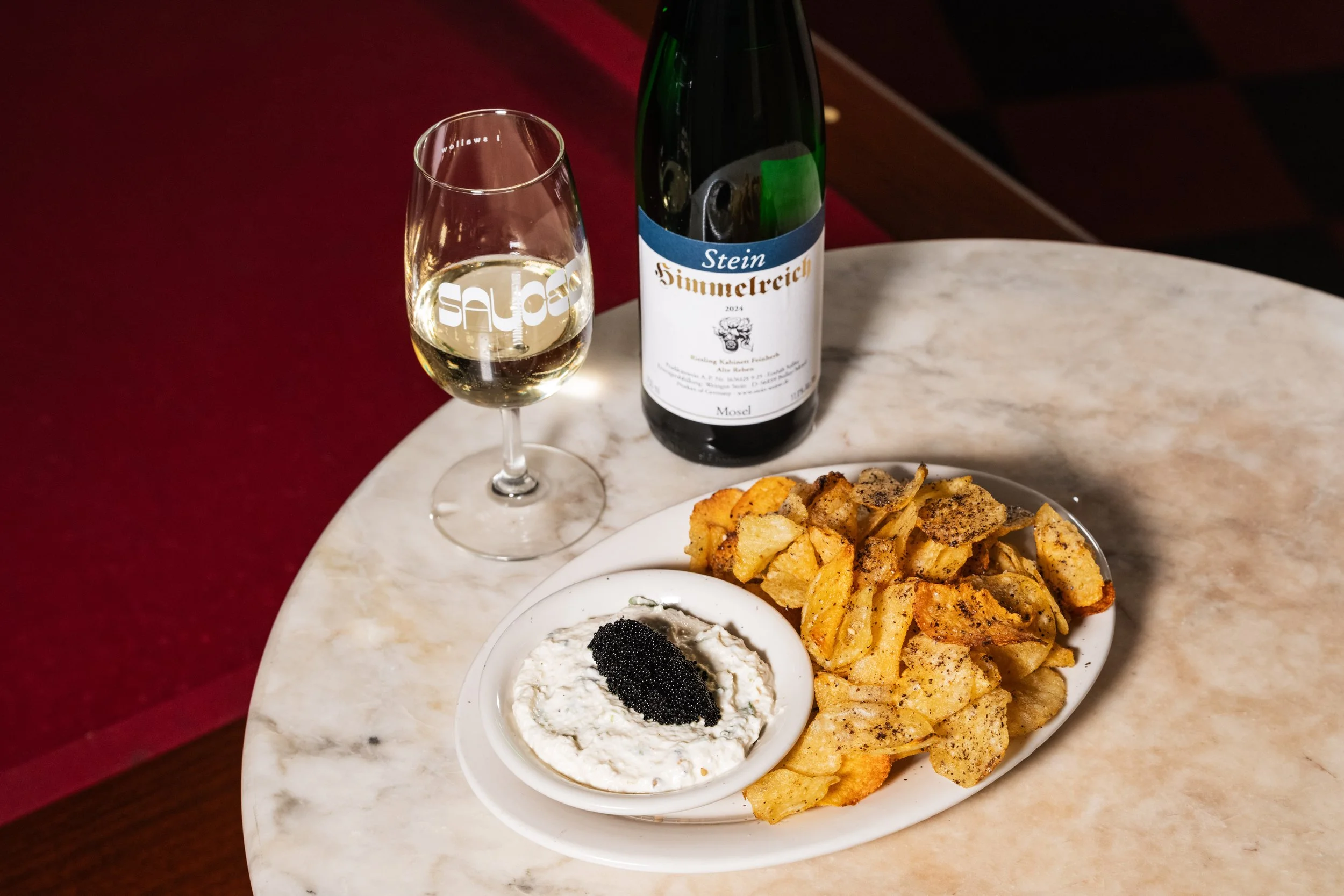 Roasted Onion-Sour Cream Dip, Tobiko, Furikake-Coated Kettle Potato Chips paired with Riesling, Ulli Stein, Himmelreich Riesling Kabinett Feinherb, Mosel, Germany, 2024