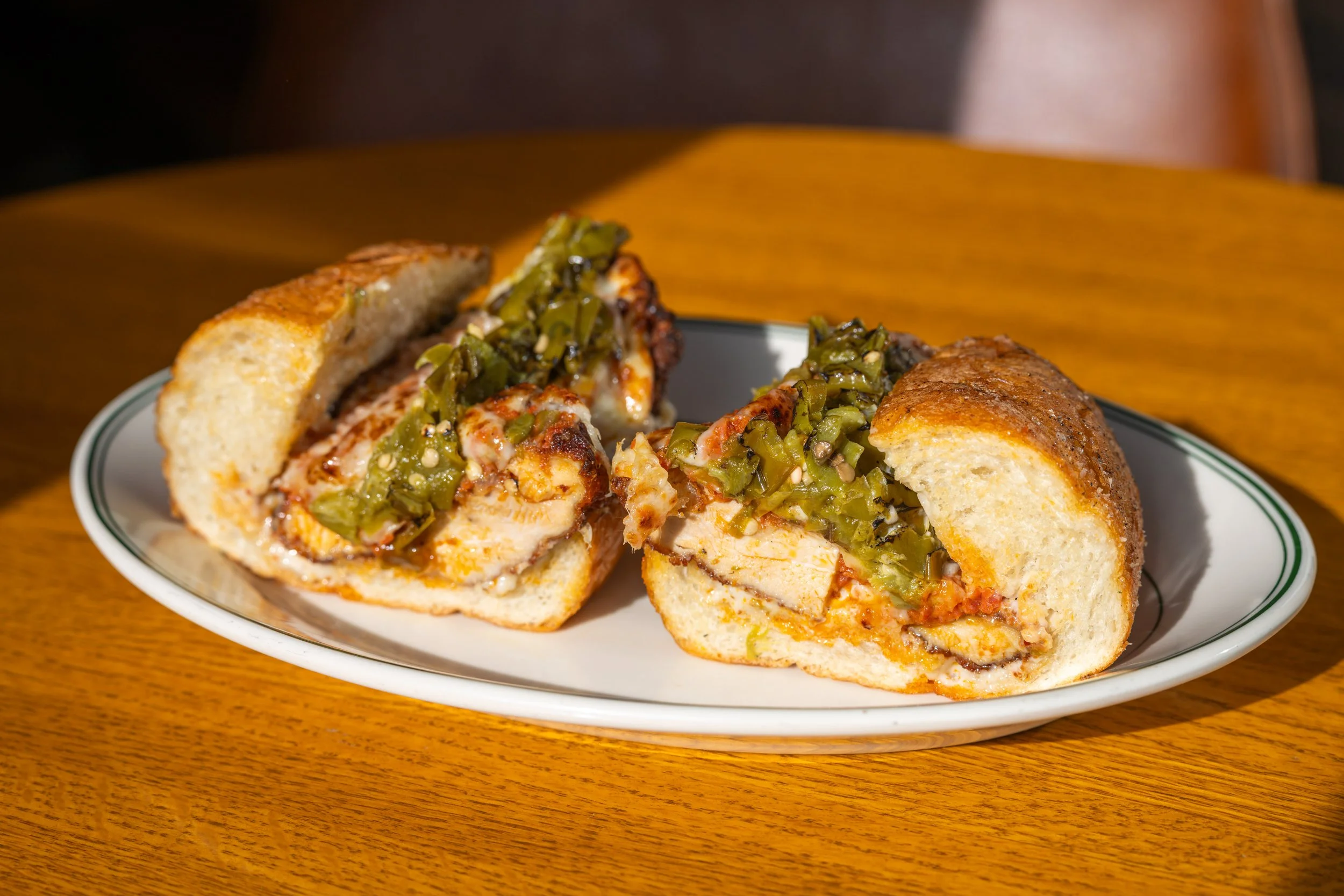 Chicky Pep Number Two: Chicken Cutlet, Pepperoni Bolognese, Mozzarella, Provolone, Roasted Long Hot Peppers, Anchovy Mayonnaise, Garlic Bread Dust, Soft Roll