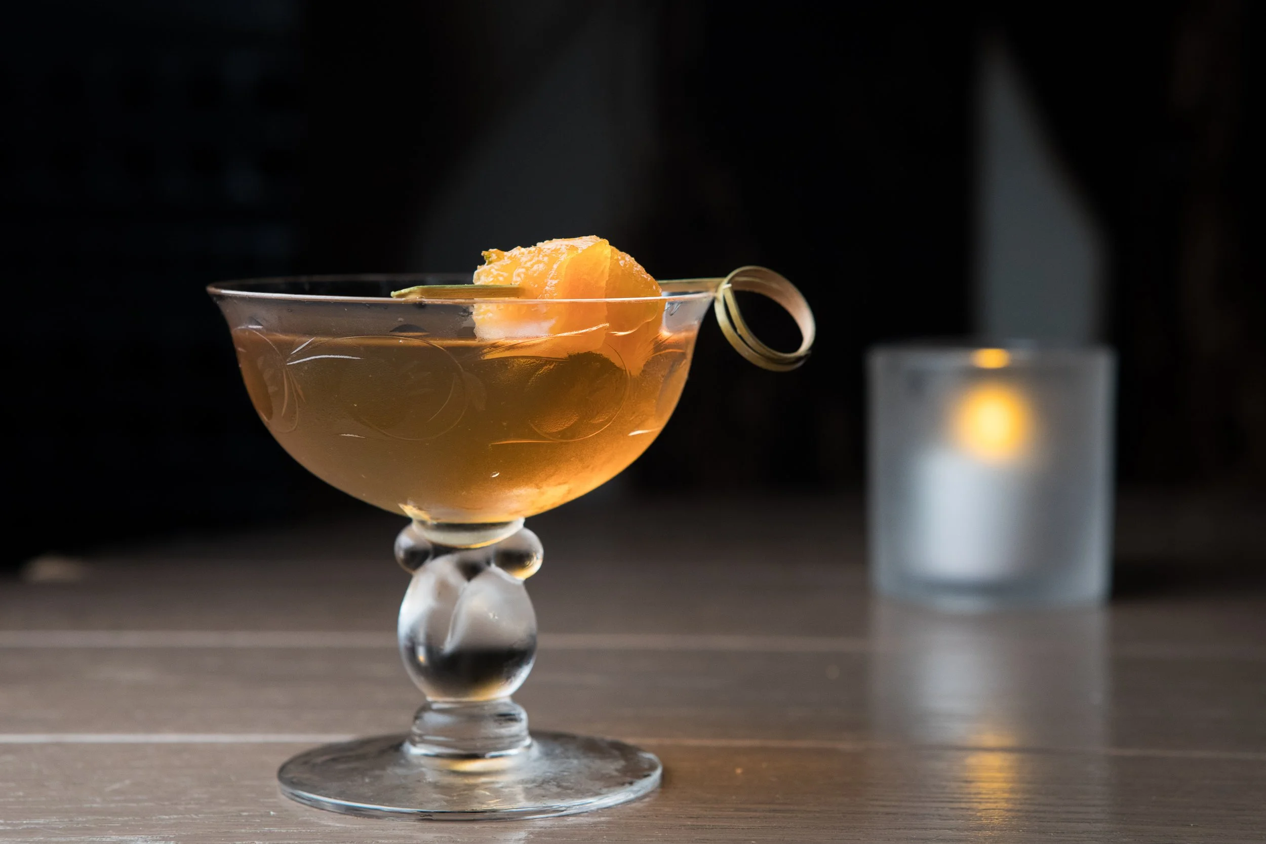 Tonga Thai Cocktail: Gin, Lime Juice, Aquafaba, Fresh Turmeric Syrup, Galangal, Ginger, Kaffir, and Peppercorns