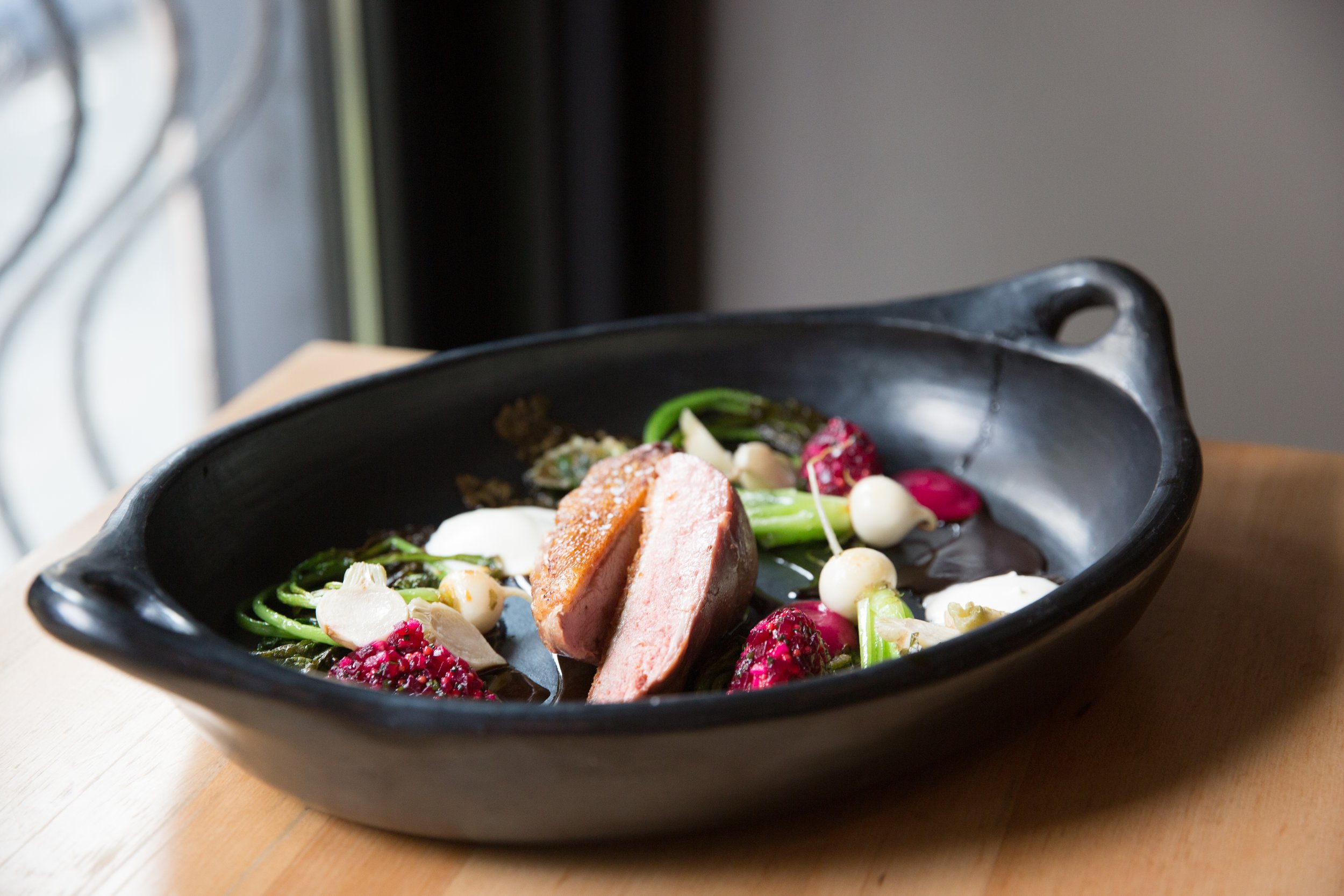 Crescent Duck Breast, Beet Mustard, Beet Relish, Granny Smith Apple, Pickled Mustard Seeds, Chives, Crème Fraîche, and Haruki Turnips