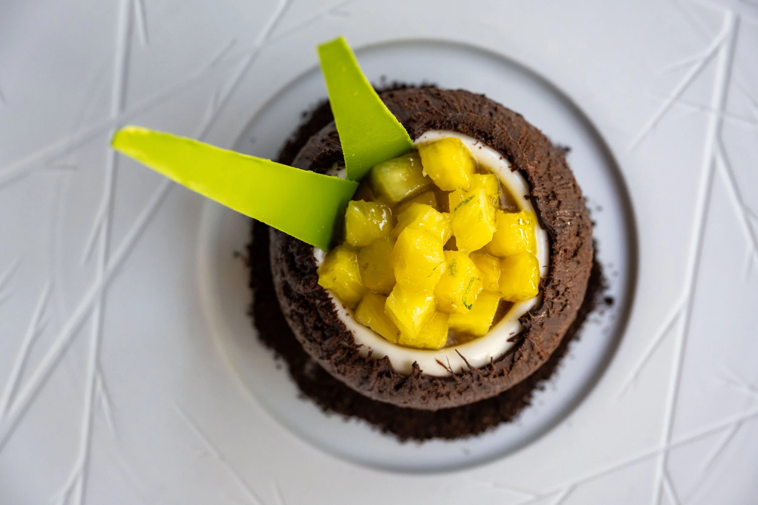 Coconut Panna Cotta, Mango Compote, Banana Cake, Chocolate Shell, Pineapple-Lime Compote, Passion Fruit-Chocolate Leaves
