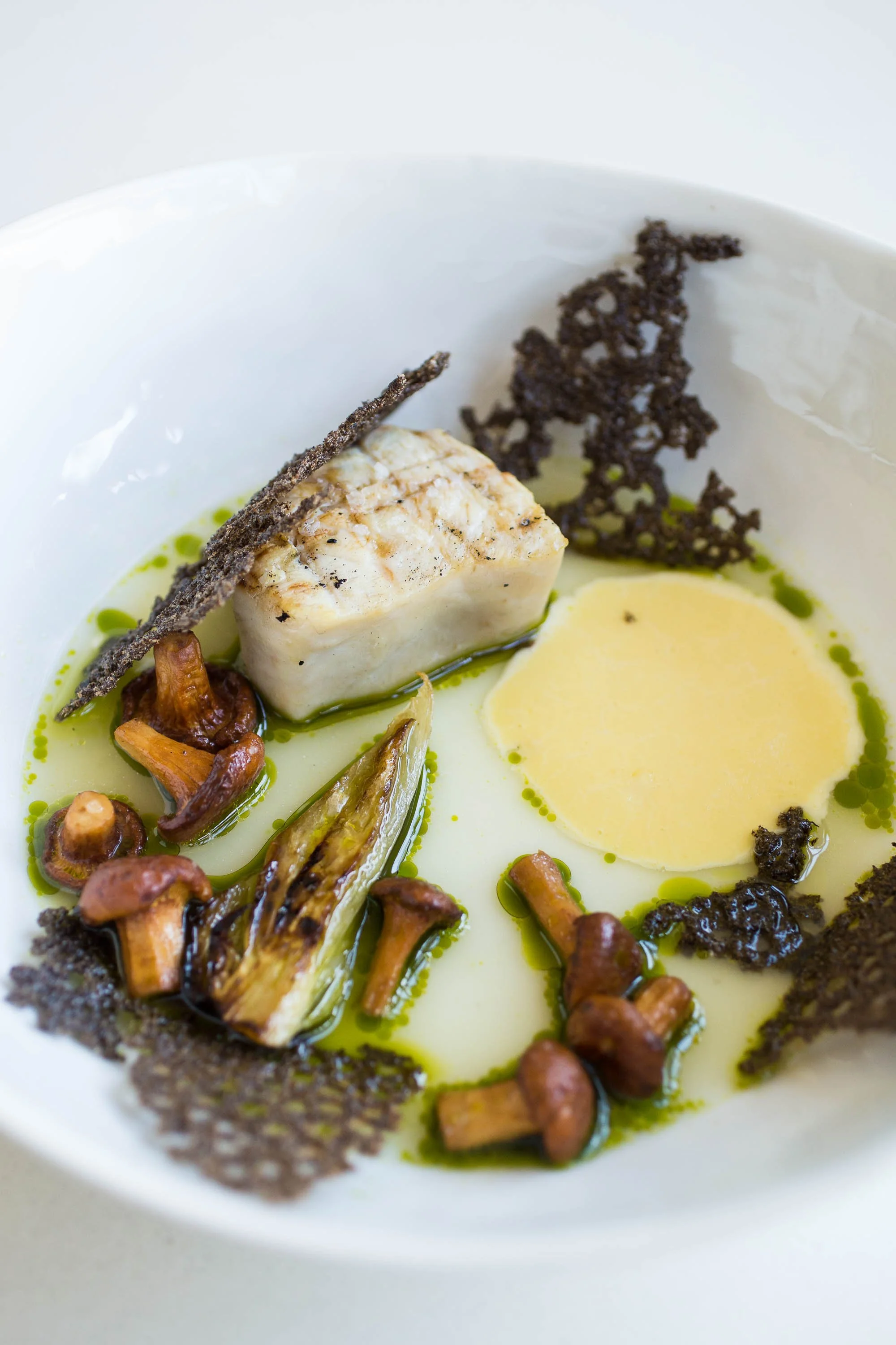 Brined and Kewpie-d Binchotan-grilled Albacore Loin, Fumet, Dill, Butter-poached Chanterelles, Grilled Pickled Fennel, Mussel Jus-Buckwheat Tuile, and Virginia Brown Bread