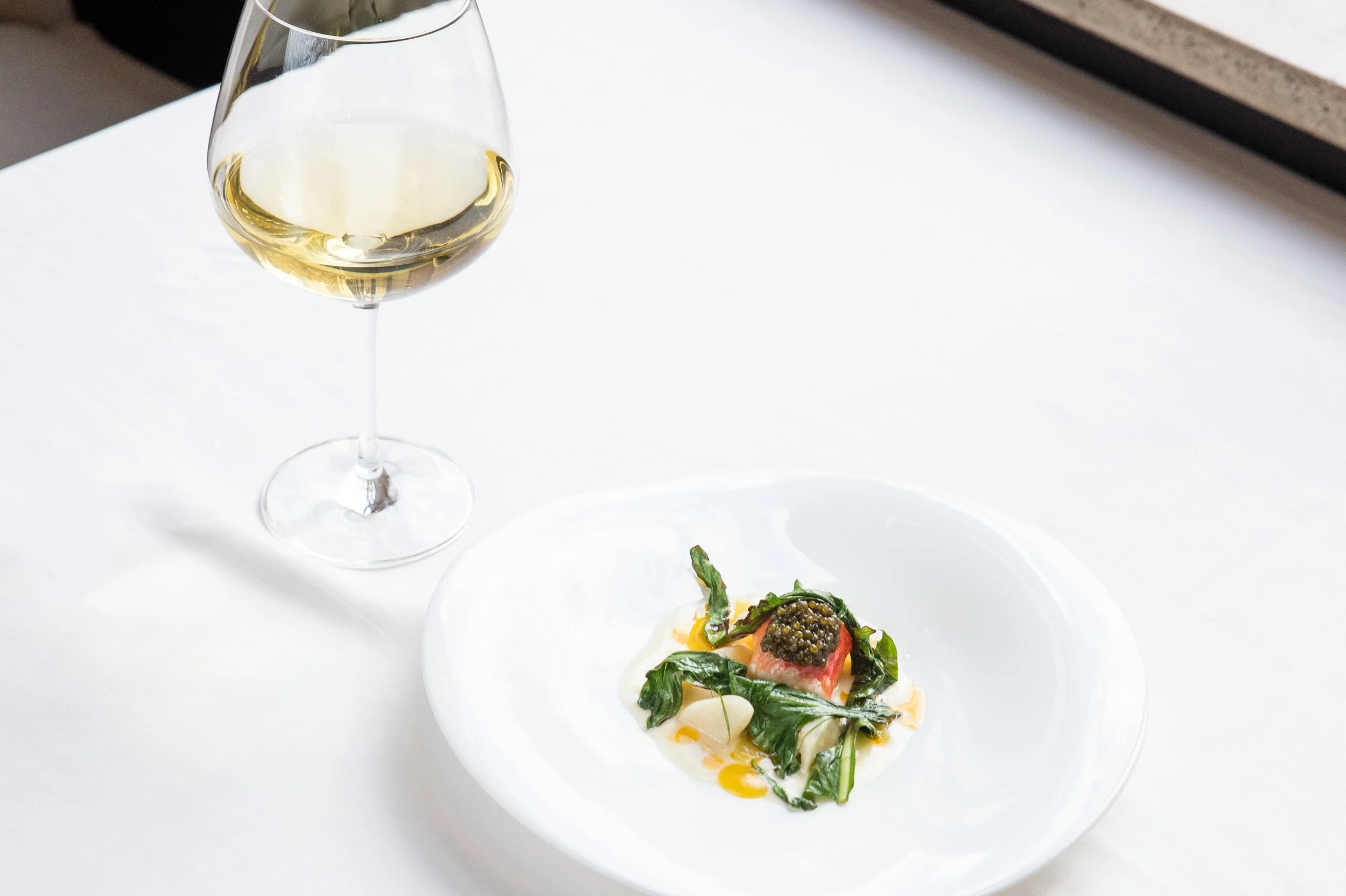 Poached King Crab, Caviar, Creamed Salsify, Meyer Lemon, and Grilled Dandelion Greens paired with Chardonnay, Kumeu River Estate, Kumeu, New Zealand, 2015