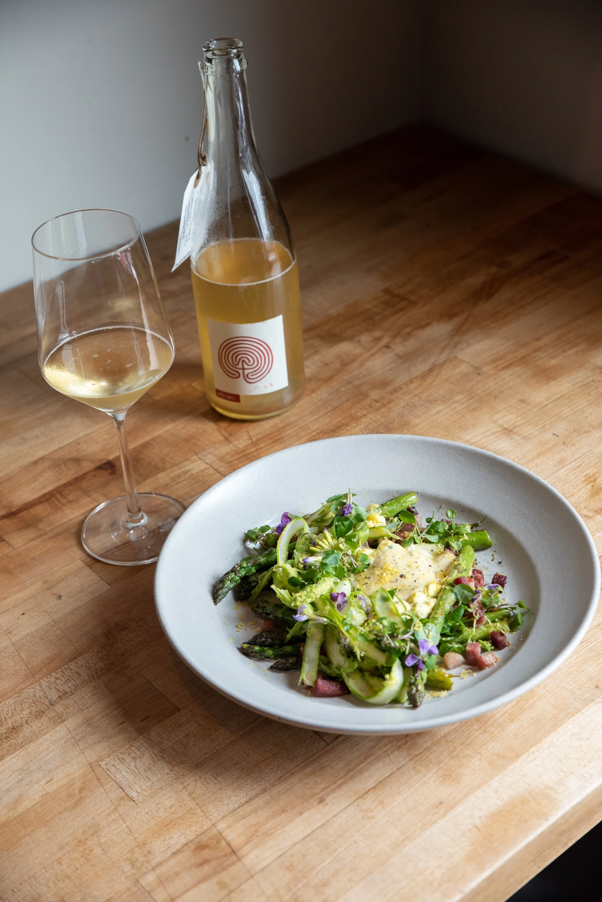 Asparagus alla Carbonara, Prosciutto, Cured Yolk, Parmigiano, and Black Pepper with Glera, Vino Frizzante da Tavola, 450slm, Costadilla, Veneto, Italy, 2017