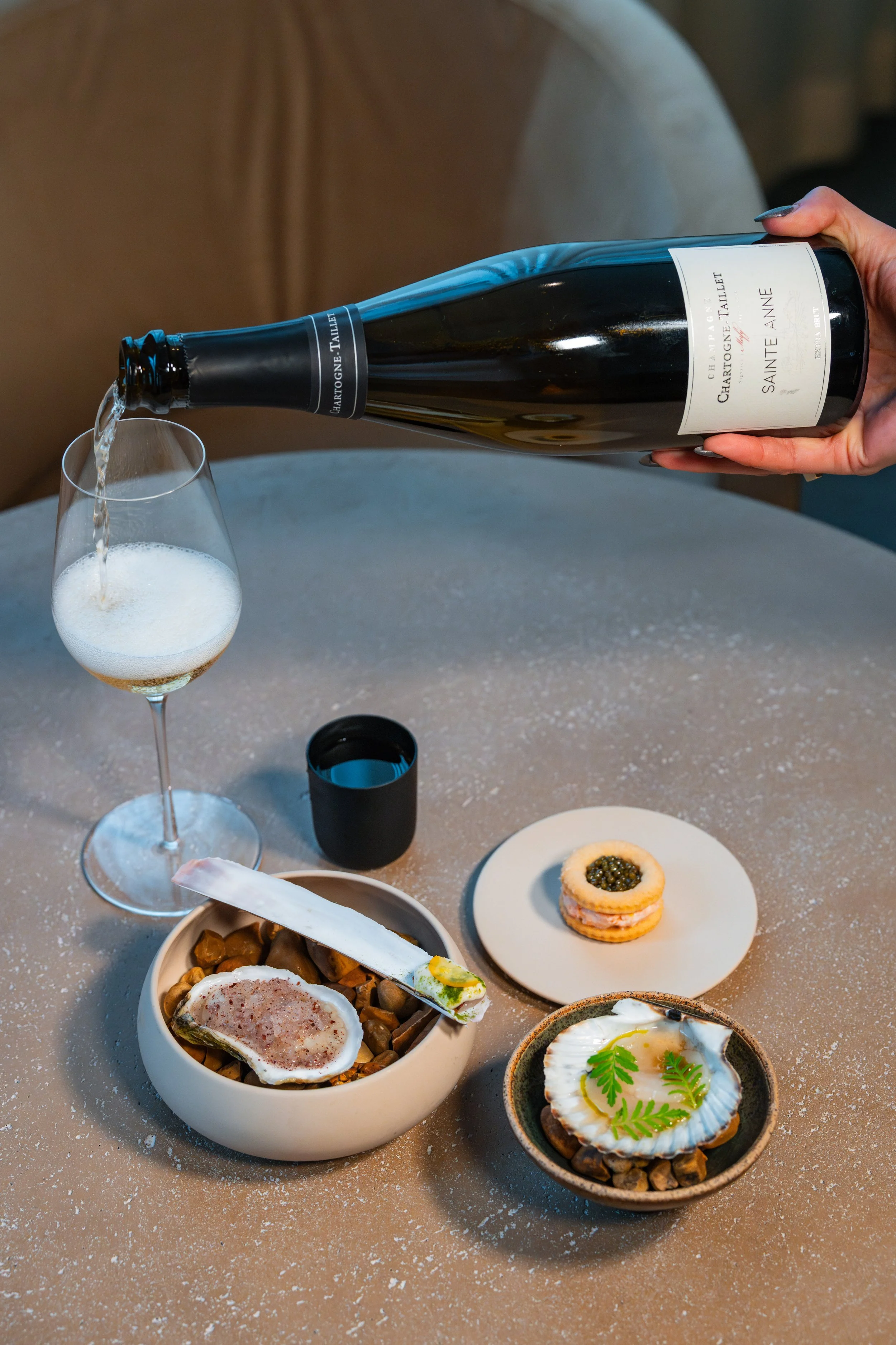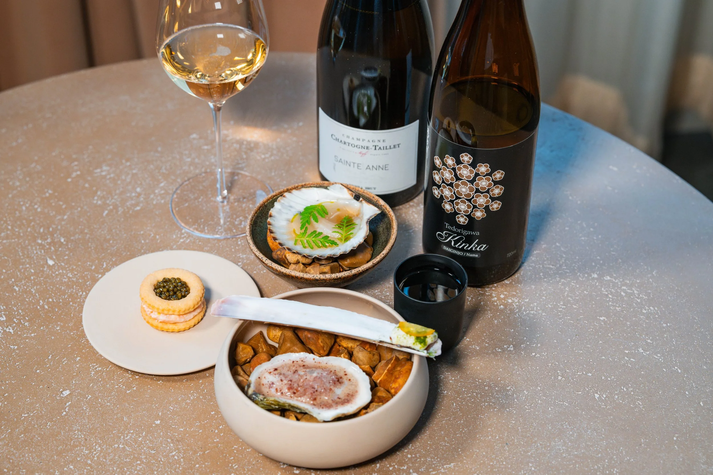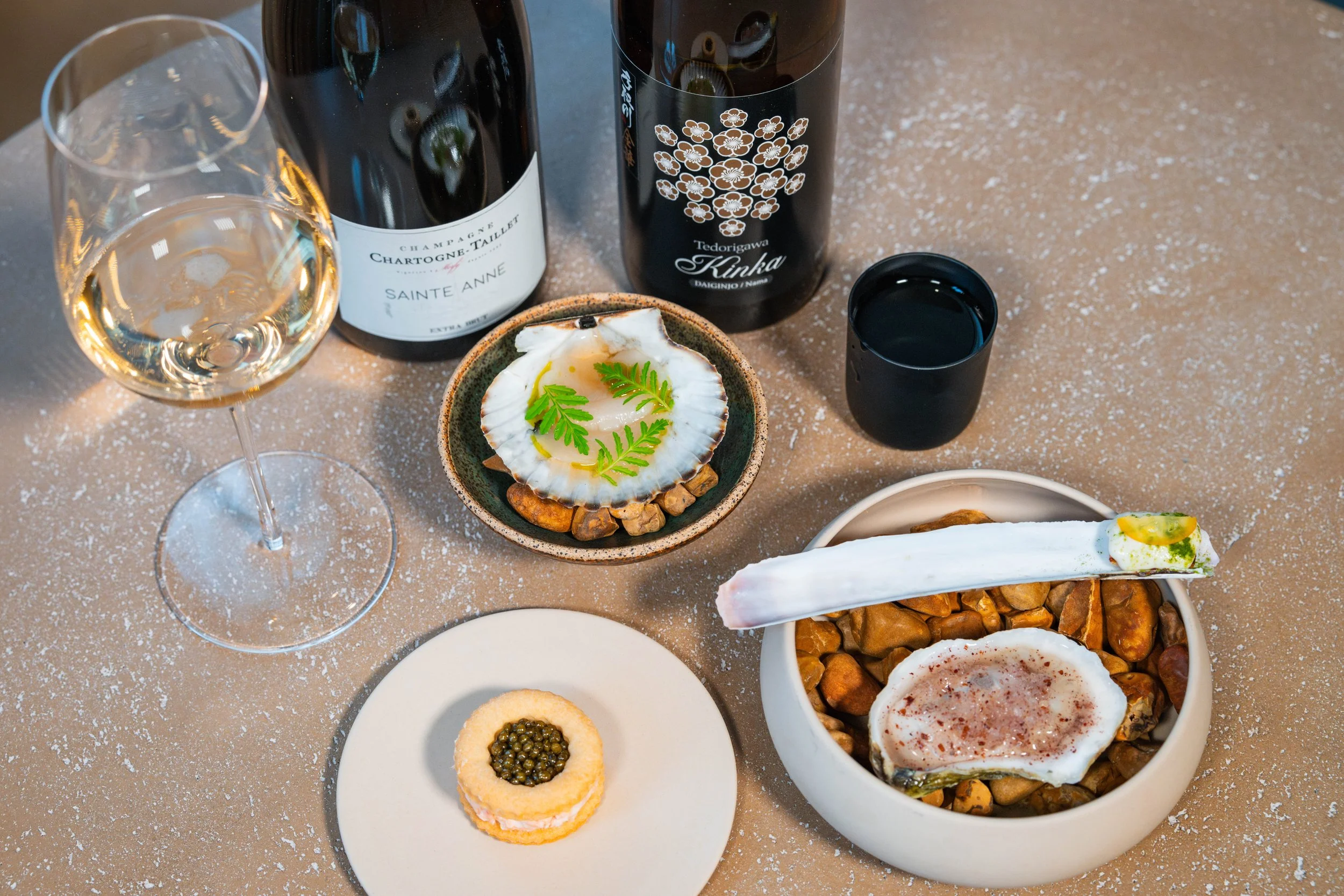 Seafood Snacks: (1) Hay-Smoked Oysters, Shaved Fennel-Apple Ice, Lime, Staghorn Sumac; (2) Razor Clams, Fermented Vichyssoise Sauce, Limequats, Dill-Chive Powder; (3) Cured Scallops, Blood Orange-Peach Pit Shrub, Honey, Dill Oil, Tangerine Lace; (4) Bucksnort Trout Rillette, Butter Cracker, Osetra Caviar paired with (1) Chardonnay/Pinot Noir/Pinot Meunier, Chartogne-Taillet, Sainte Anne, Champagne, France; (2) Yamadanishiki/Gohyakumangoku, Tedorigawa, Kinka Daiginjo Nama, Ishikawa, Japan