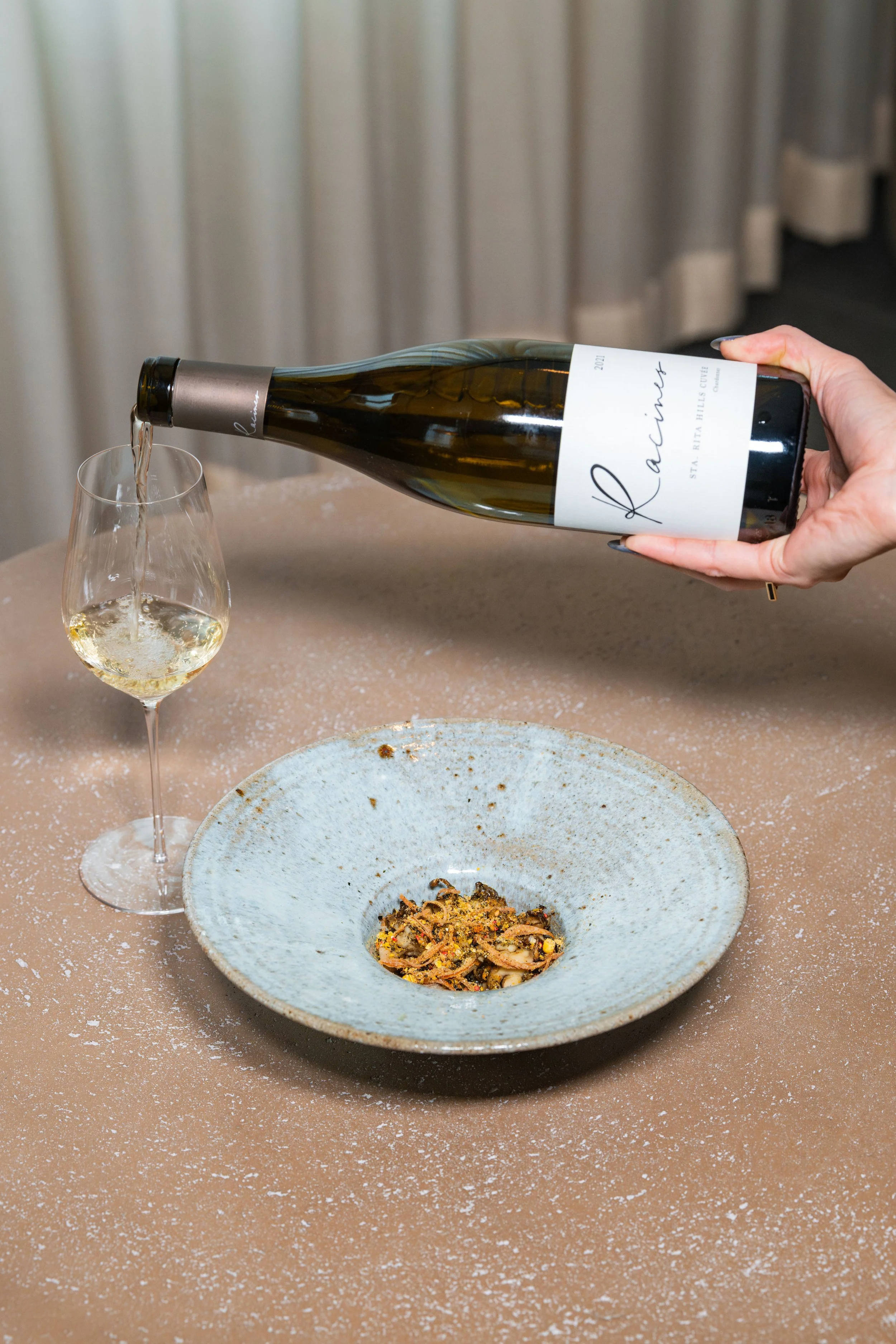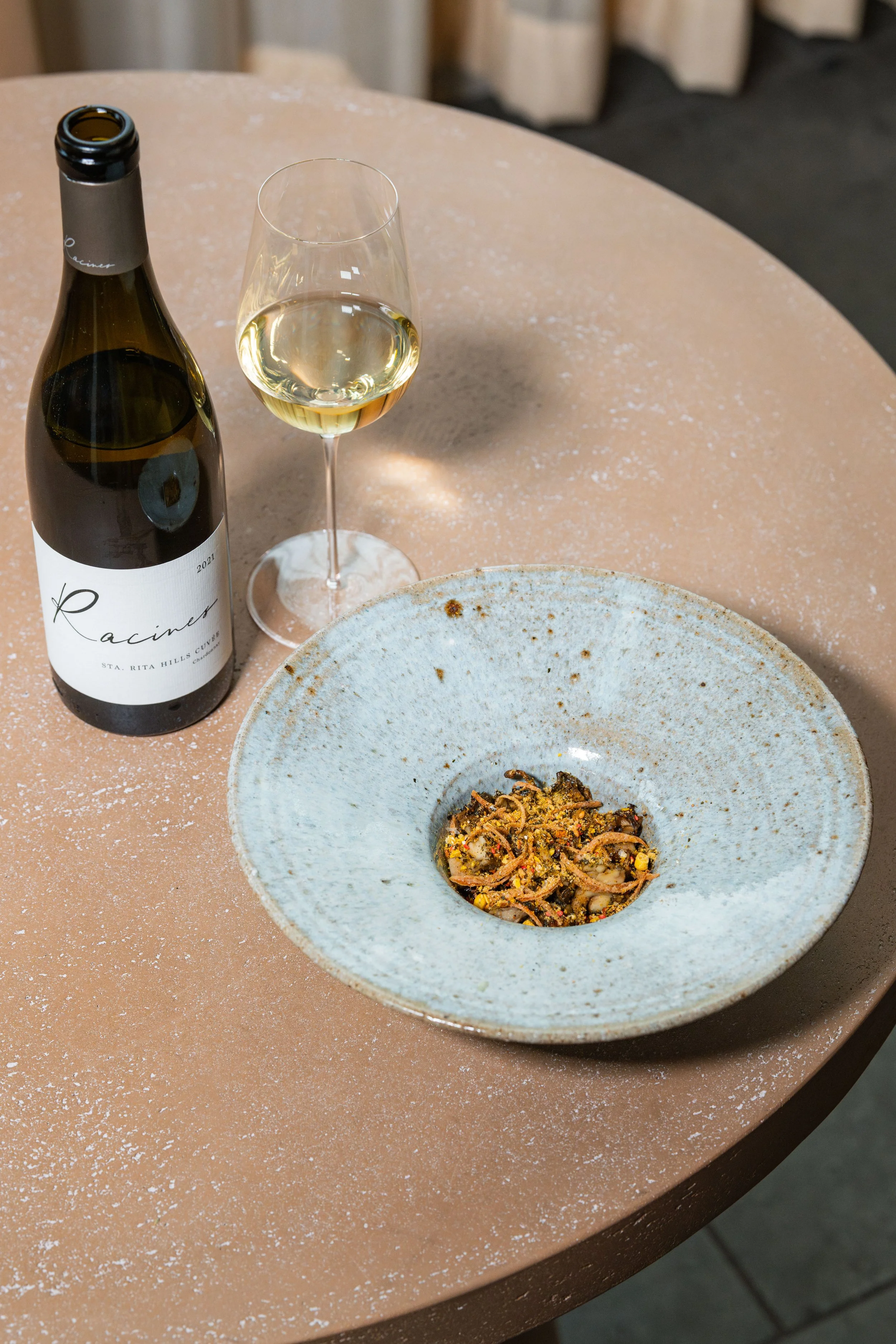 Fried Lion’s Mane Mushrooms, Roasted Maitake Mushrooms, Celeriac-Pistachio Purée, Black Apple Tare, Corn-Fig Leaf-Sichuan Peppercorn Furikake paired with Chardonnay, Racines, Sta. Rita Hills, California, 2021