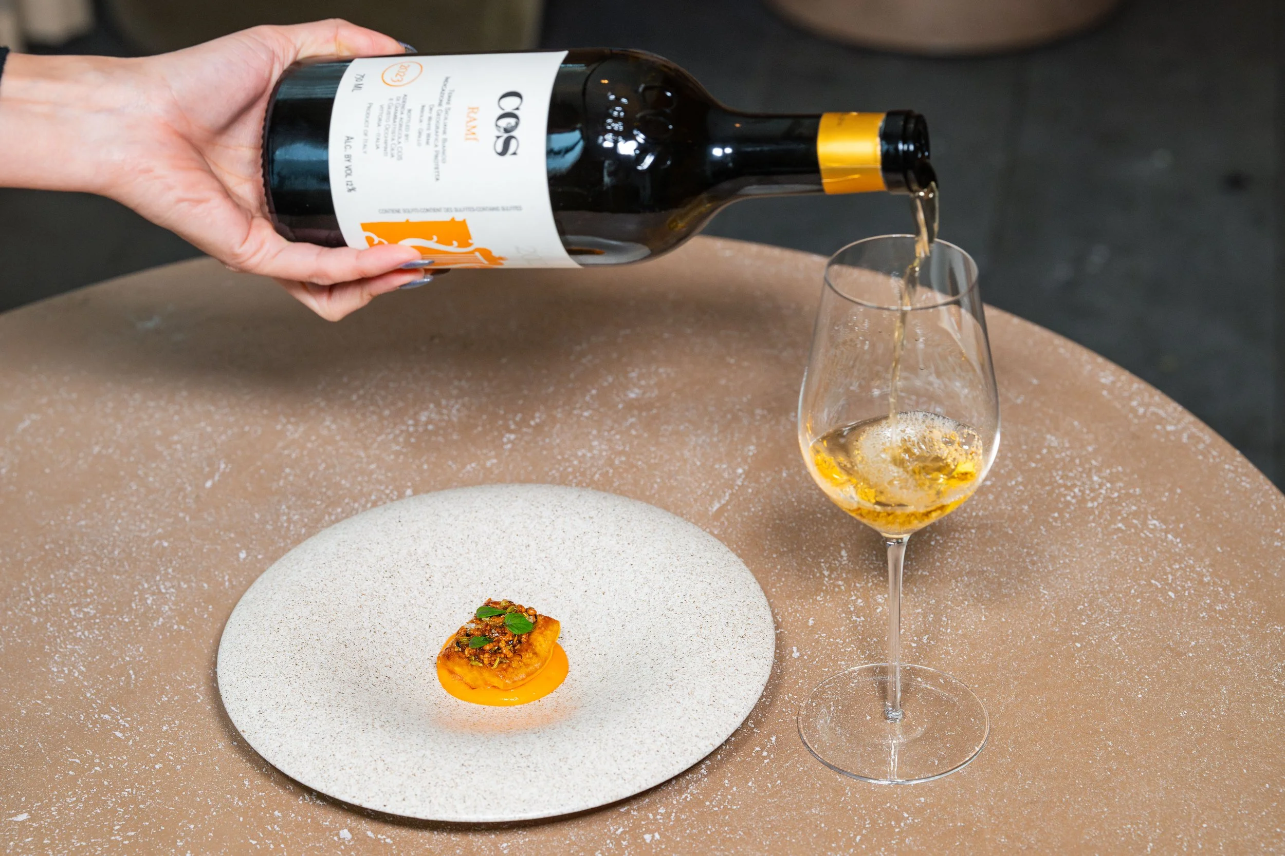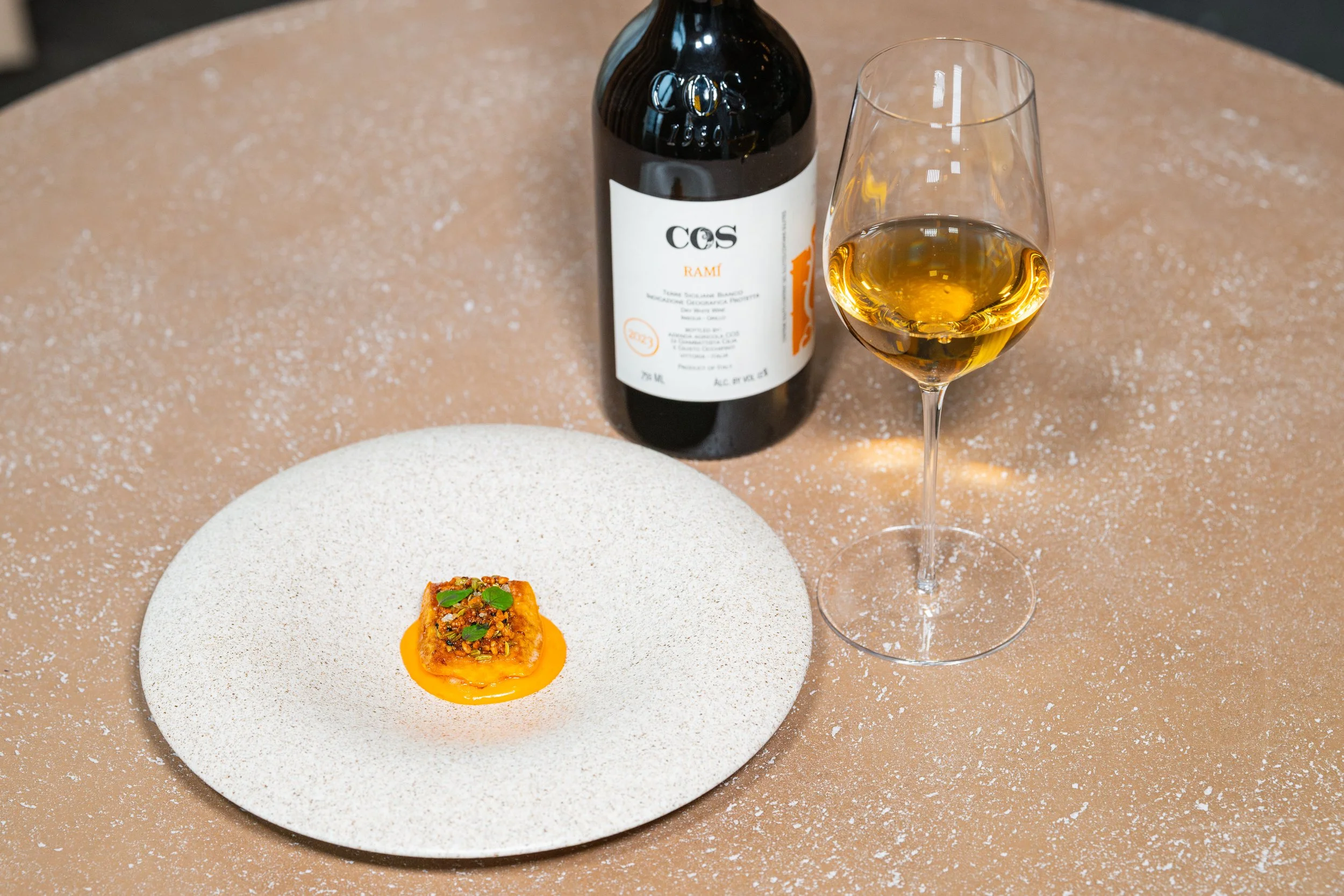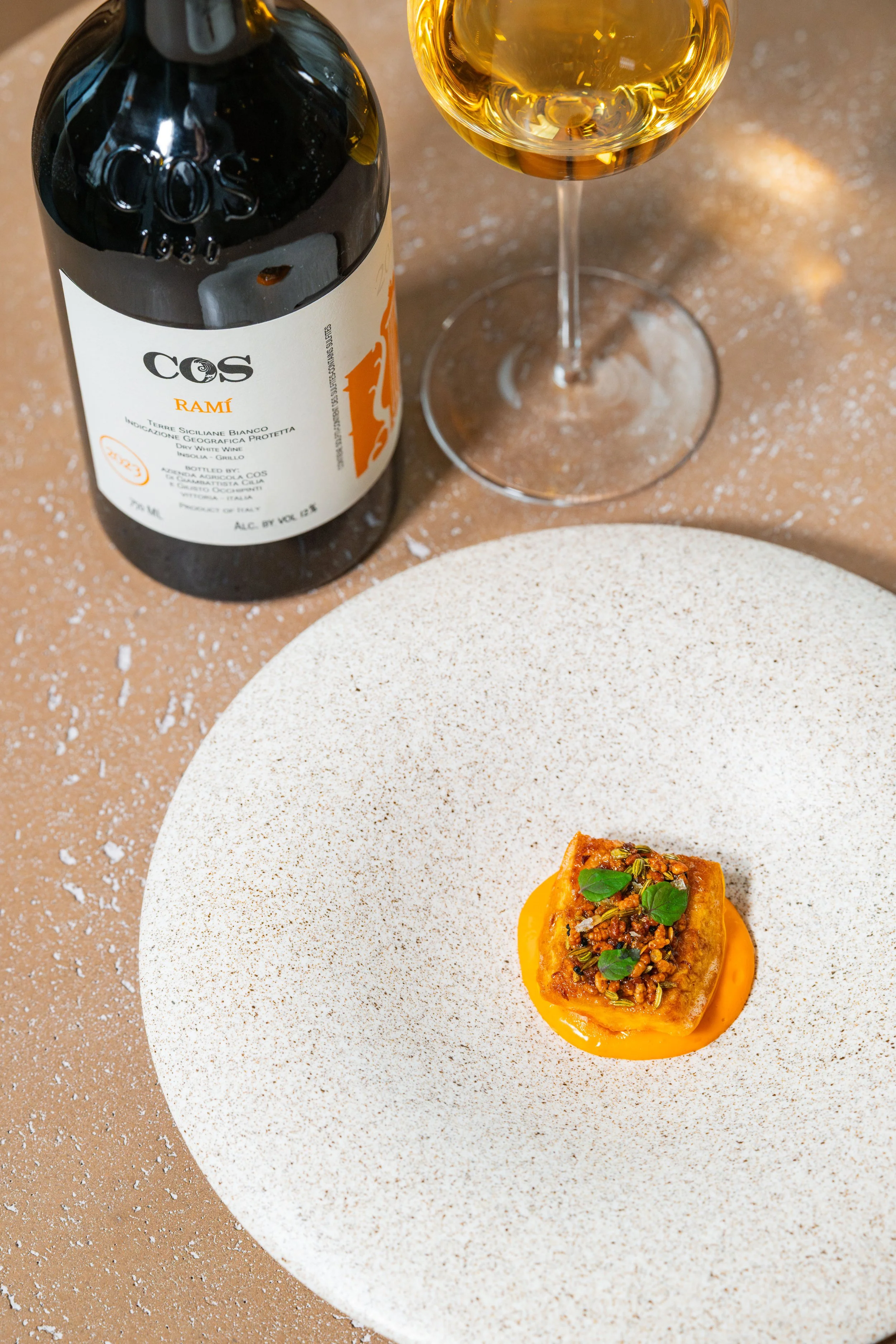 Roasted Delicata Squash, Fermented Tomato Sauce Choron, Salsa Seca, Shiso paired with Grillo/Insolia, Cos, Rami, Vittoria, Sicily, Italy, 2023
