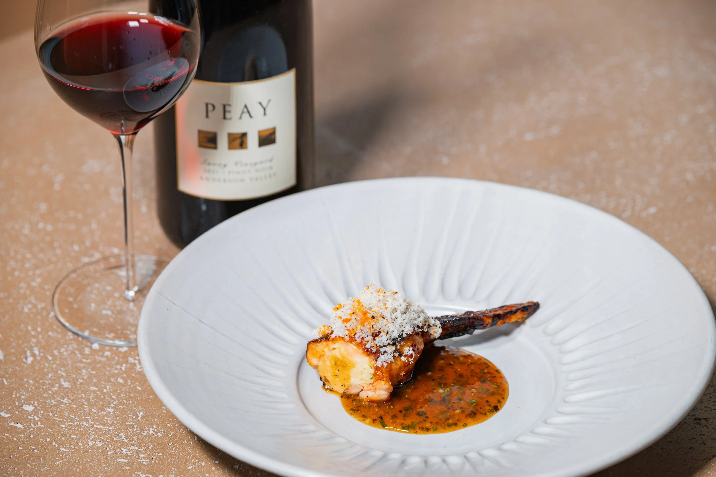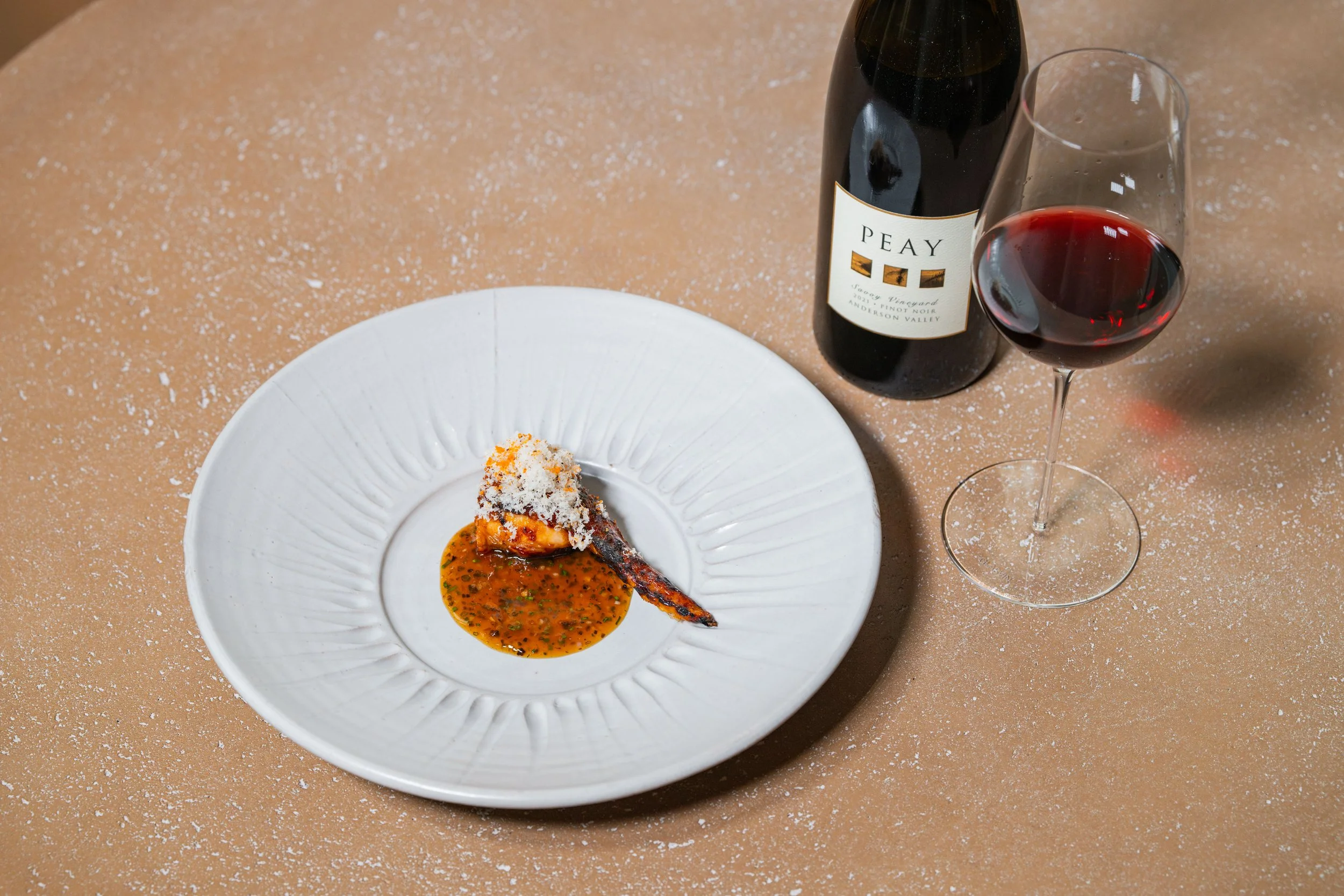 Smoked Stuffed Chicken Wing, Fermented Black Truffle Chicken Jus, Chicken Tare, Shaved Macadamia Nuts, Fermented Chiles, Candied Seaweed paired with Pinot Noir, Peay, Savoy Vineyard, Anderson Valley, California, 2021