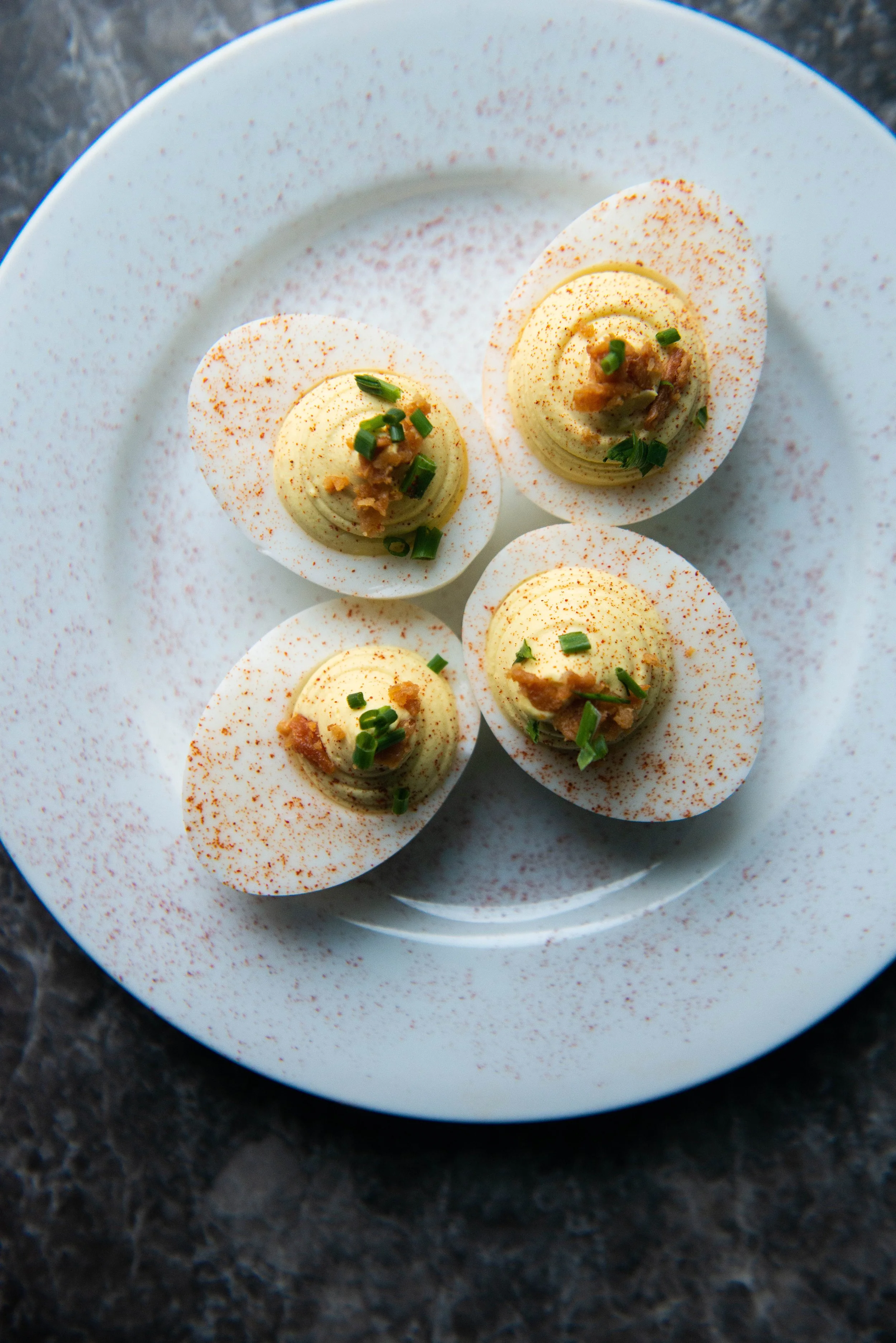 Deviled Eggs, Smoked Paprika, Crispy Chicken Skin, Chives