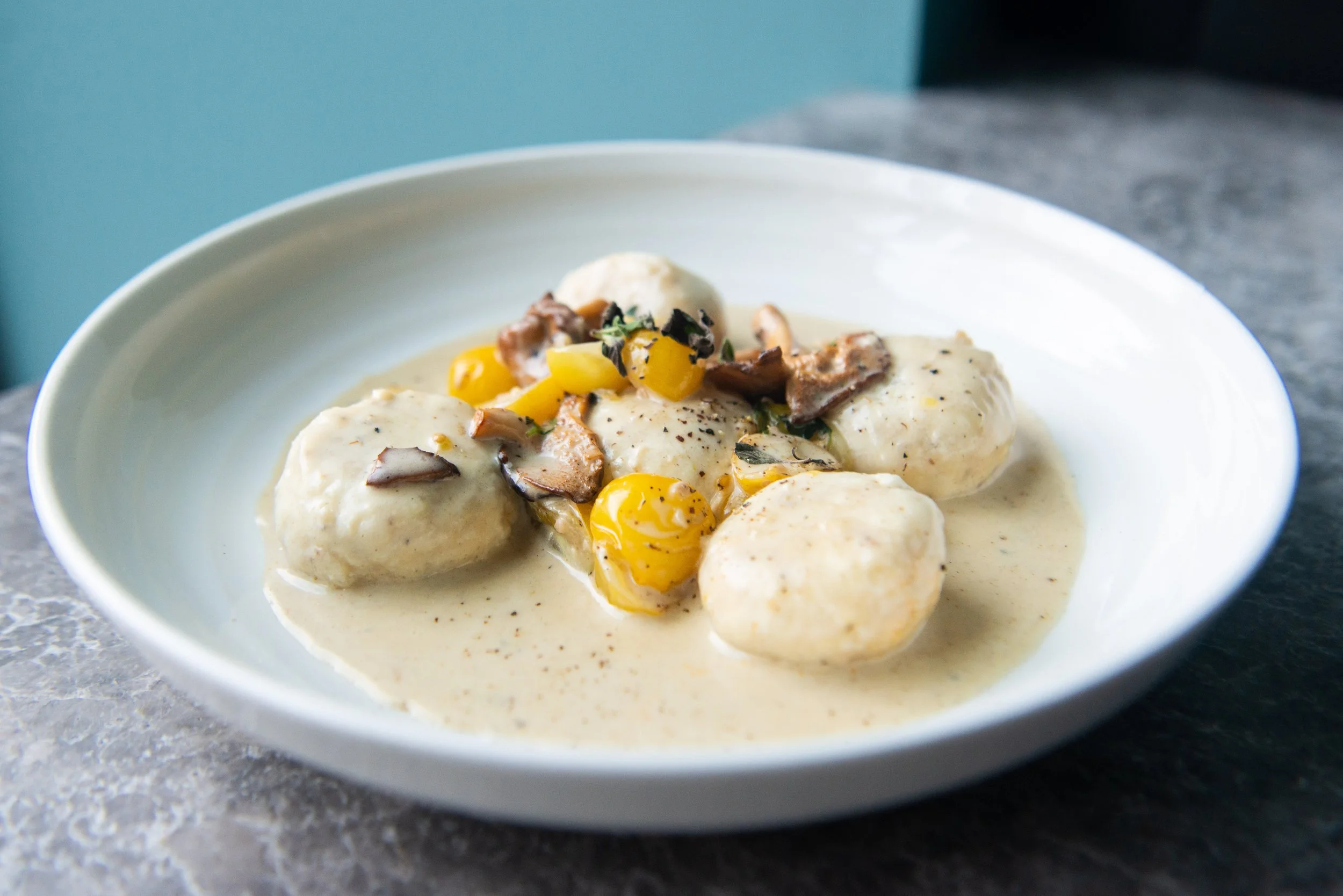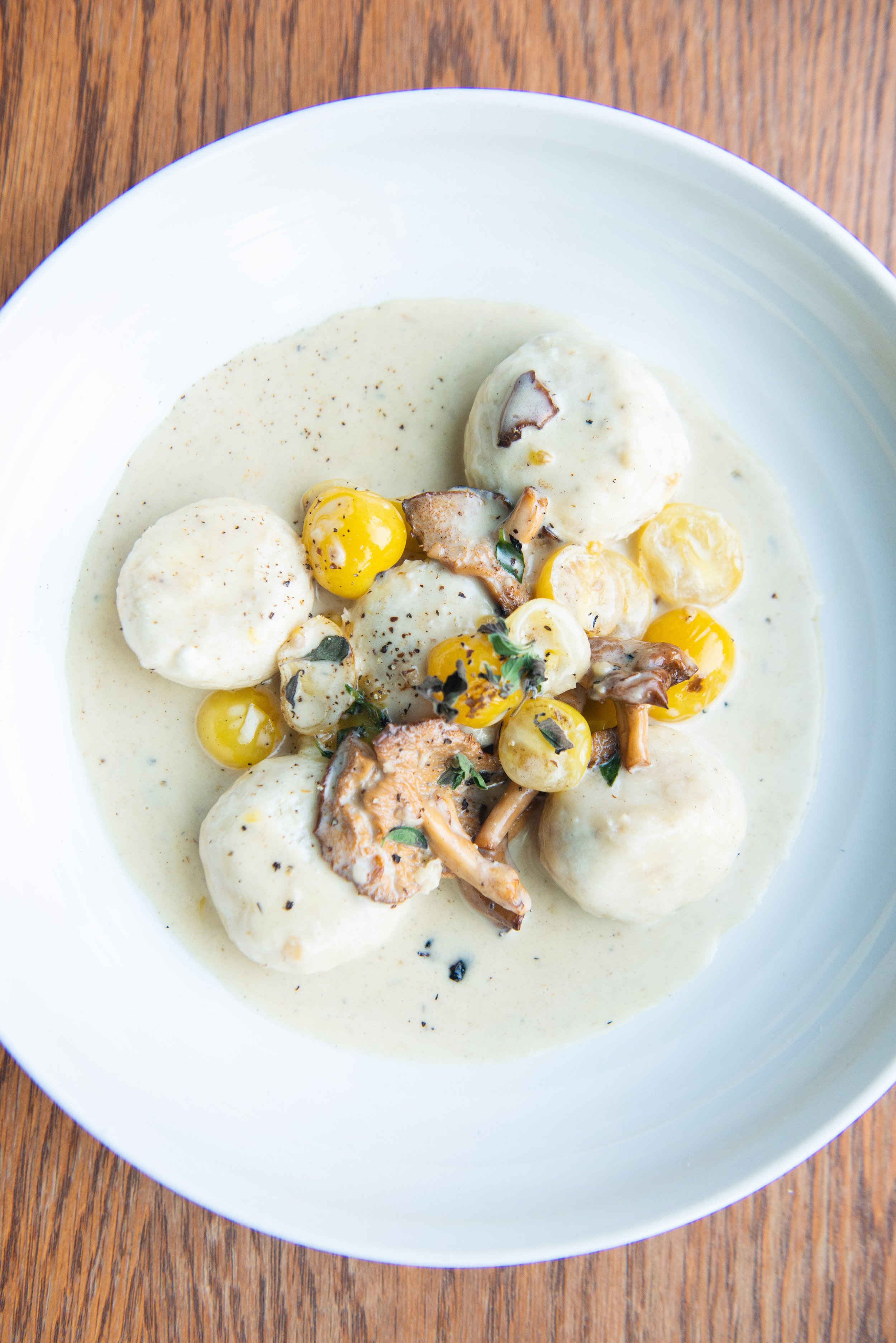 Ricotta Dumplings, Hedgehog Mushrooms, Yellow Tomatoes, Marjoram, Cream