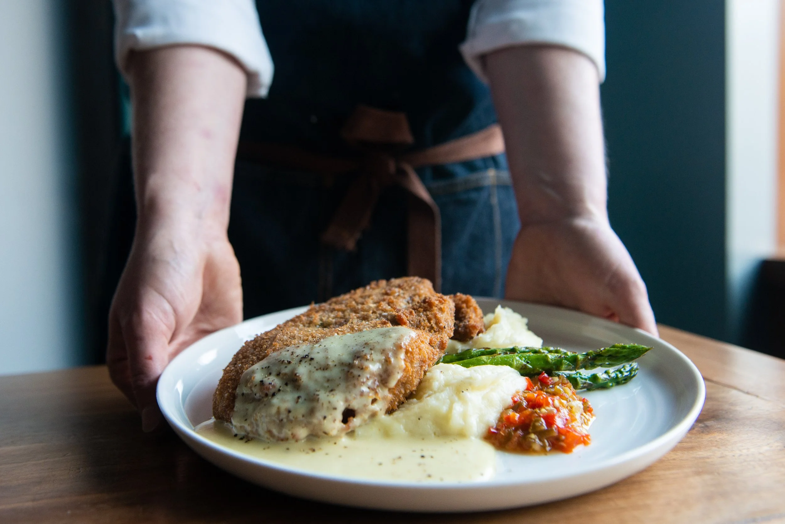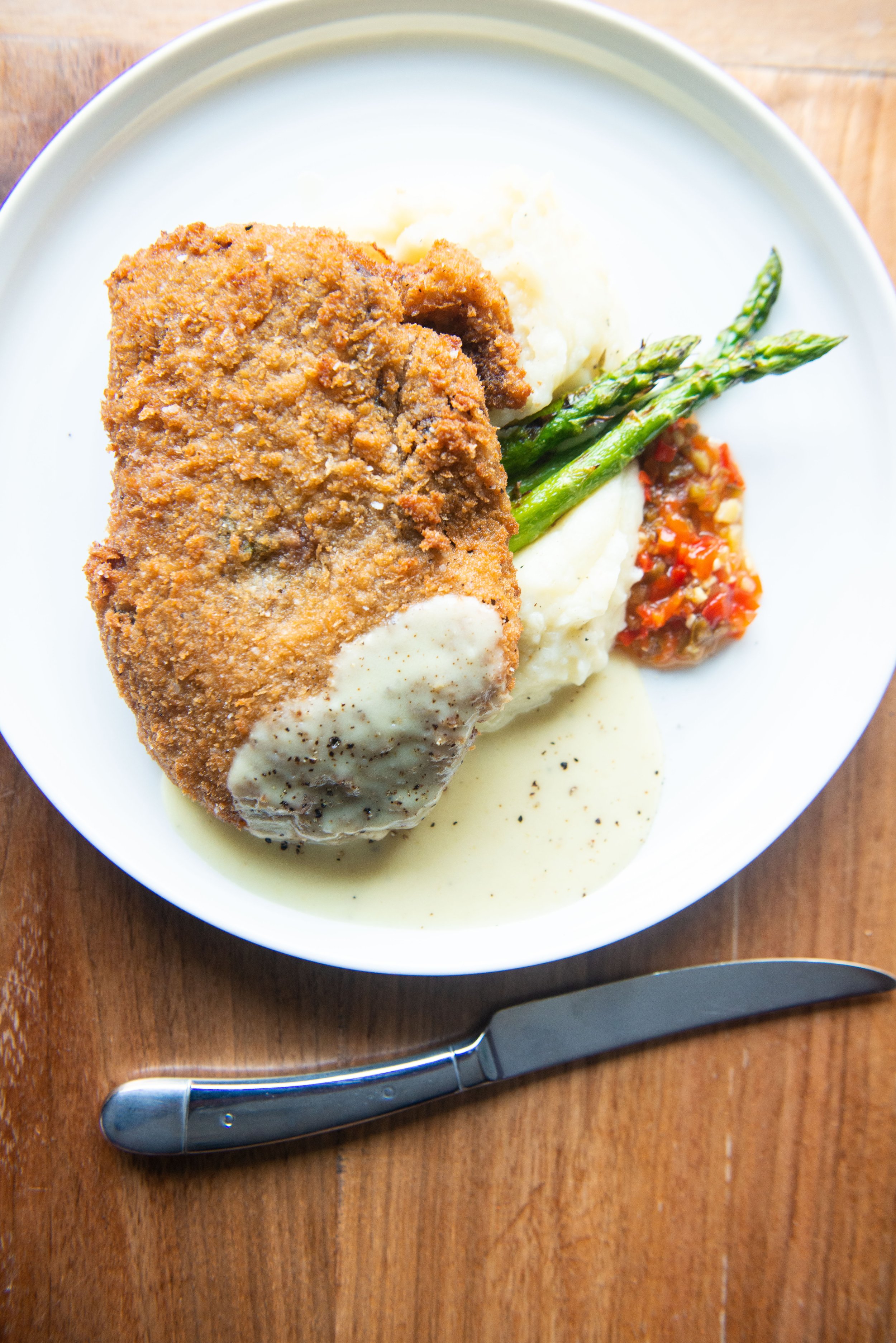 Chicken Fried Steak, Cherry Pepper Relish, Asparagus, Mashed Potatoes