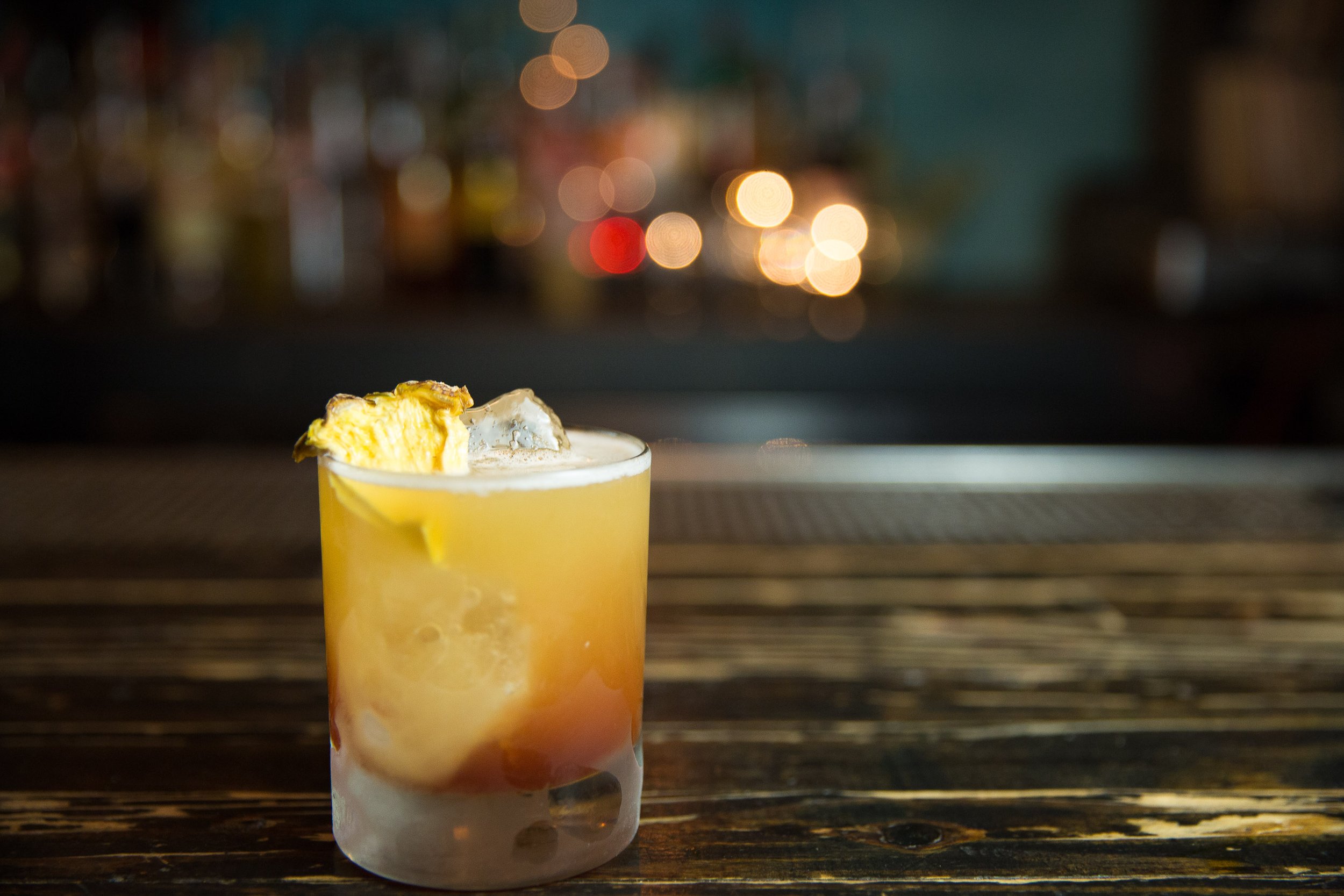 Rising Sun: Barbancout 4-year Rum, Old Grand-Dad Bourbon, Pineapple Gomme Syrup, Lemon Juice, Angostura Amaro, and Pineapple Chip