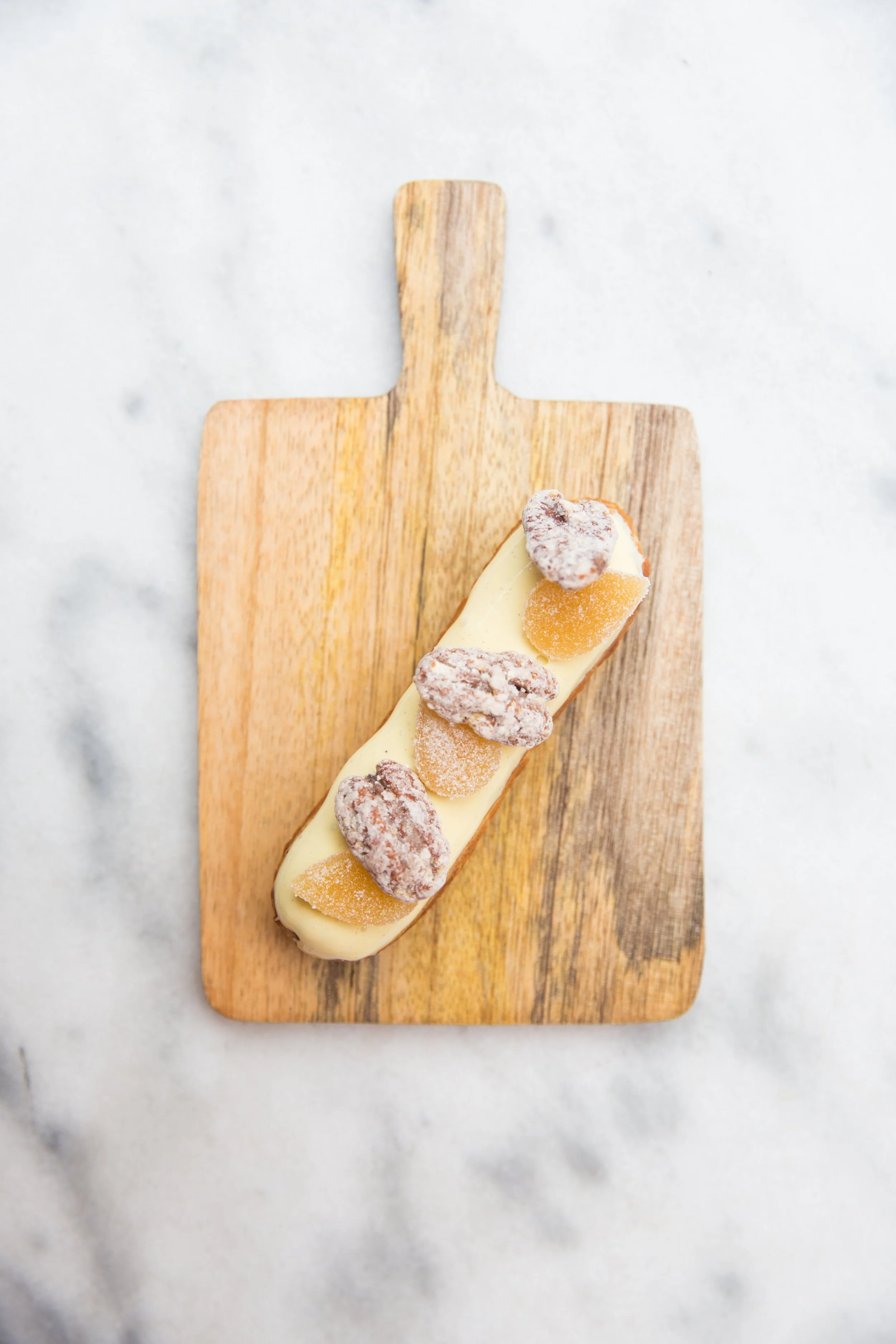 Eclair: Toasted Oat Pastry Cream, White Chocolate-Fenugreek Glaze, Golden Raisin Pate de Fruit, Golden Raisin-White Verjus Purée, Candied Pecans