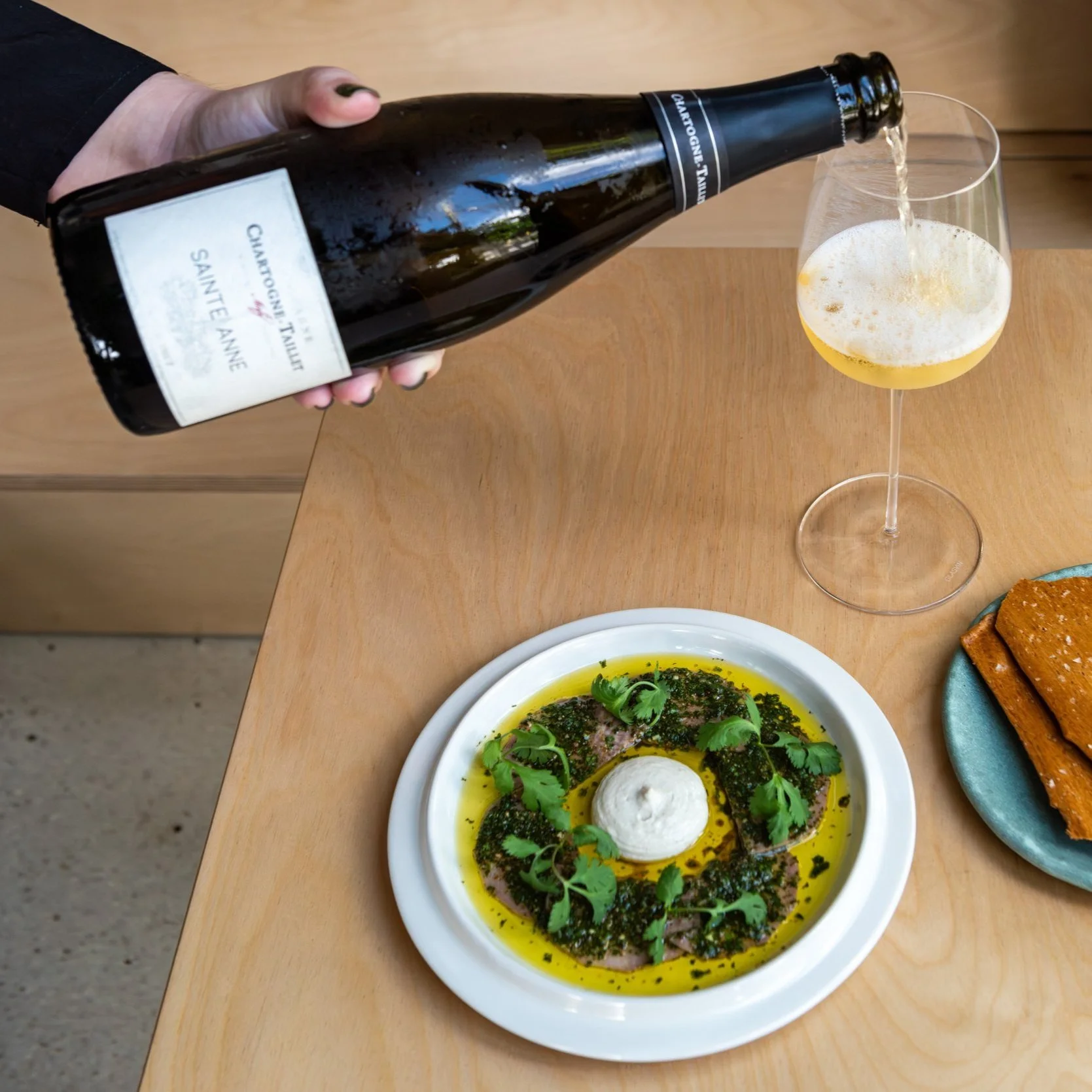 Wagyu Beef Tongue, Chimichurri, Whipped Sesame, Carta di Musica paired with Pinot Noir/Chardonnay/Pinot Meunier, Chartogne-Taillet, Sainte Anne Extra Brut, Champagne, France, NV