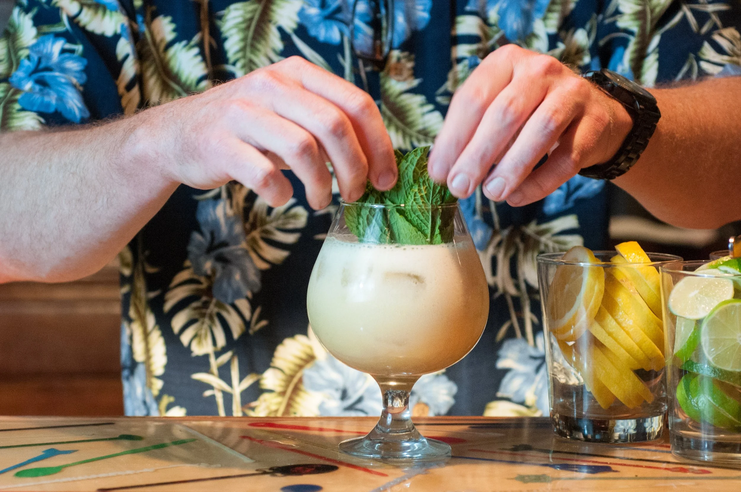 Fogg Cutter: Meyer’s Light Rum, Meyer’s Dark Rum, Tanqueray Gin, E&J Brandy, Orgeat, Lime, Orange, and Mint