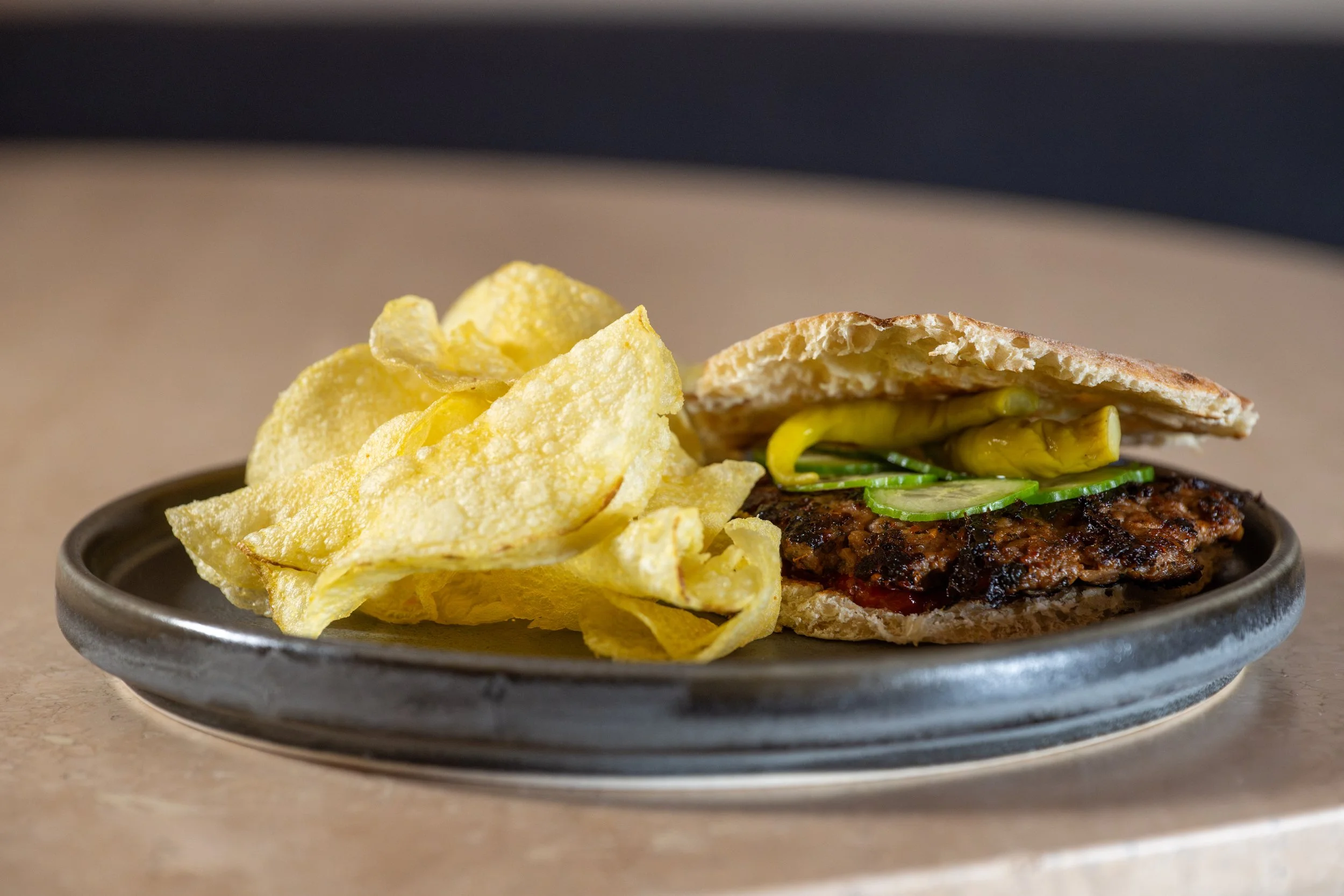 Mezze Aura: Kofte Smashburger, Harissa Ketchup, Cucumber, Piparra Peppers, Turmeric Pickled Relish, Angel Bakery Pita, Olive Oil Potato Chips