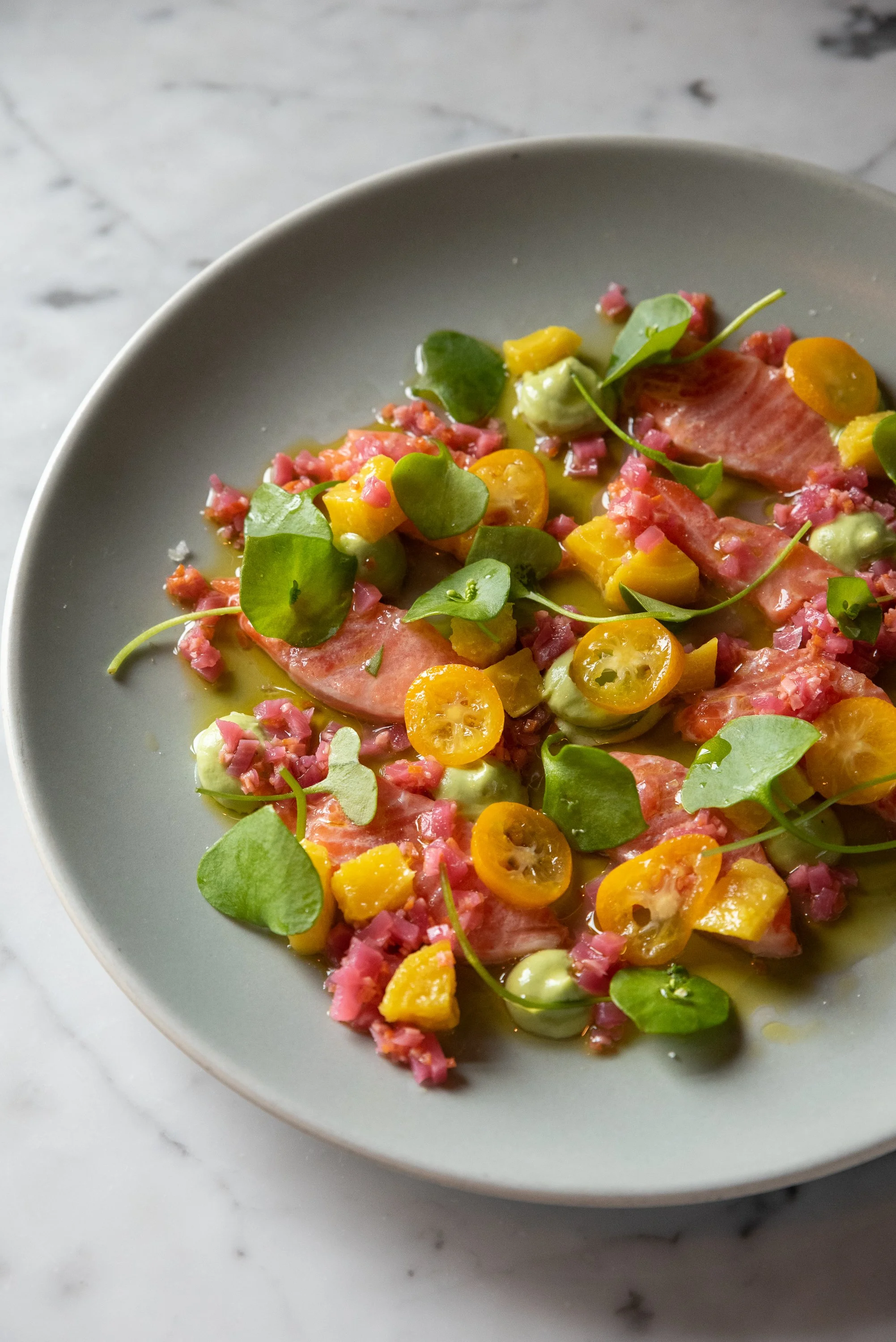 Trout Crudo, Ginger, Gold Beet, Preserved Blood Orange, and Pickled Kumquat