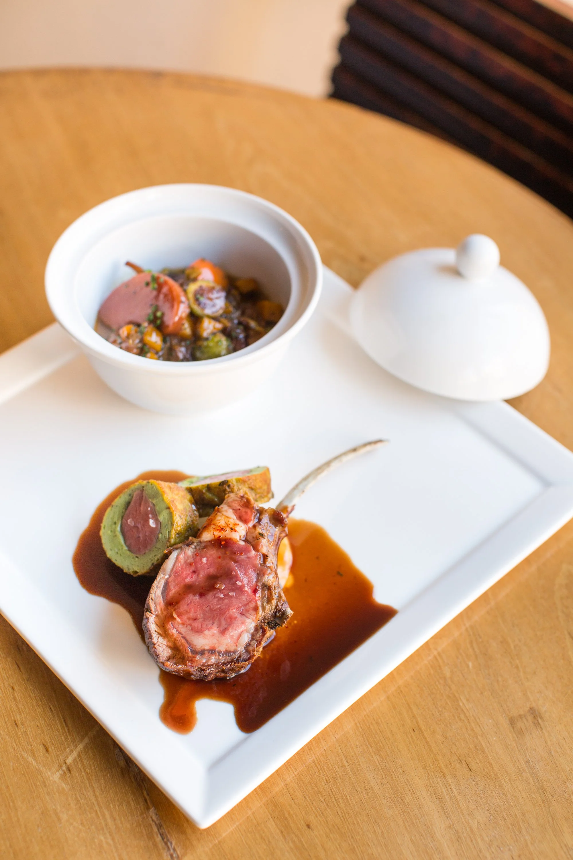Salt Meadows Lamb, Lamb Crépinette, Butternut Squash, Pickled Plums, Roasted Brussels Sprouts, and Chanterelles