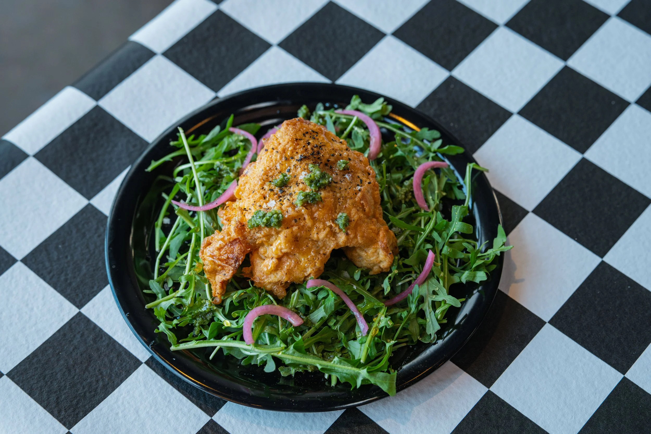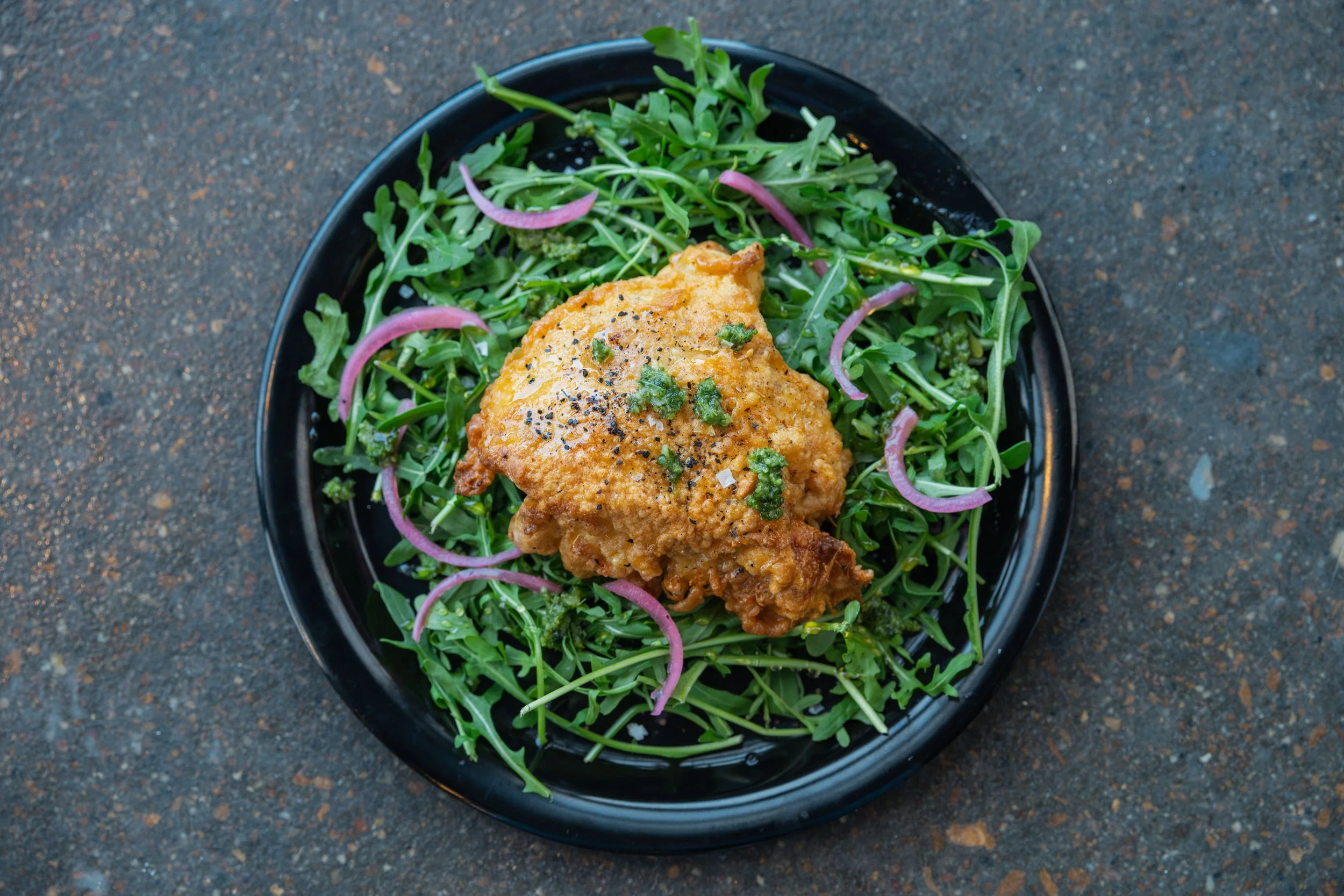 Fried Chicken, Arugula, Pomegranate-Pickled Onions, Pepita Pesto, Honey, Black Lime