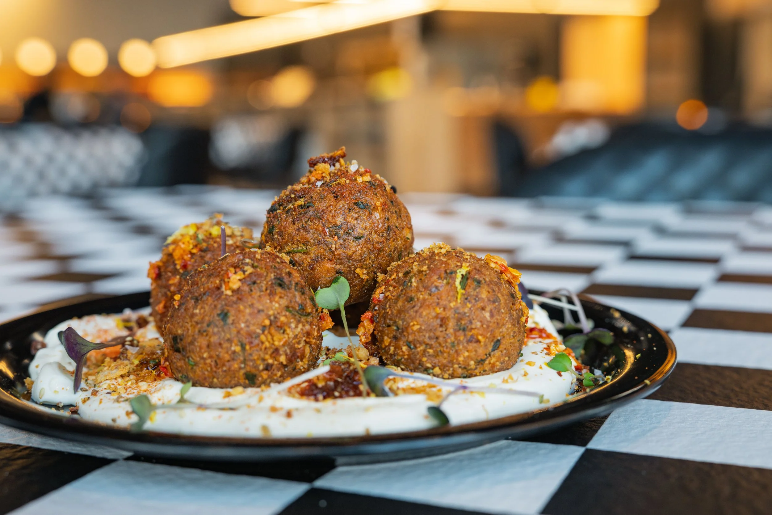 Black Eyed Pea Falafel, Buttermilk Culture Labneh, Dukkah, Sichuan Peppercorn-Calabrian Chile Oil, Lemon Zest, Radish Greens
