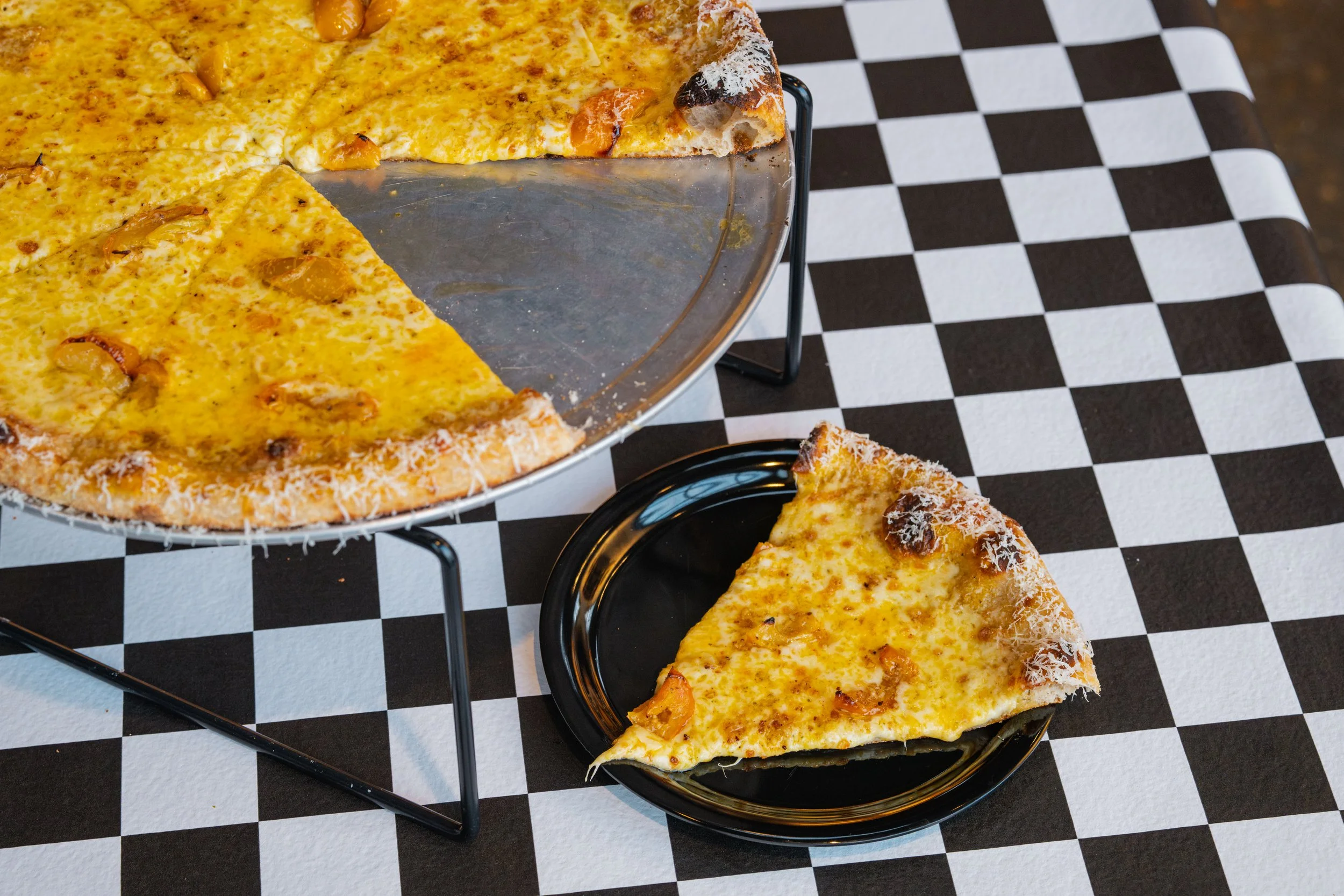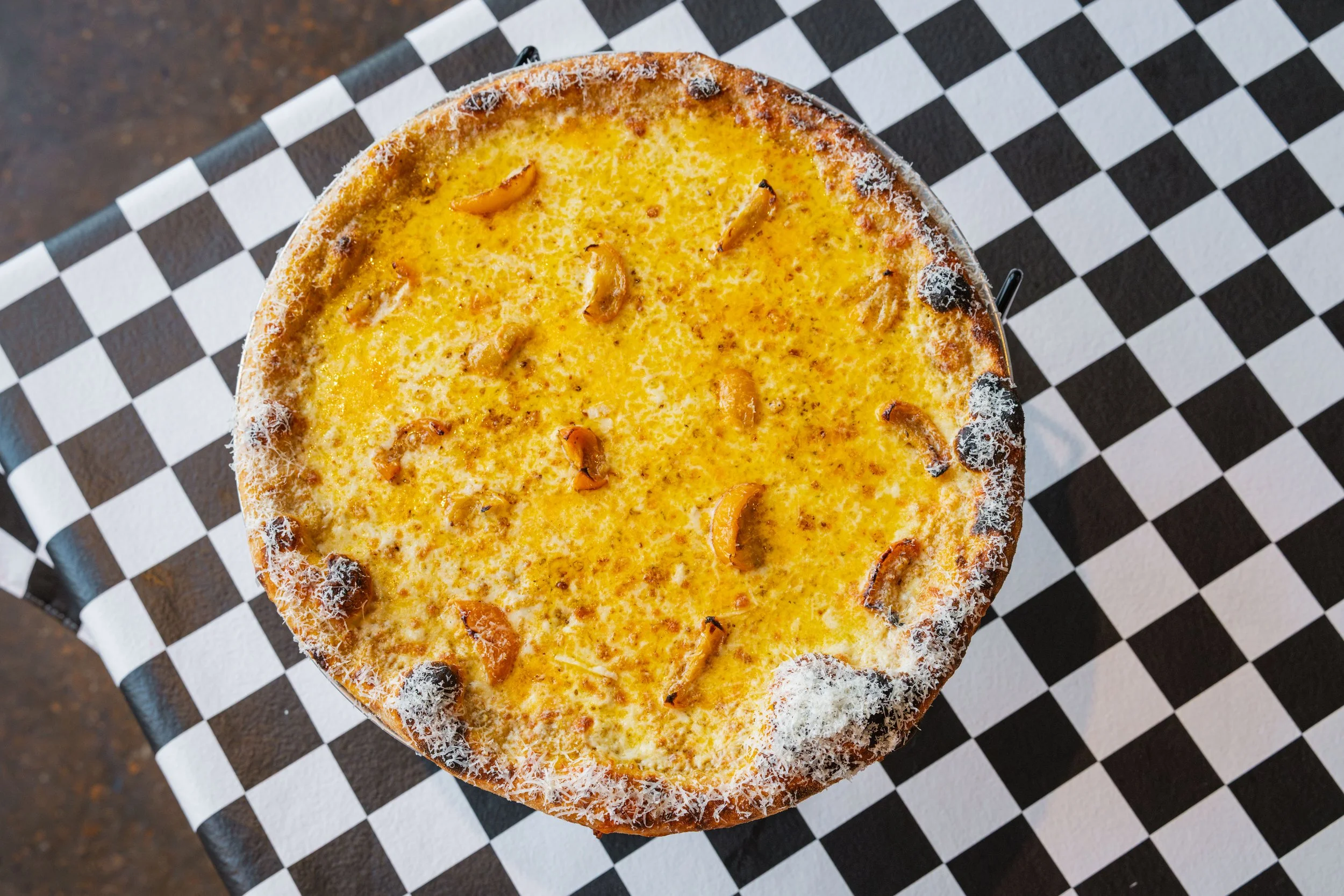 Giallo Pizza: Pepperoncini Pesto, Mozzarella, Yellow Cheddar, Roasted Yellow Tomatoes, Garlic, Saffron Breadcrumbs, Parmesan
