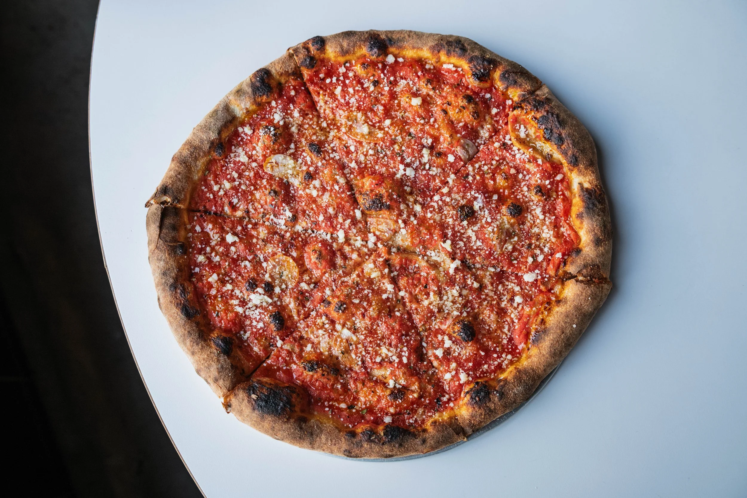 Tomato Pizza, Sliced Garlic, Pecorino Romano, Parmesan, Oregano