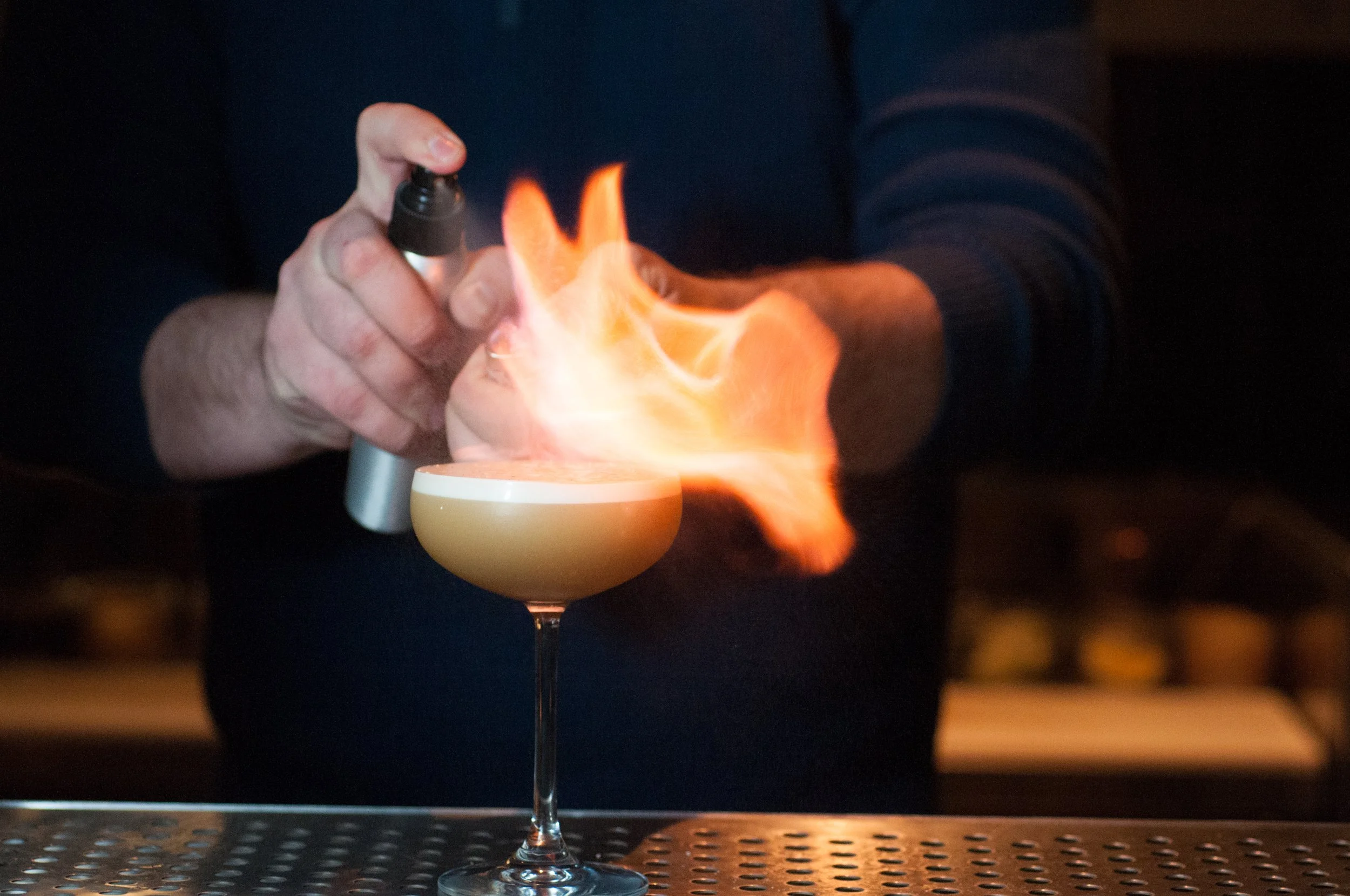 Hot Ale Flip: Lemon, Aquavit, Scotch Ale Syrup, Appleton Special Jamaican Rum, Lemongrass Tincture, Tahitian Vanilla Bitters, Eggwhite, Angostura Bitters, and Nutmeg