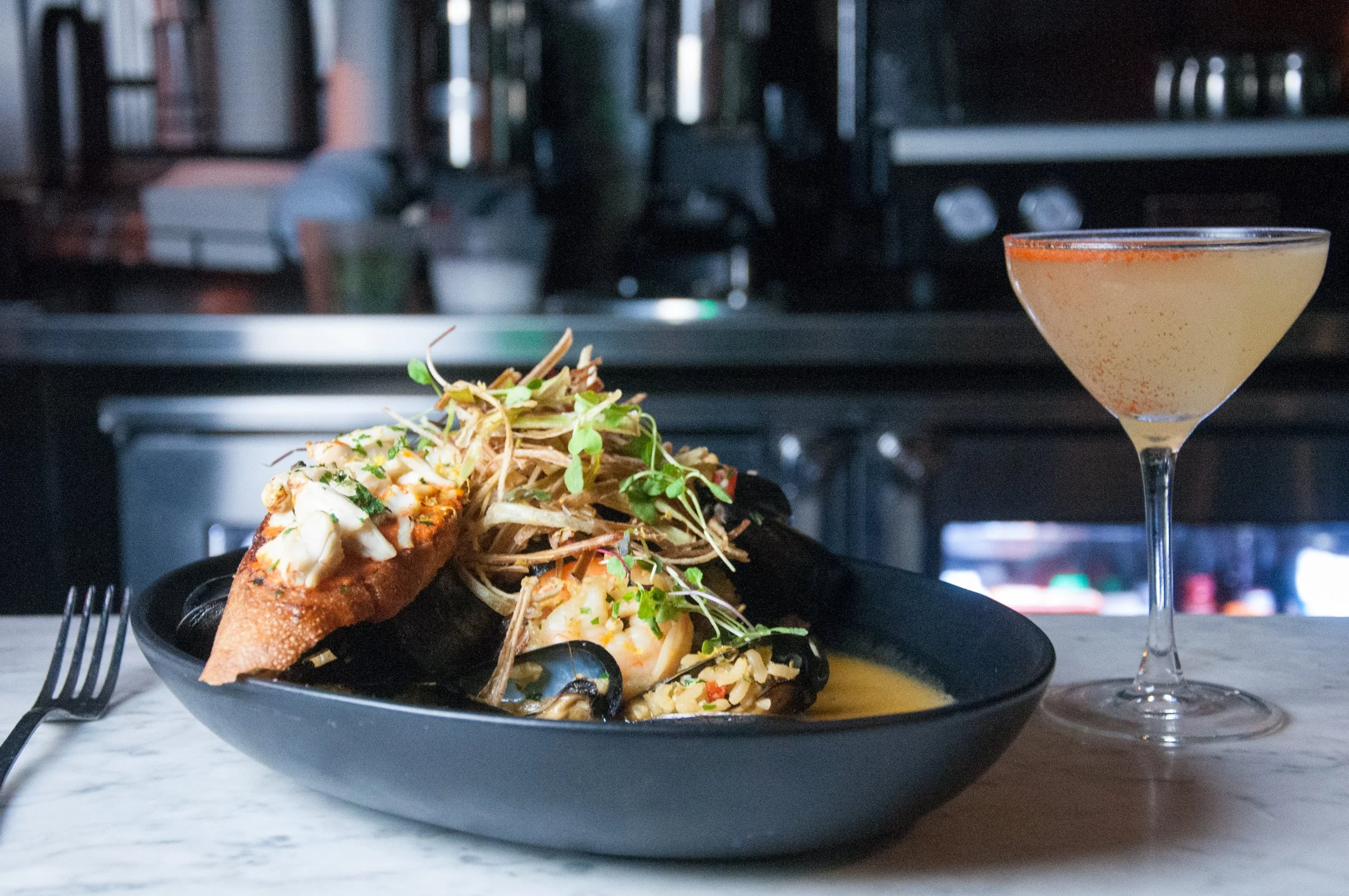 Paella: Chorizo, Mussels, Shrimp, Saffron, Arborio Rice, and Crab Crostini