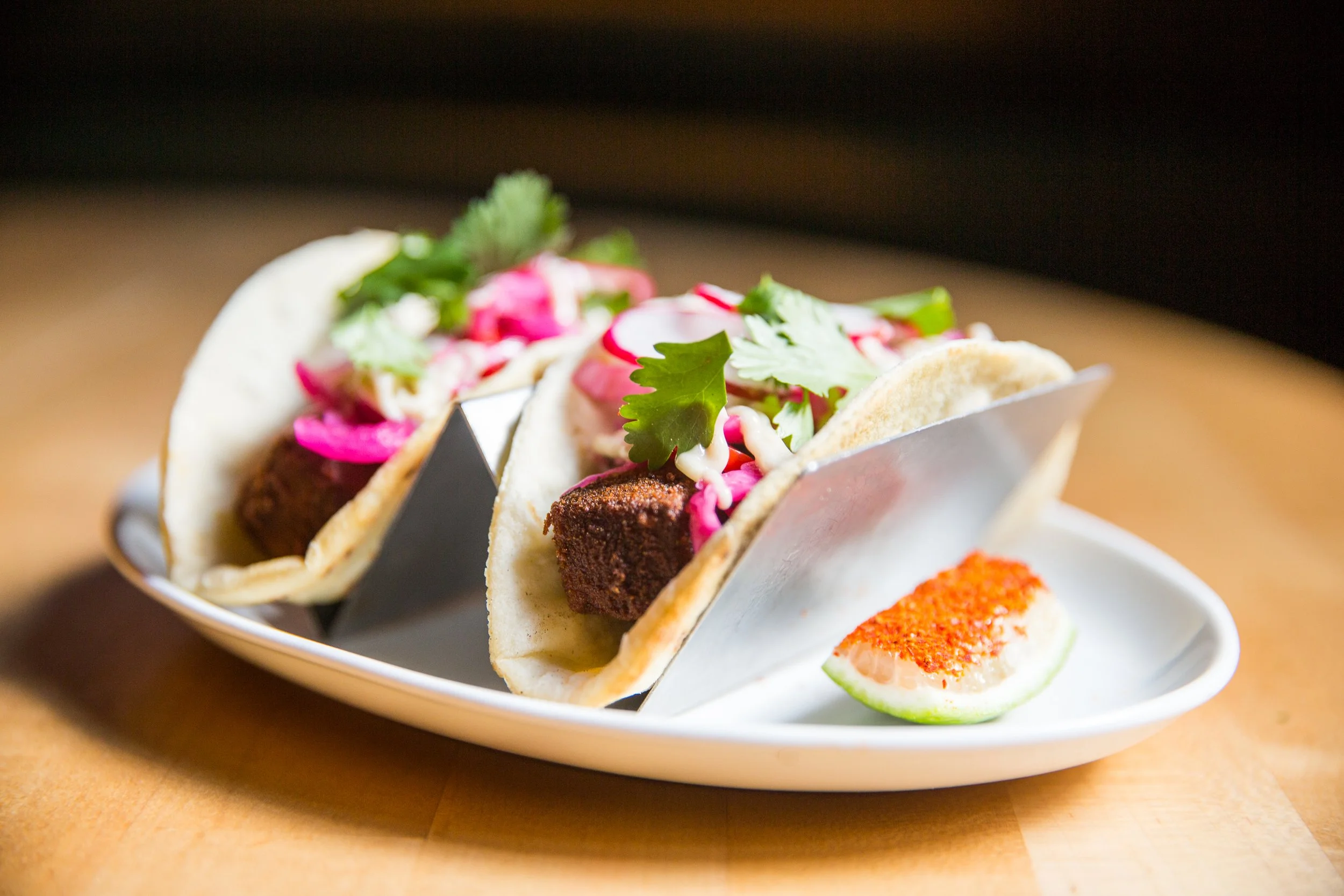 Veal Schnitzel Tacos, Anchovy Mayonnaise, and Health Salad
