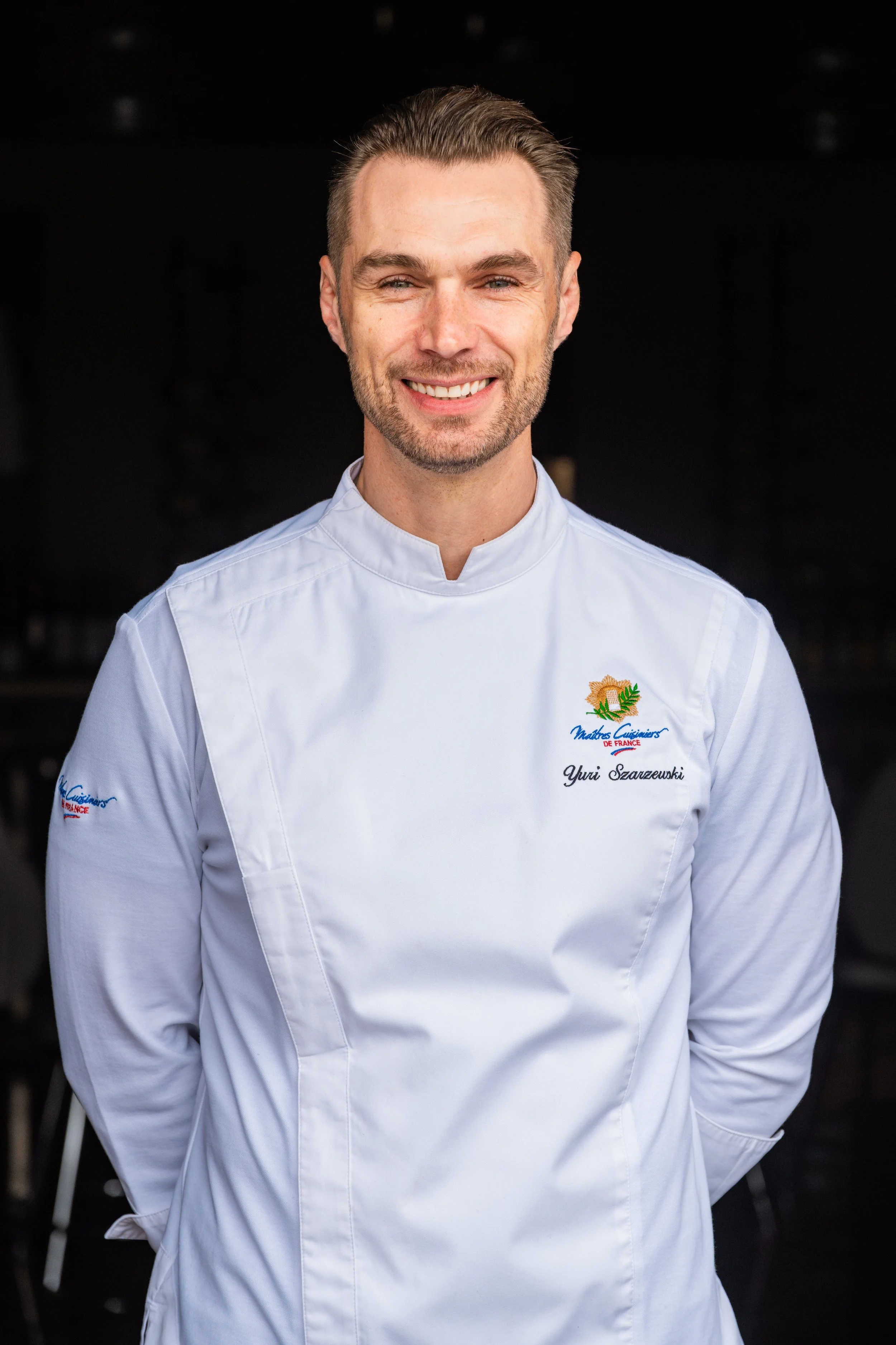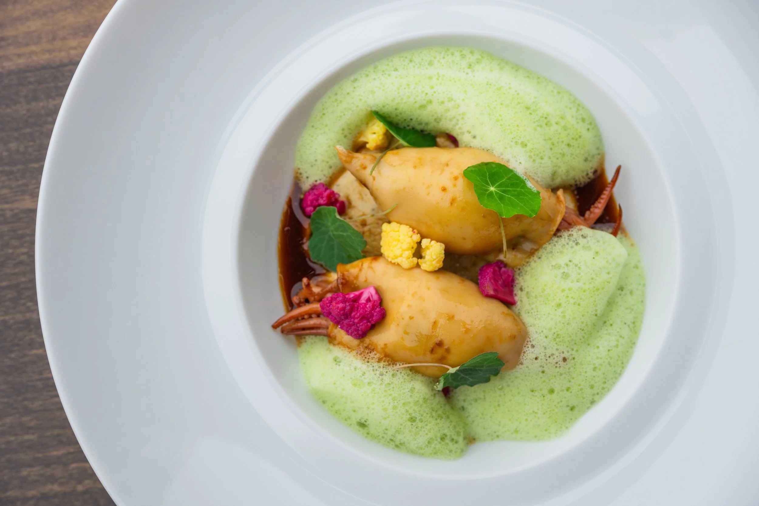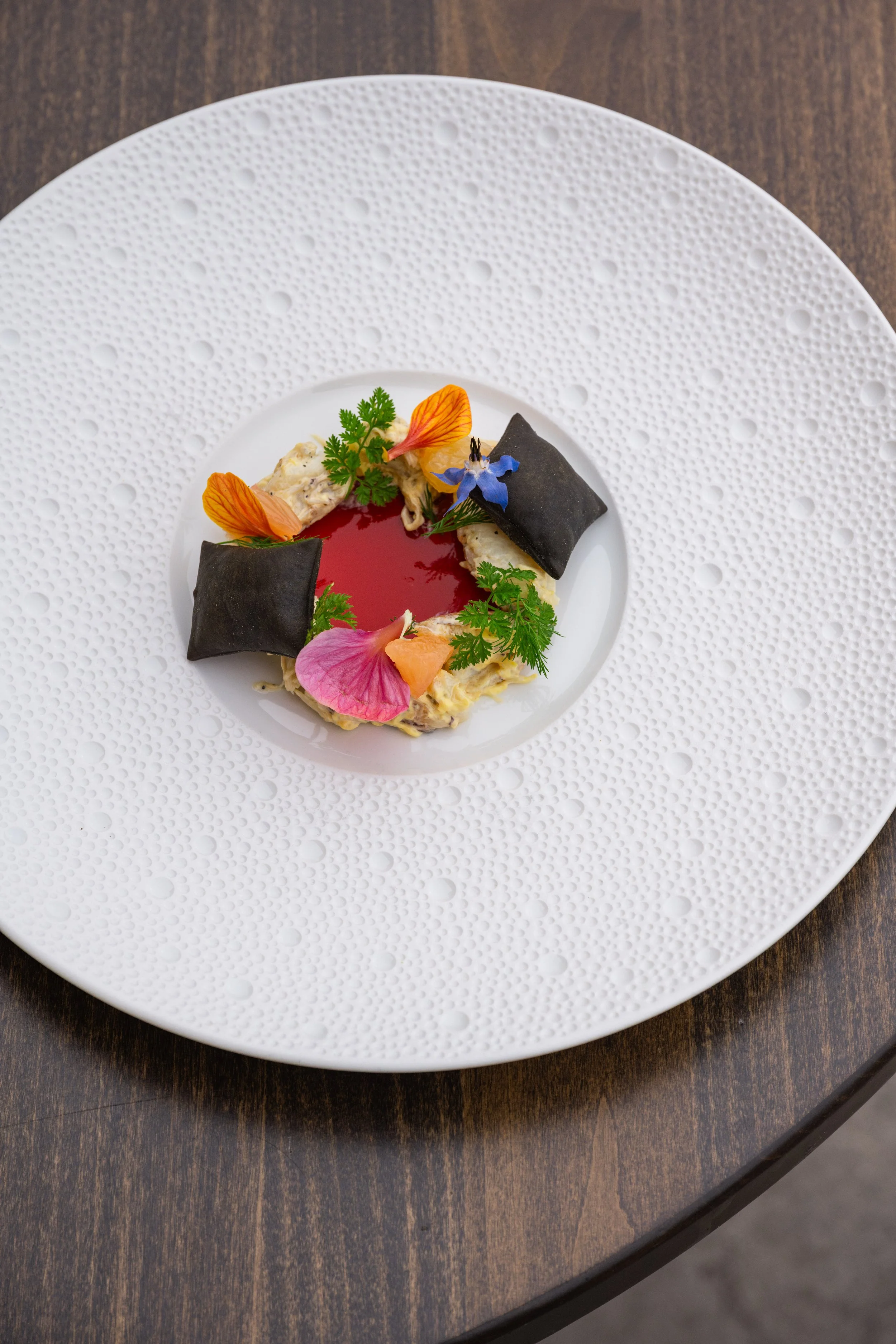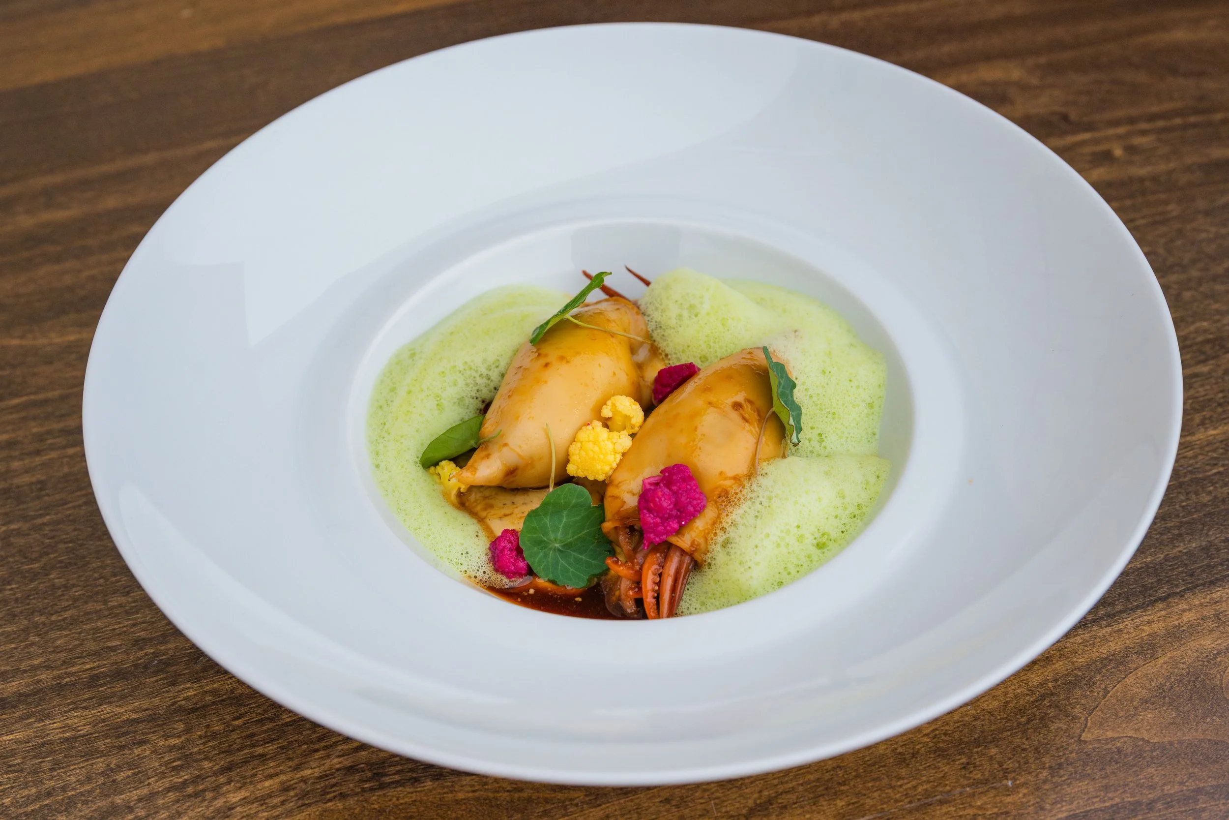 Wild Boar-and-Wagyu Stuffed Squid, Burnt Onion Purée, Pickled Rainbow Cauliflower, Tarragon Foam, Demi-Glace, Nasturtium Flowers