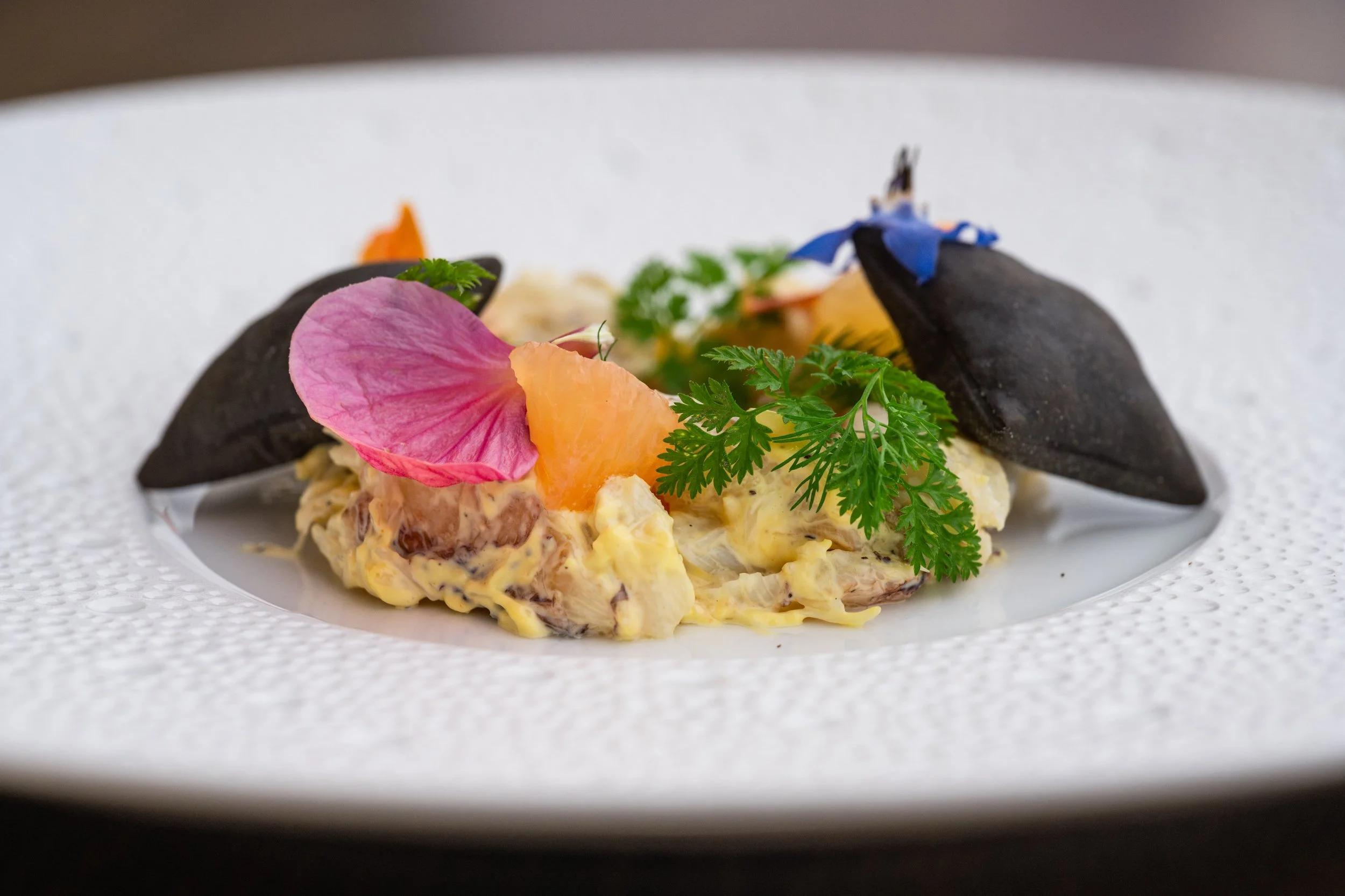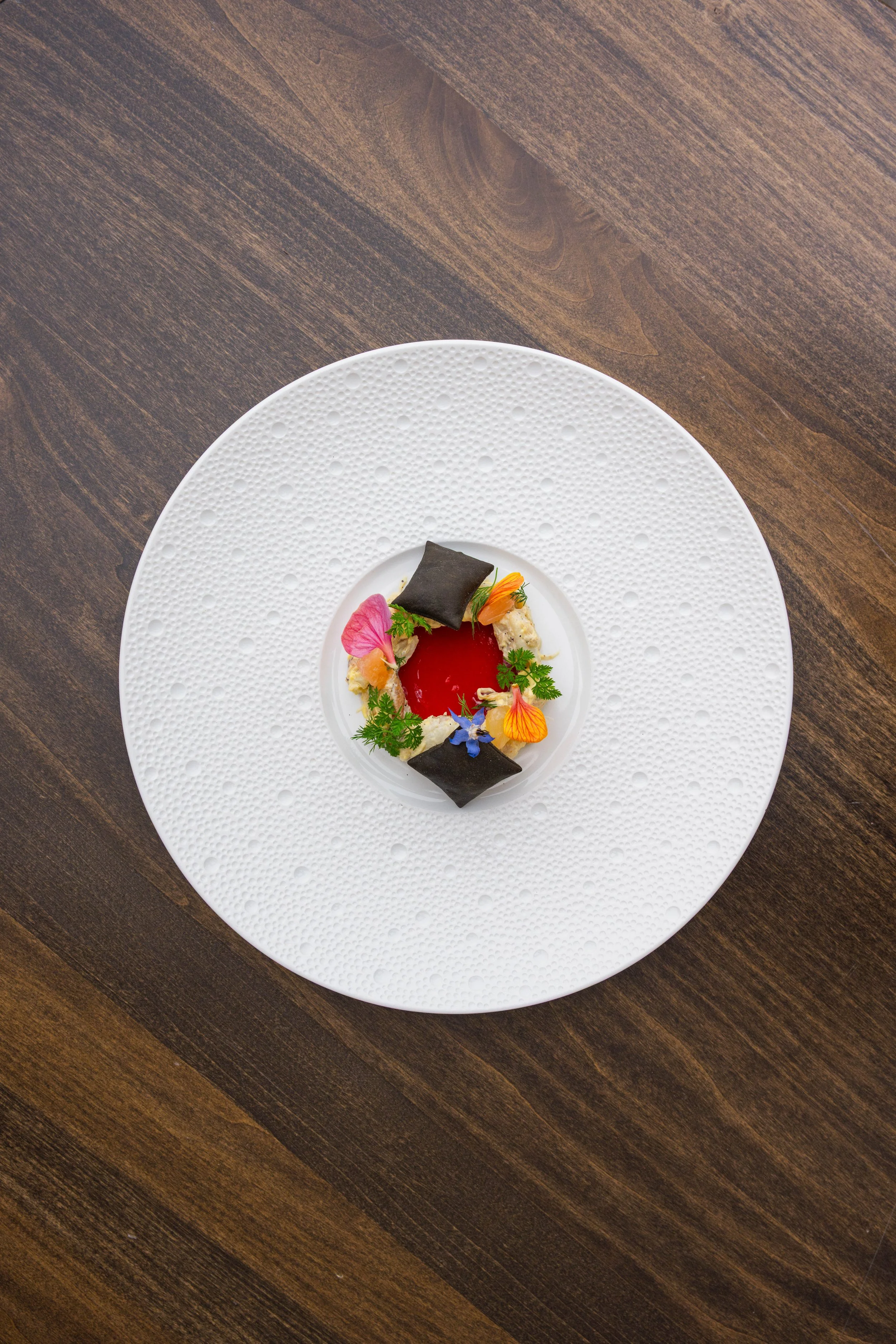 Crab Salad, Spicy Mayonnaise, Bottarge Chantilly, Grapefruit, Avocado, Hibiscus-Saffron Jelly, Chervil Dill, Hibiscus Flowers, Borage Flowers, Puffed Squid Ink Crackers