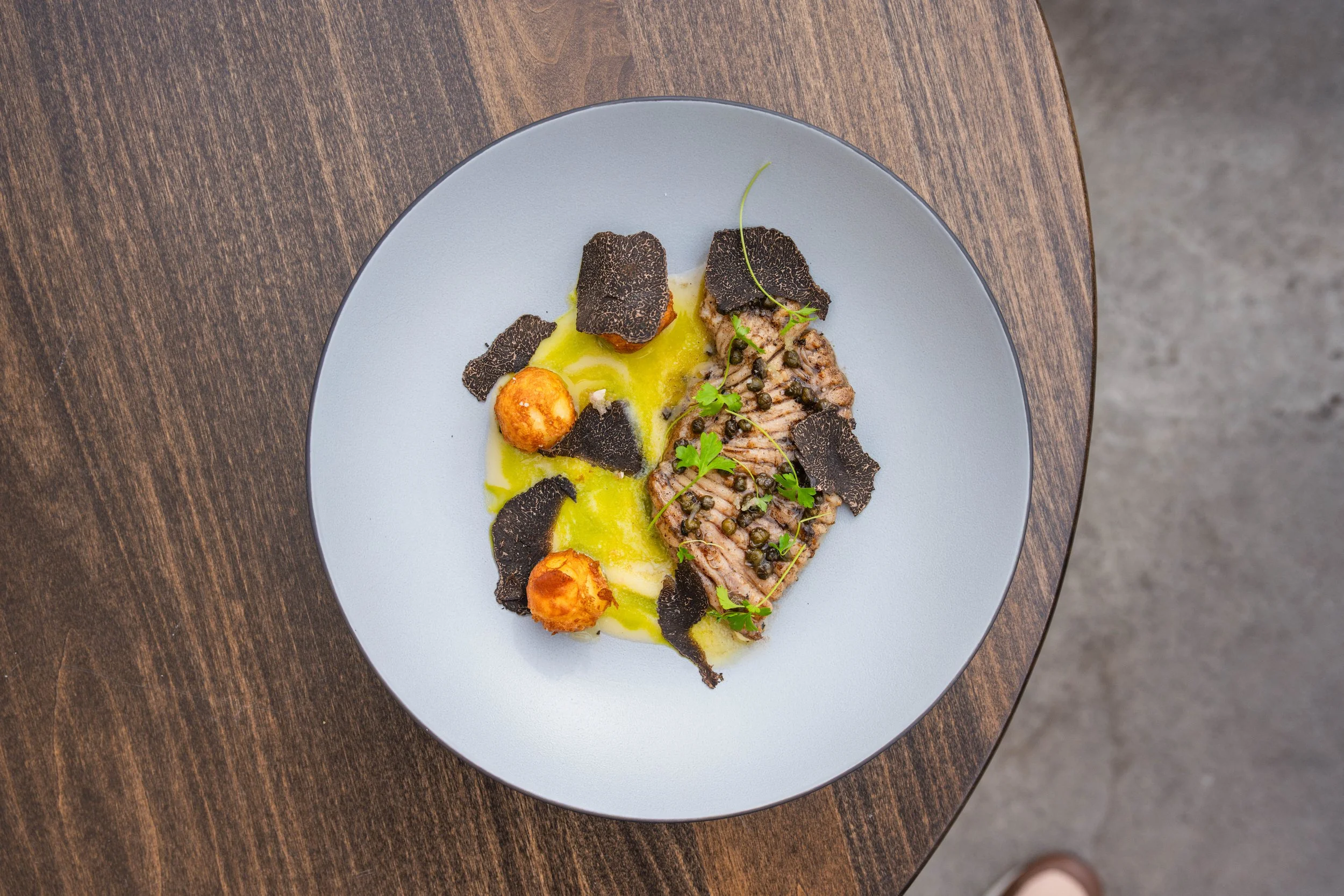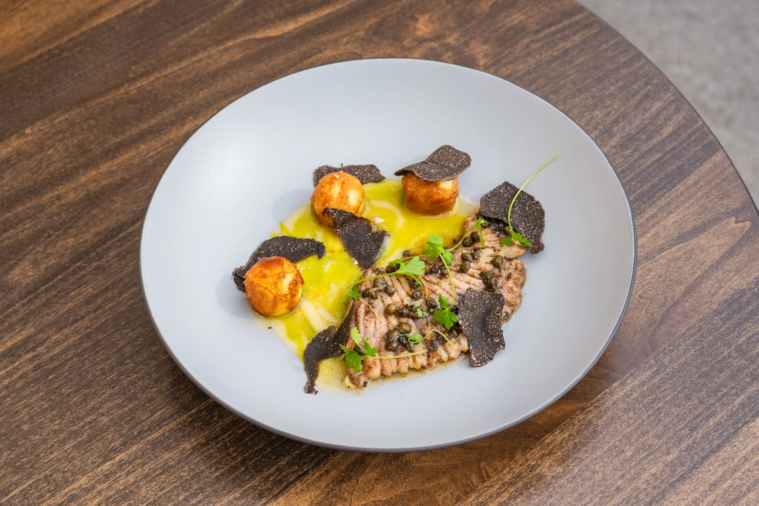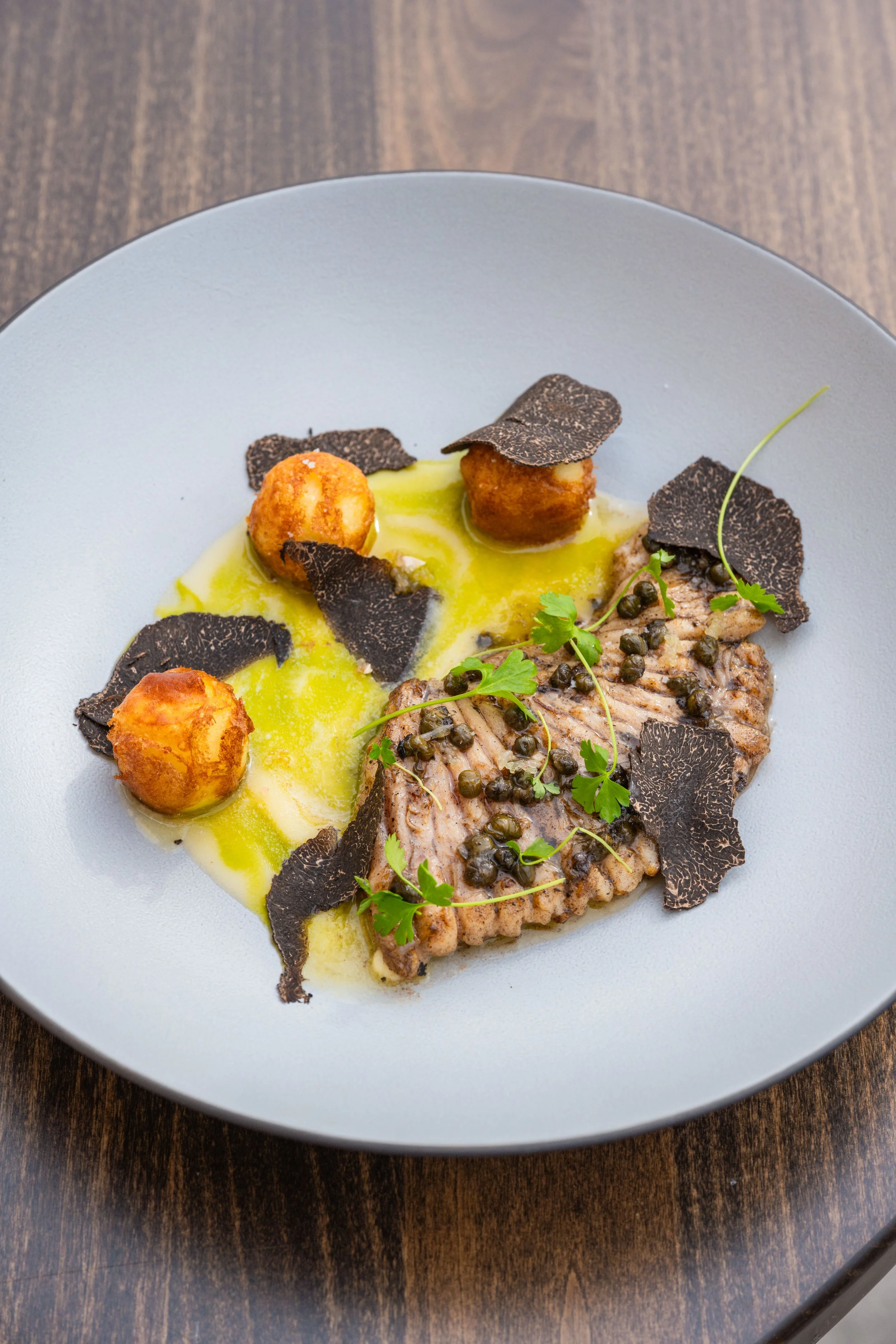 Meunière-Style Skate Fish, Pomme Dauphine, Fish Bone Beurre Blanc Reduction, Parsley Oil, Finger Limes, Shaved Black Truffles