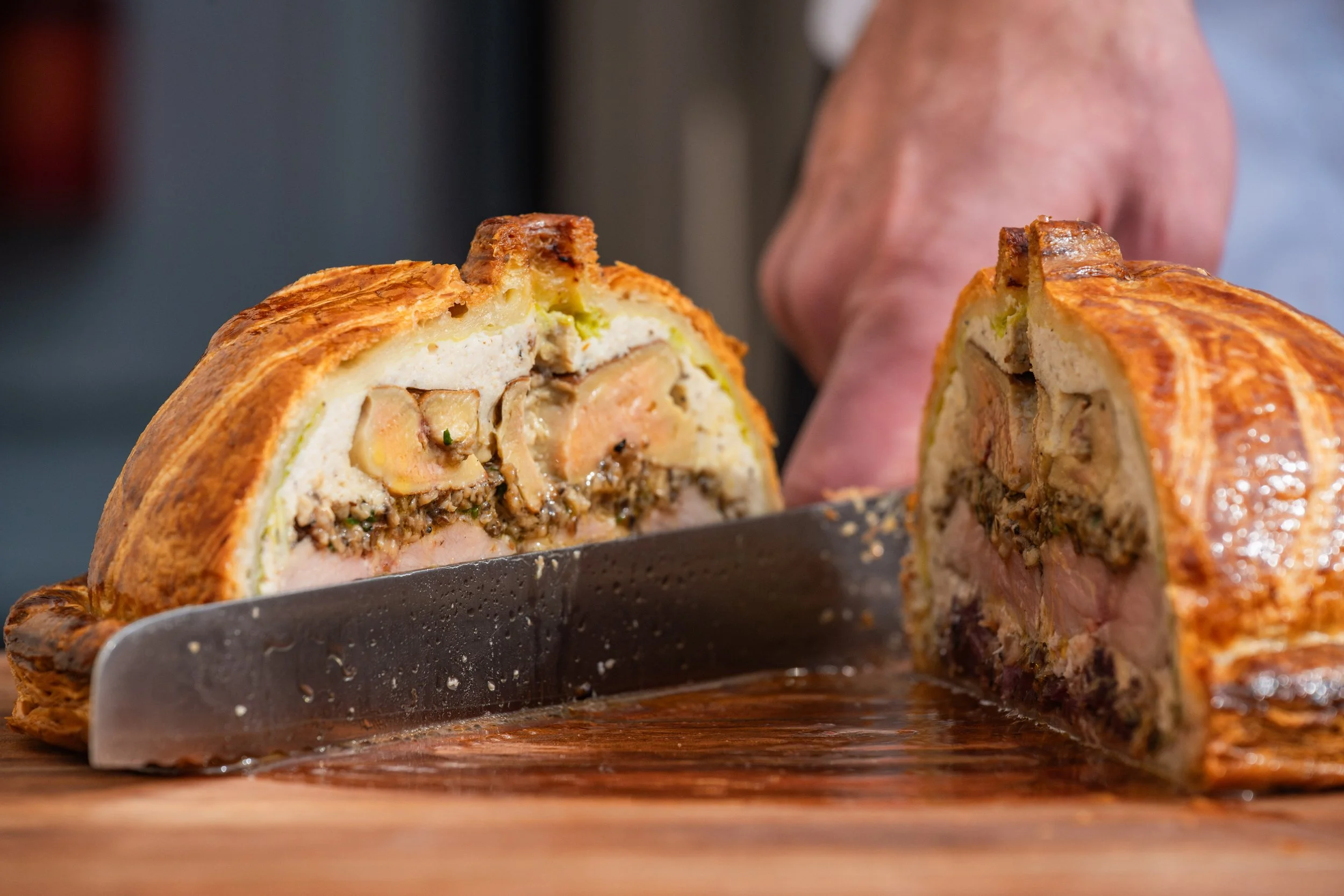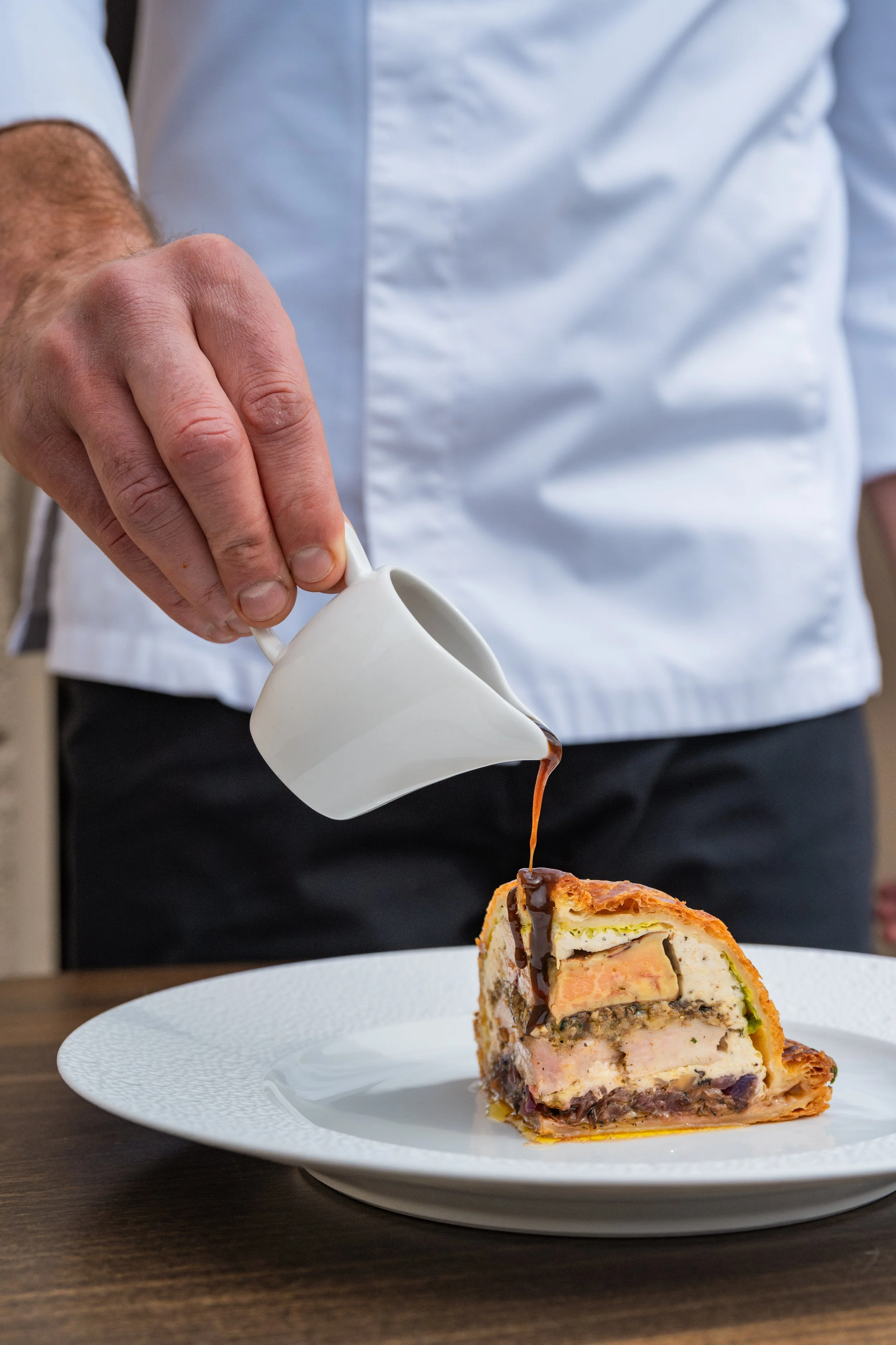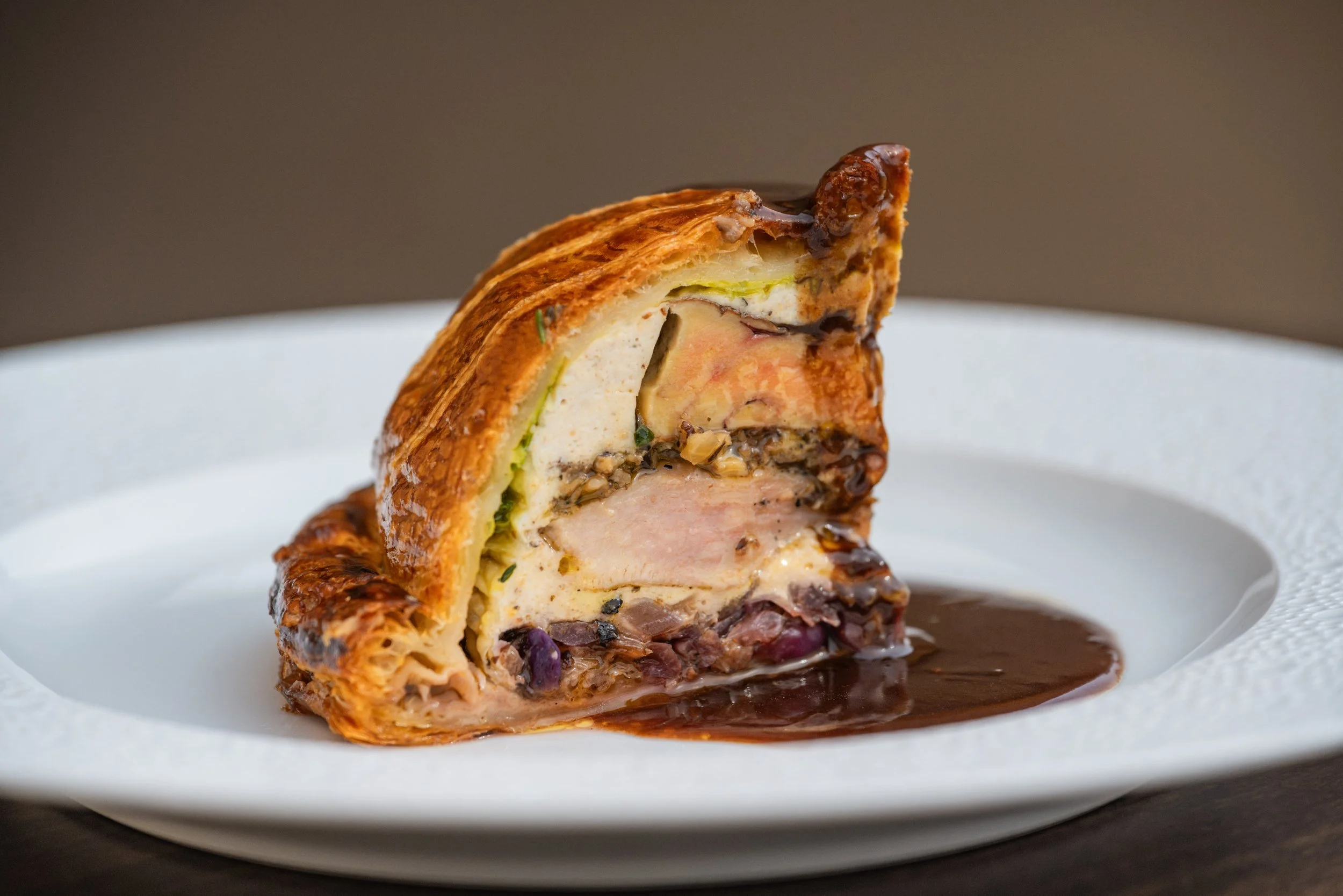 Duck Breast Pathivier, Seared Foie Gras, Mushroom Duxelles, Poultry Mayonnaise, Buttered Red Cabbage, Puff Pastry, Duck Jus