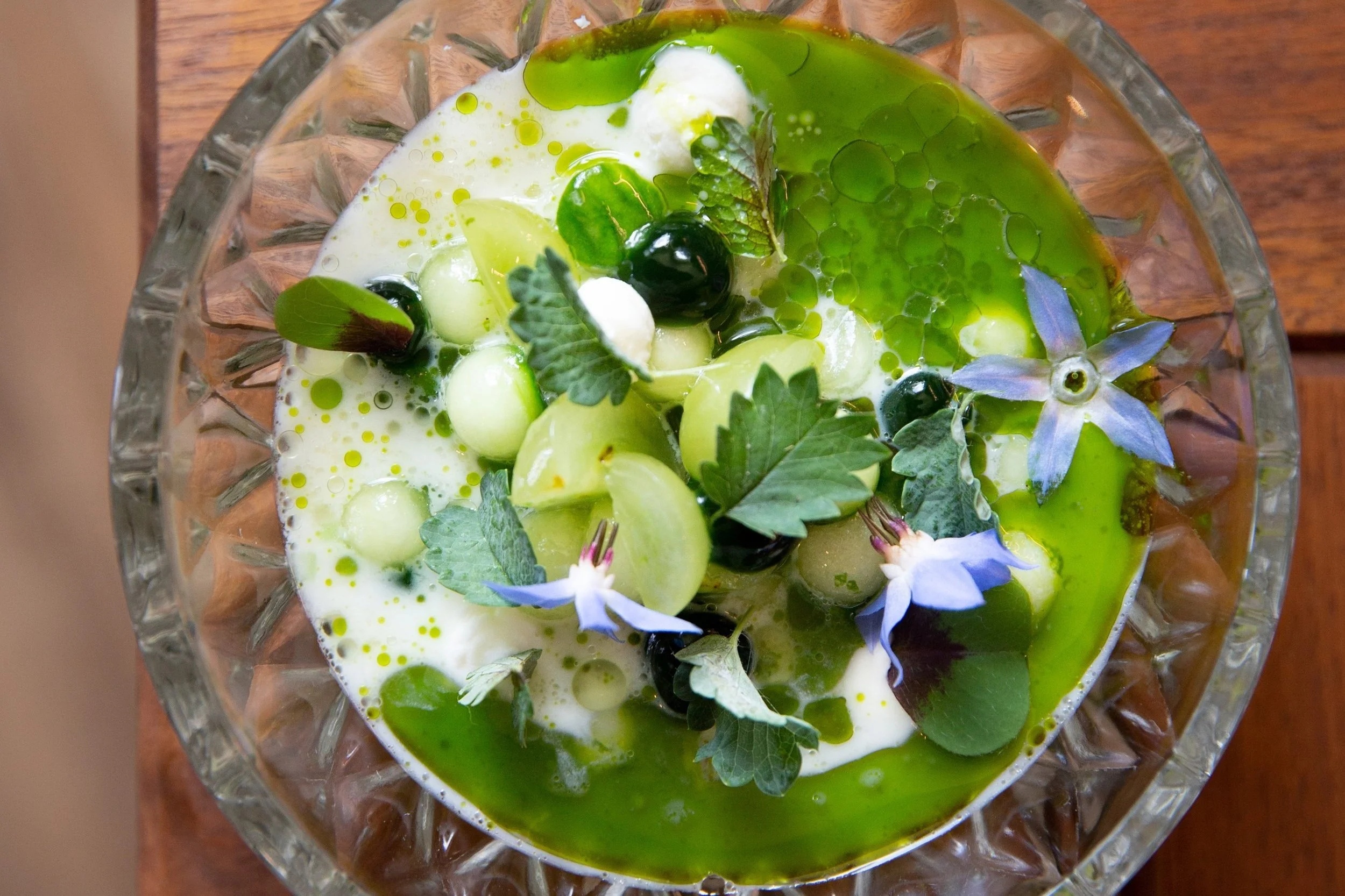 Melon, Cucumber, Almond Milk, Garlic, and Dill Oil