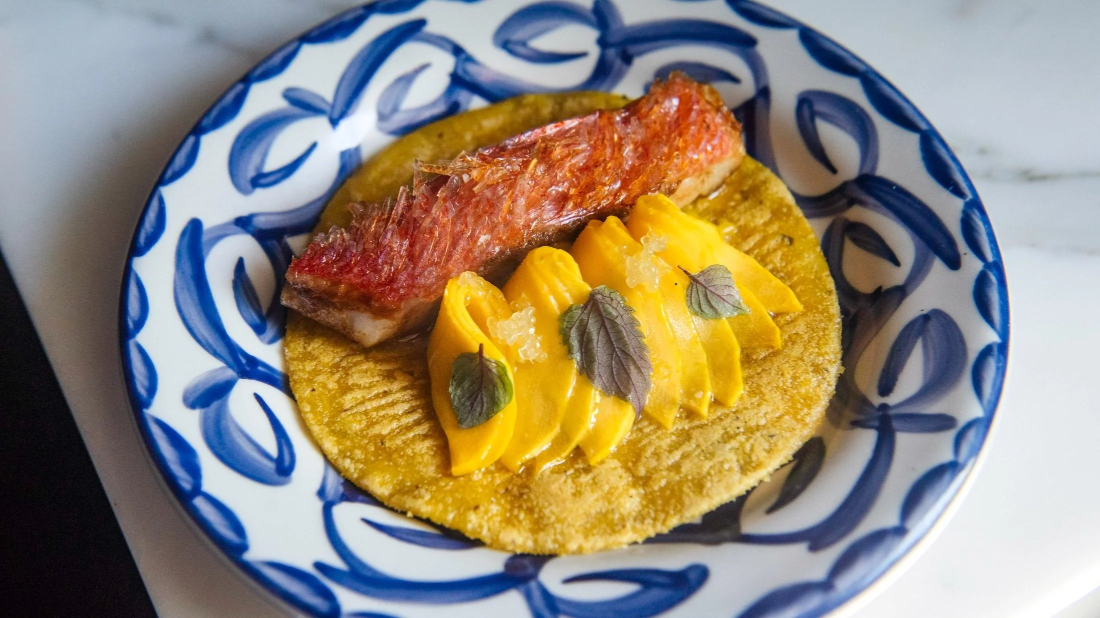 Prepare and heat a grill. In a sauté pan over medium flame, heat oil to just before the smoke point. Working in batches, add Alfonsino fillets, skin-side down. Cook 10 seconds, gently pressing with a spatula. Using tongs, transfer the fish to the grill, flesh-side down. Cook until the internal temperature reaches 120°F. Meanwhile, in a comal over medium heat, add Hickory King Tortillas, working in batches if needed. Cook until the first side has changed from pale to golden yellow. Flip and cook an additional 30 to 45 seconds. Remove from heat and set aside. Remove Alfonsino fillets from grill. Avoiding the skin, season the flesh with lime, olive oil, and sea salt. Set aside. Distribute Hickory King Tortillas onto 8 serving plates. On the center of each Hickory King Tortilla, add a large spoonful of Green Mango Salsa. On the right side, place 4 slices mango shaped into a fan. Garnish the mango with Pickled Red Pearl Onions, micro shiso, and finger lime. Place 1 portion Alfonsino to the left of the mango, flesh-side down. Serve immediately.
