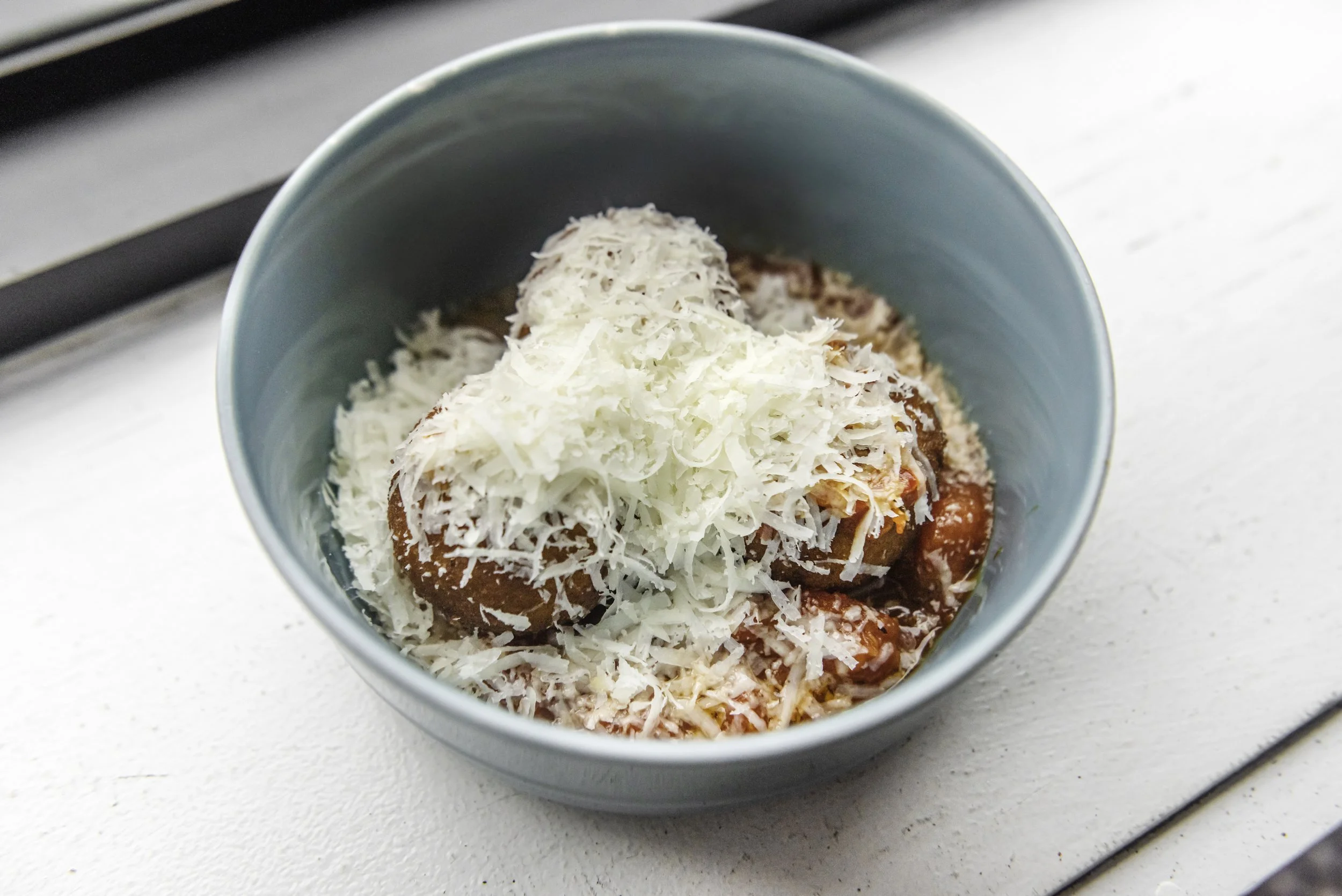 Coat the bottom of a serving bowl with Tomato Sauce. Top with a few Risotto Balls and garnish with some Calabrian chiles and a generous amount of Asiago.