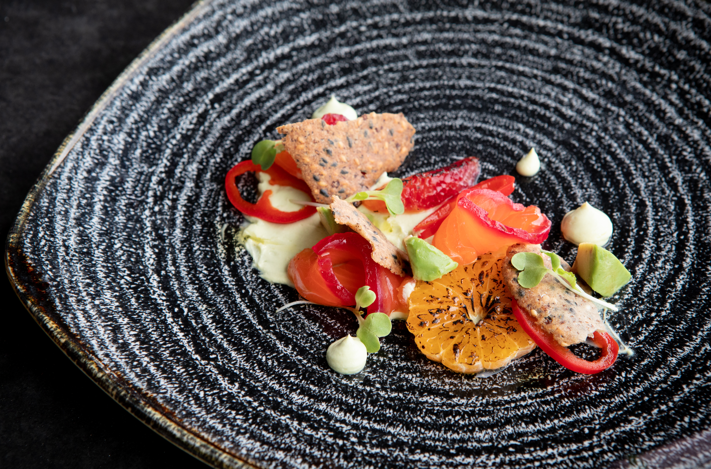 Spread the Avocado-Goat Cheese Spread onto the Rice Cracker. Top with sliced Salmon. Torch citrus and place two pieces on Salmon. Garnish with pickled chiles and micro greens.