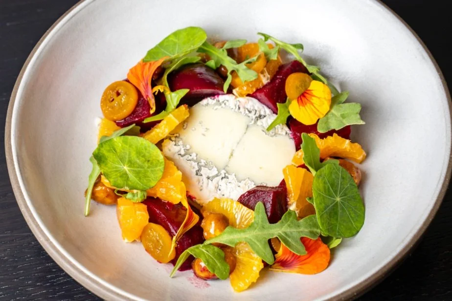 “This farmers market-inspired salad uses ingredients sourced from our partners at the Santa Monica market along with a mixture of seasonal citrus that we pick weekly and a nasturtium pesto that is made from nasturtium that is planted in our own backyard. The sharpness of the pesto pairs well with the creaminess of the Humboldt Fog goat cheese and the citrus finish from the cheese complements the earth, sweet beets. We finish the dish with a drizzle of honey to bring some additional sweetness that ties all of the flavors and components together.” — Chef Cynthia Hetlinger
