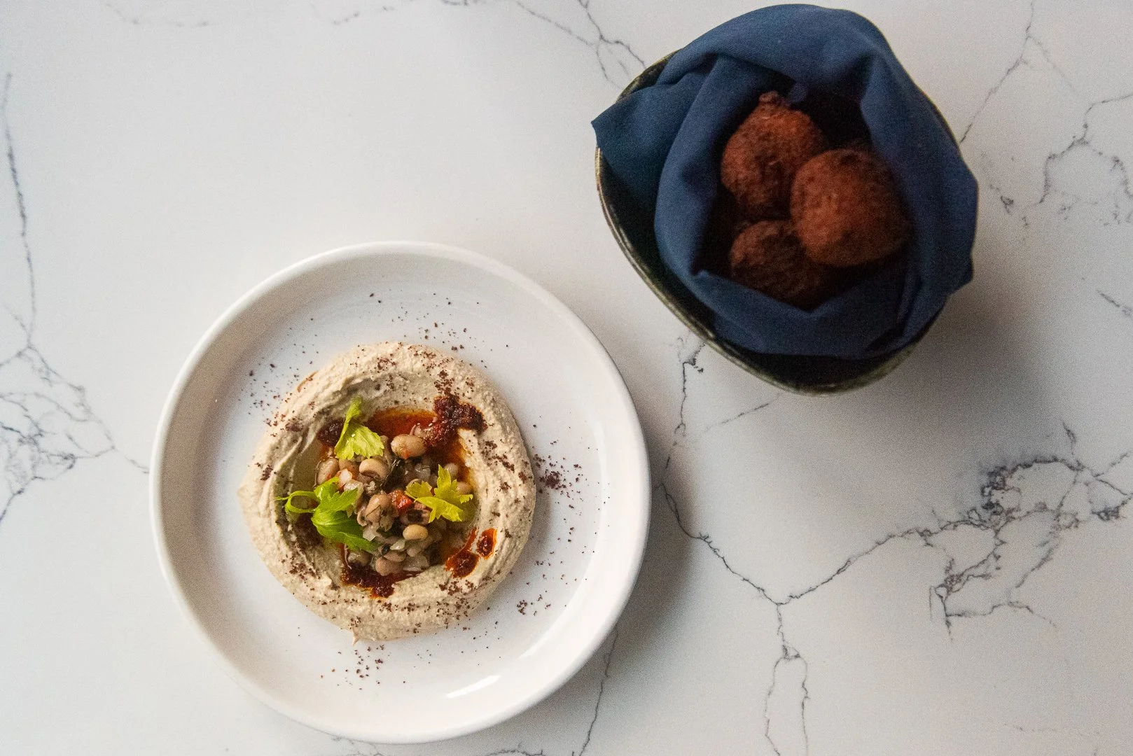 In a mixing bowl, dress Black-Eyed Pea Salad with Sherry Vinaigrette. Smear 1 cup Black-Eyed Pea Hummus in a 3-inch circle in the center of a serving plate. Be sure to angle the spoon at a 45° angle to create a crater-like appearance. Using a perforated spoon, add 2 tablespoons Black-Eyed Pea Salad to the center of the circle. Be sure to strain most of the Sherry Vinaigrette so the hummus does not become too wet. Spoon xo chile and olive oil over top, letting it fall to the sides of the plate. Sprinkle with a pinch of sumac and garnish with celery leaves. Serve 5 Akara Fritters on the side for scooping.
